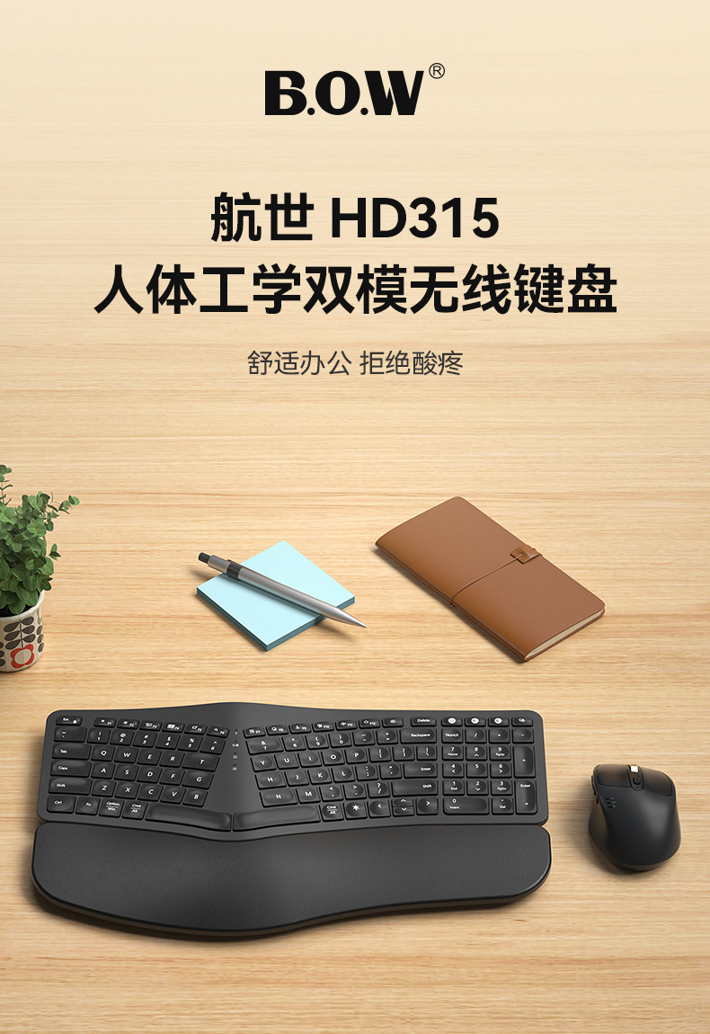 BOW Hangshi HD315B 인체공학적 백라이트 충전 듀얼 모드 Bluetooth + 2.4G 손목 보호 키보드스토어 가기