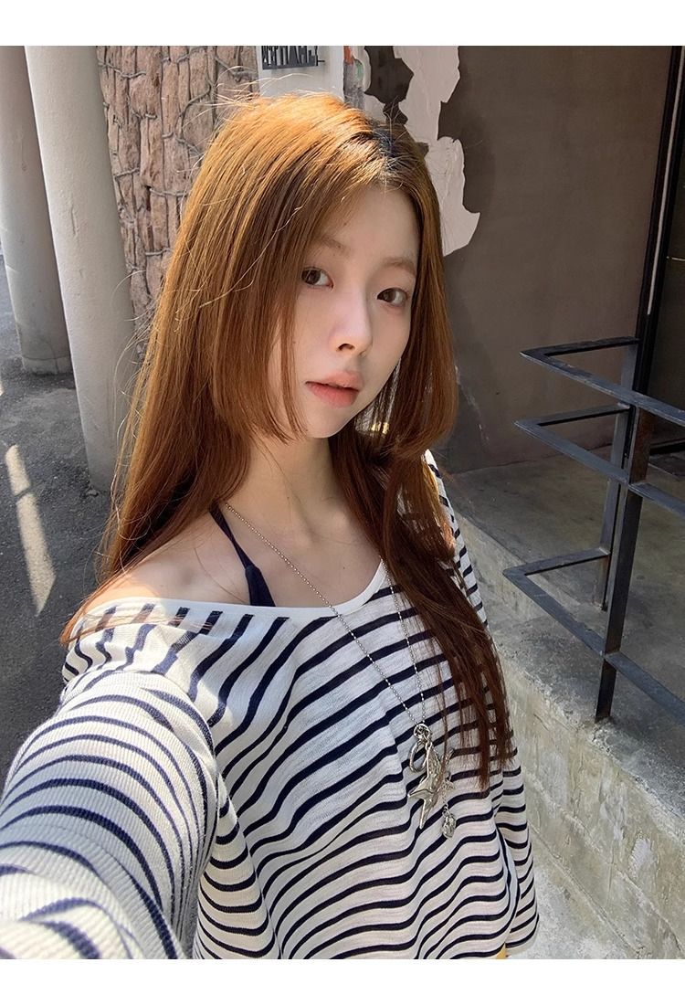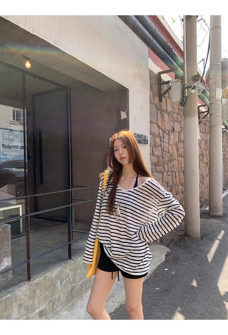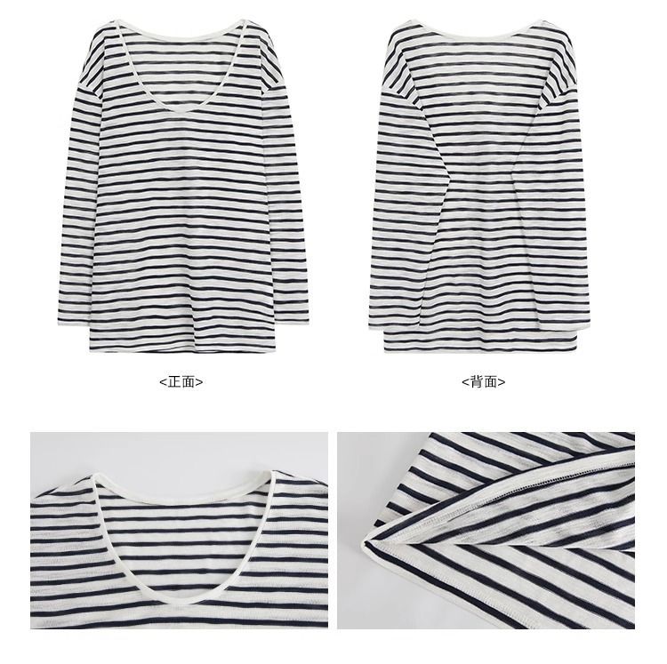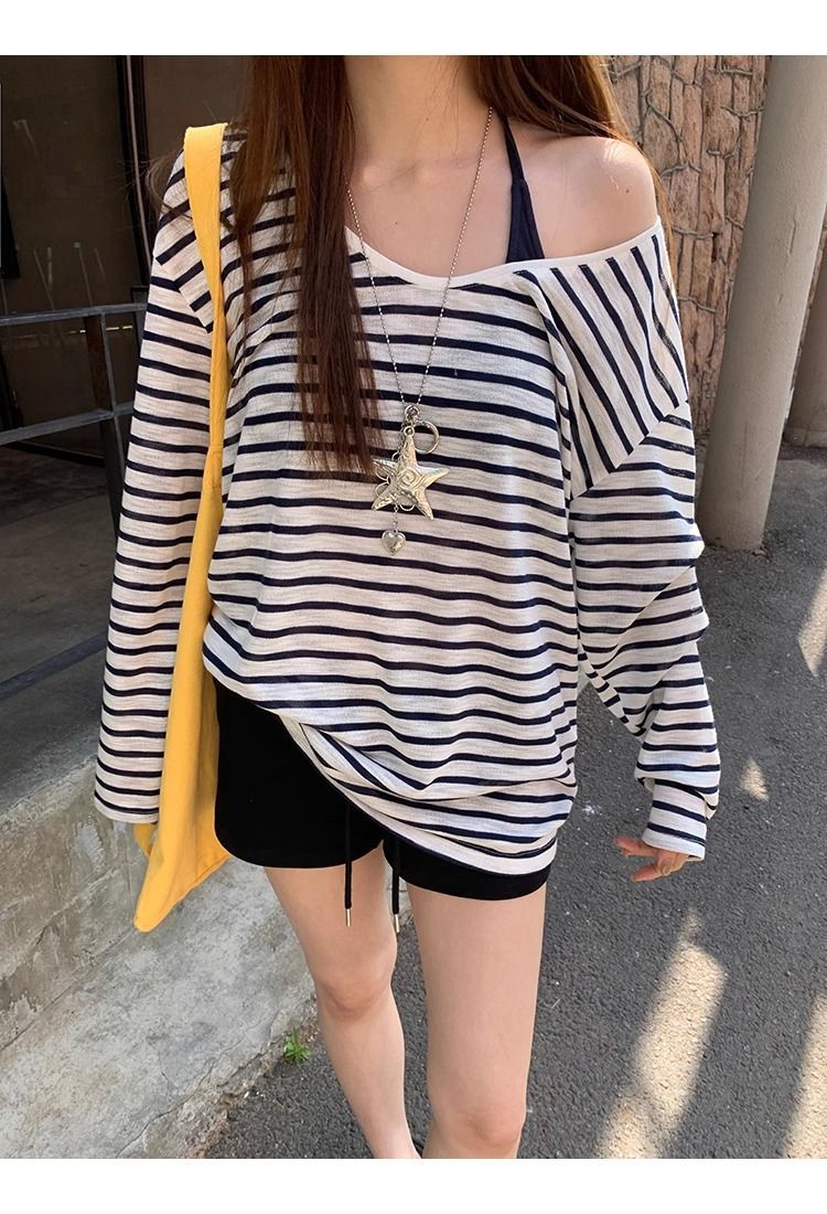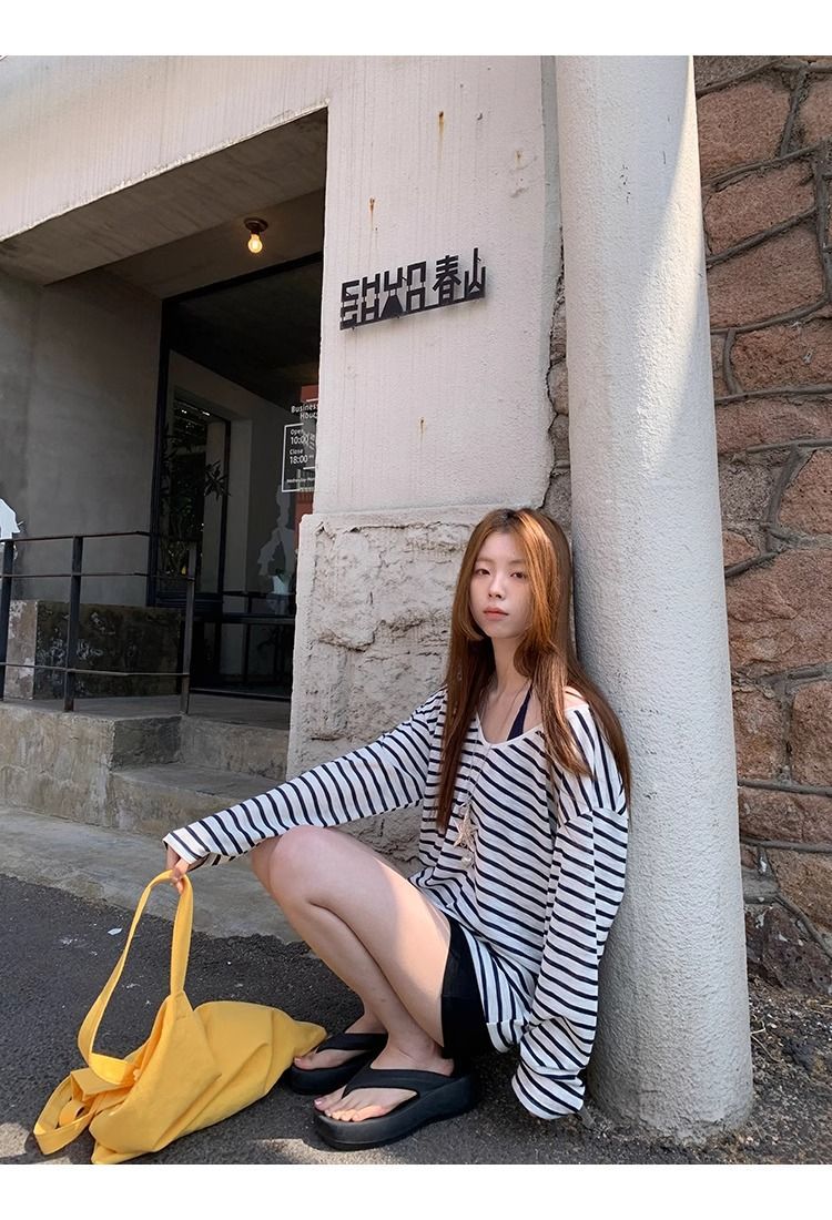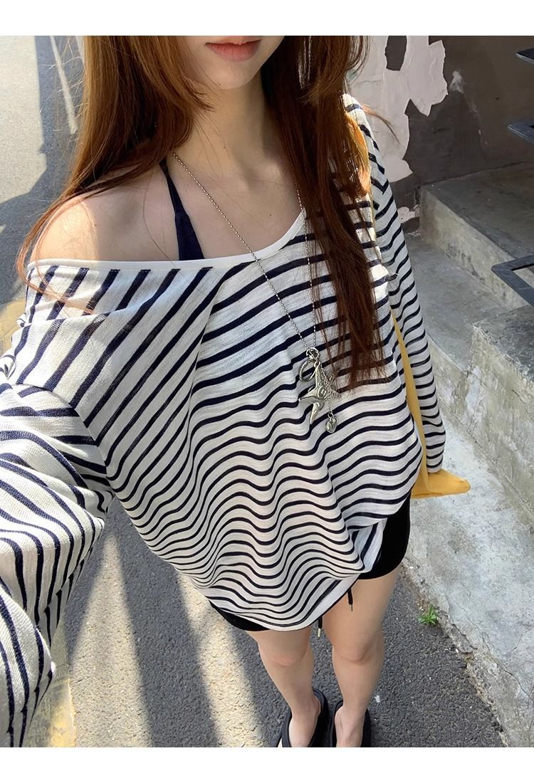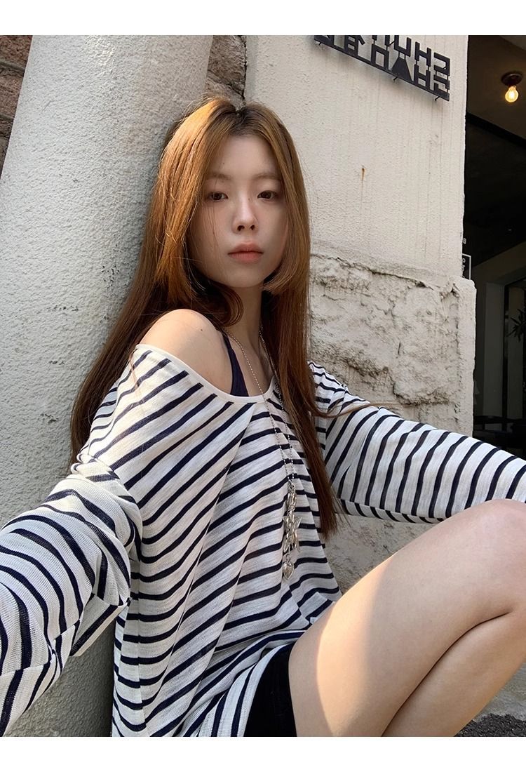 여성용 자외선 차단 커버업 셔츠, 여름 OOTD 스타일, 2026년 신상 긴팔 티셔츠, 여성용 루즈핏 스트라이프 어깨트임 탑 도매스토어 가기