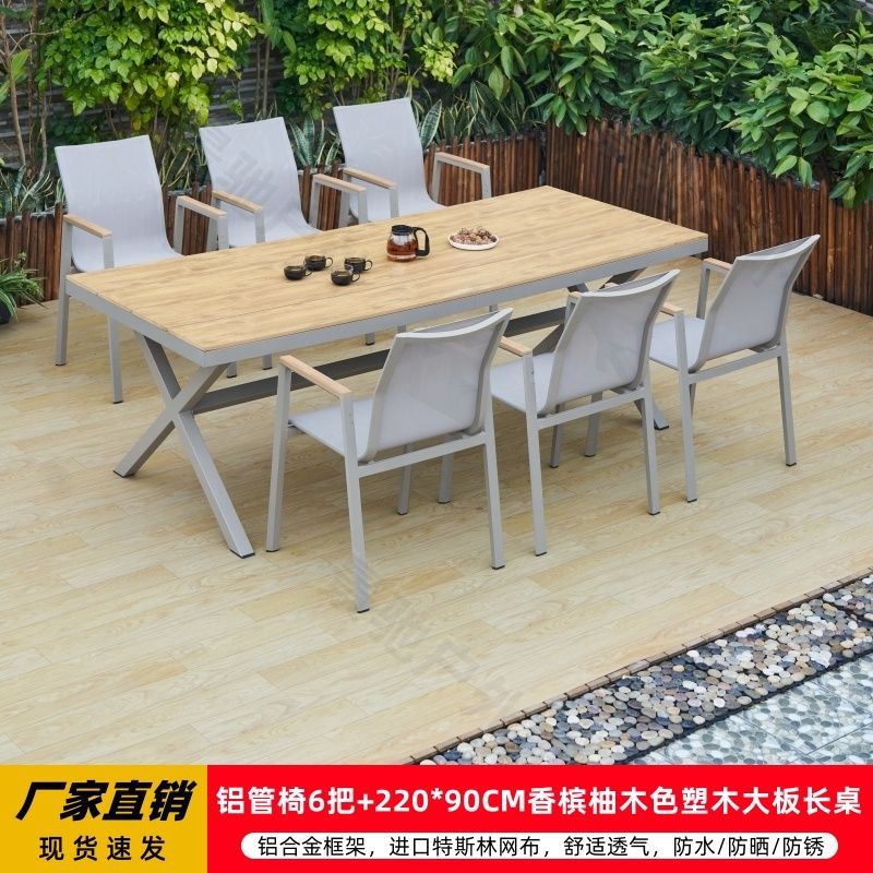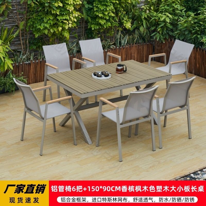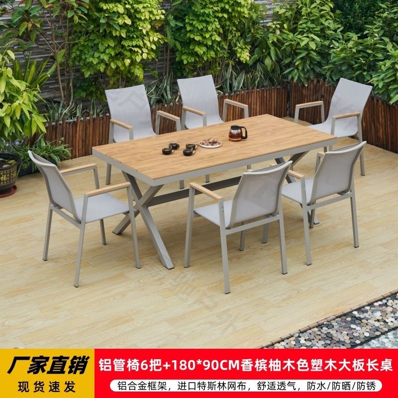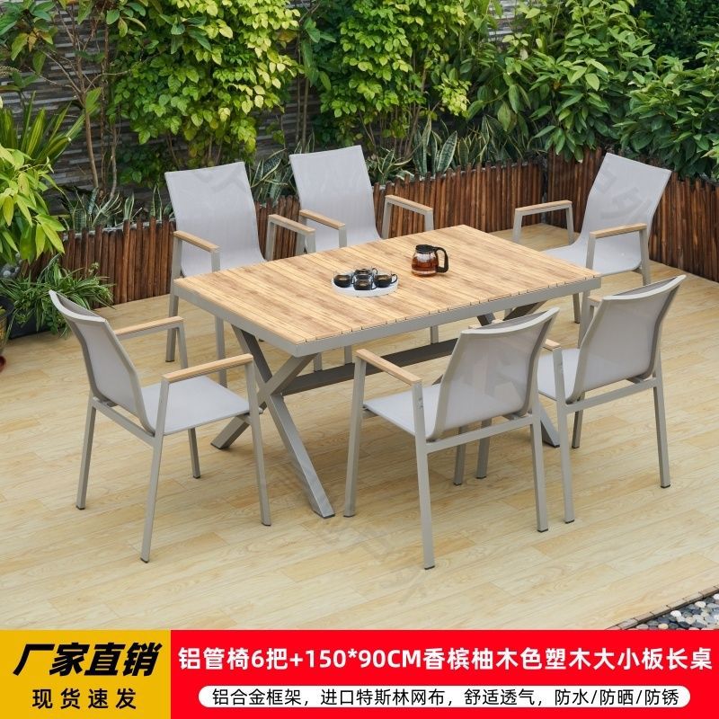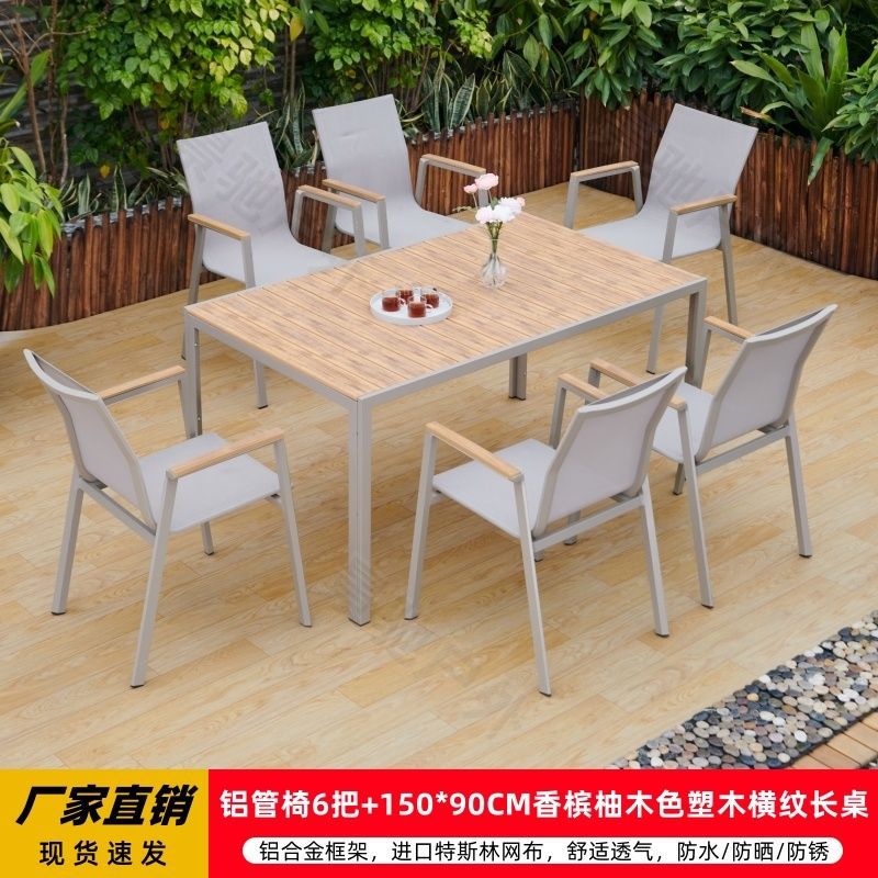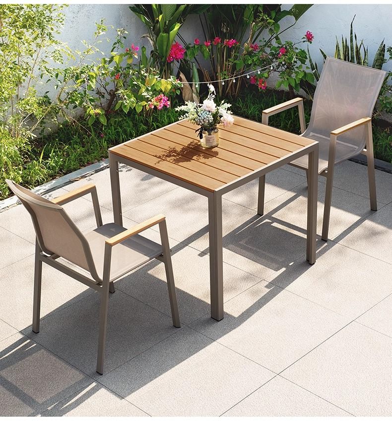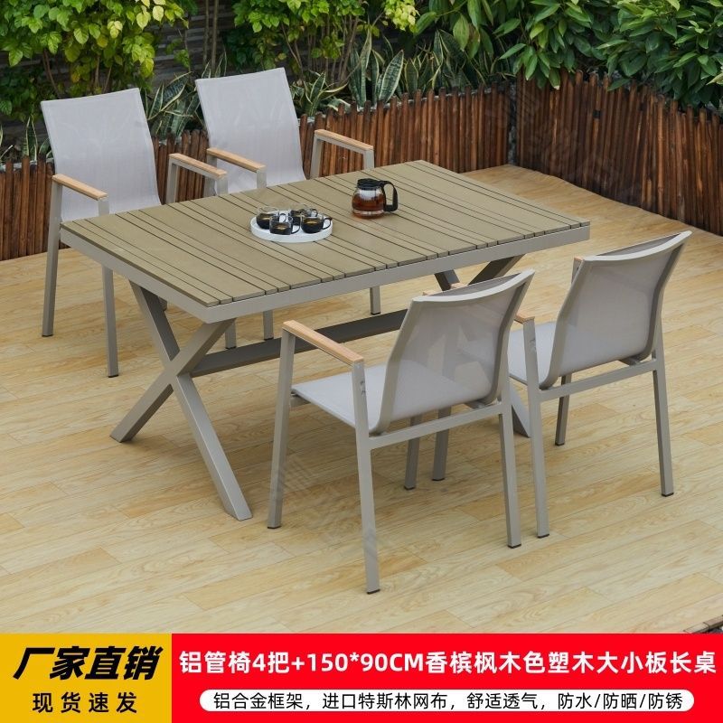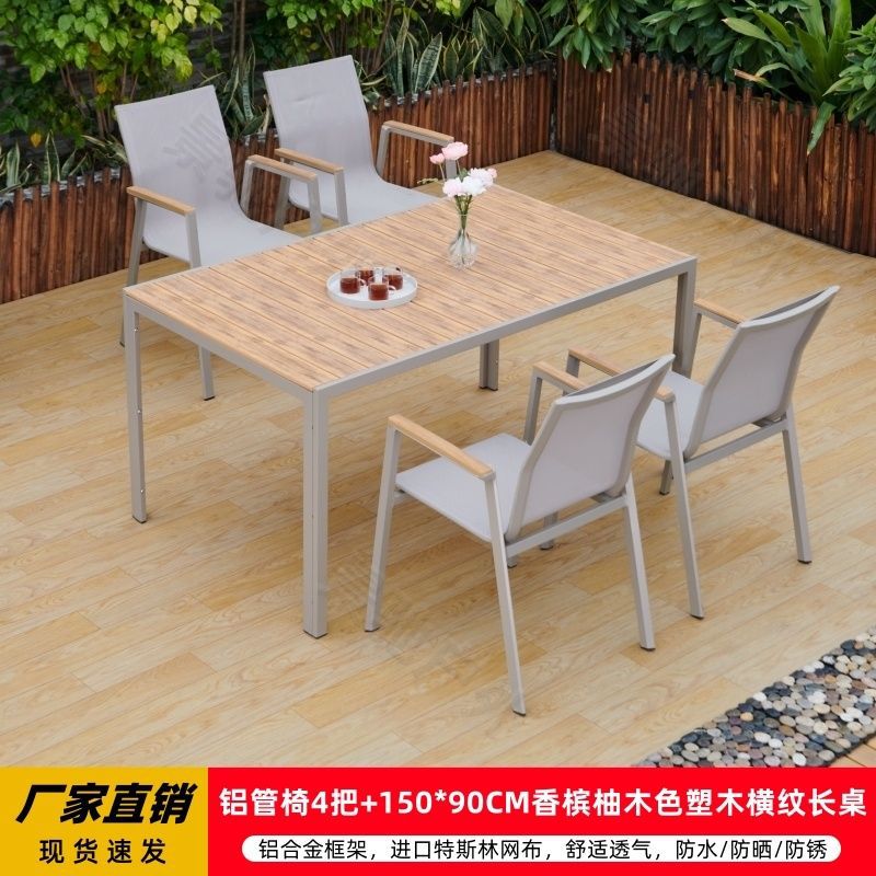 야외 안뜰 테이블과 의자 알루미늄 합금 야외 레저 플라스틱 목재 식탁 테라스 빌라 정원 부식 방지 목재 테이블과 의자 조합