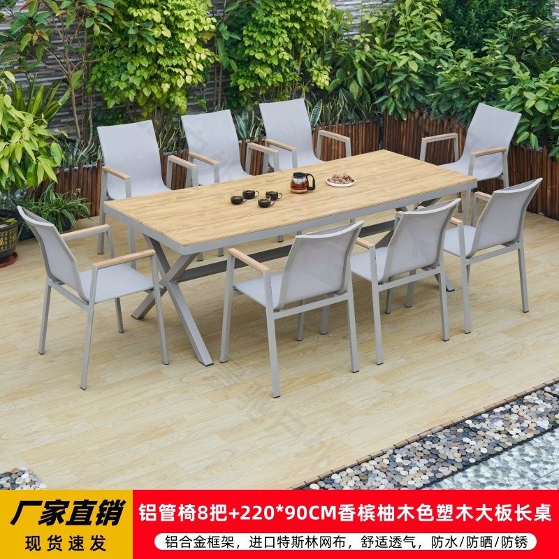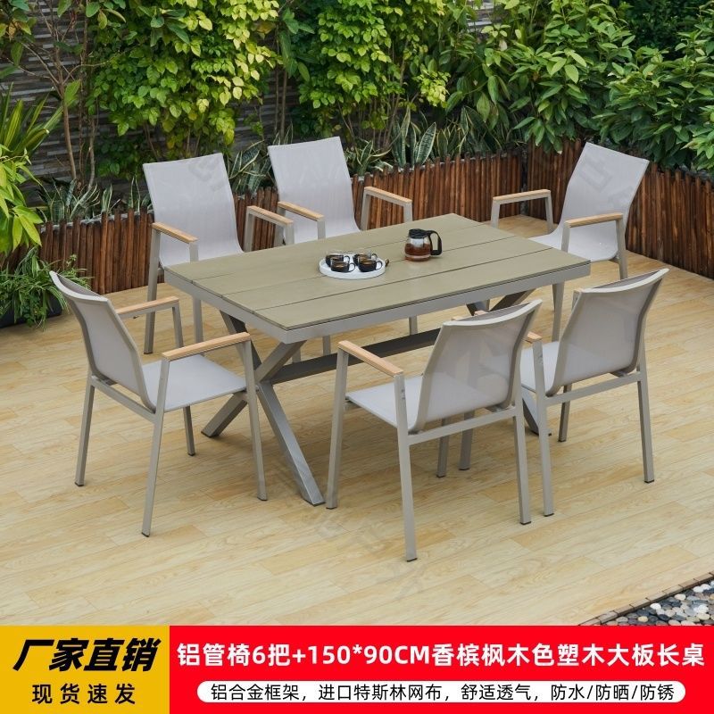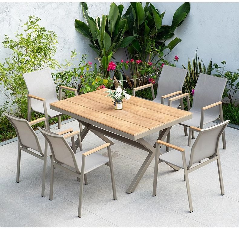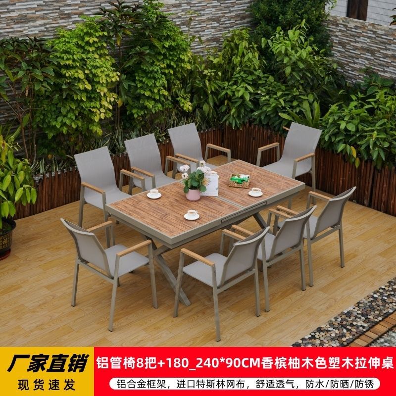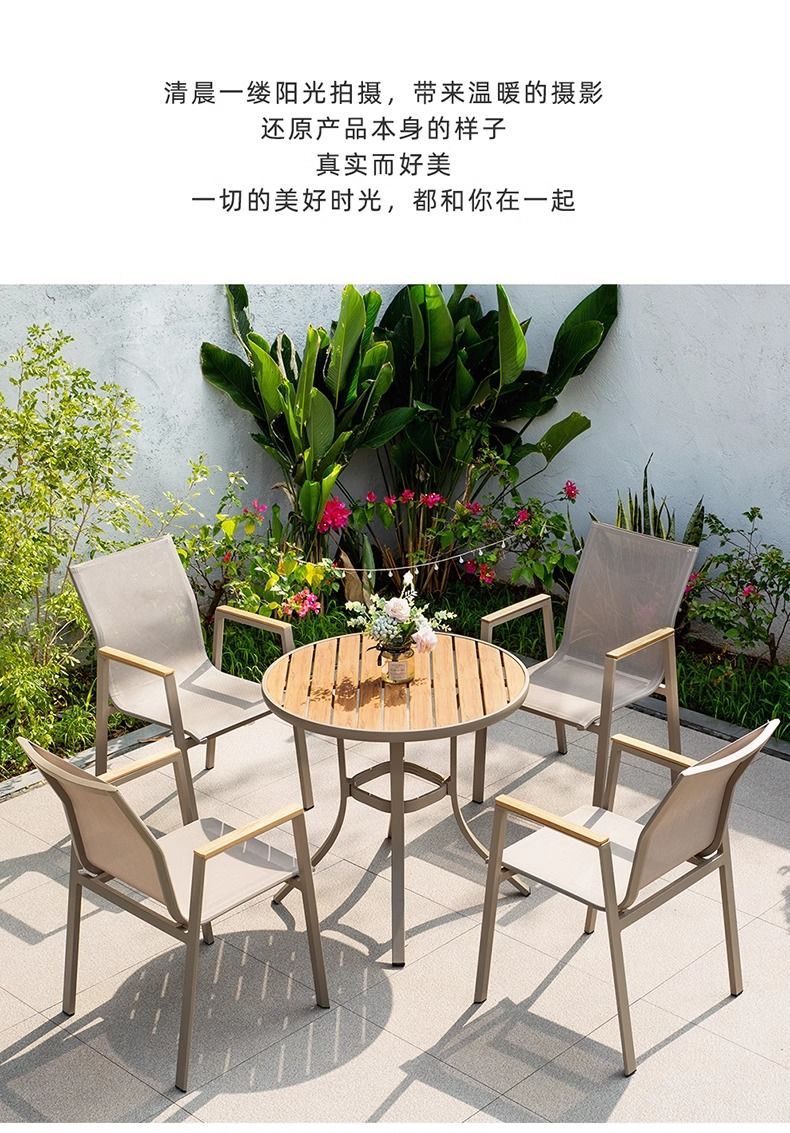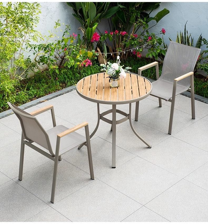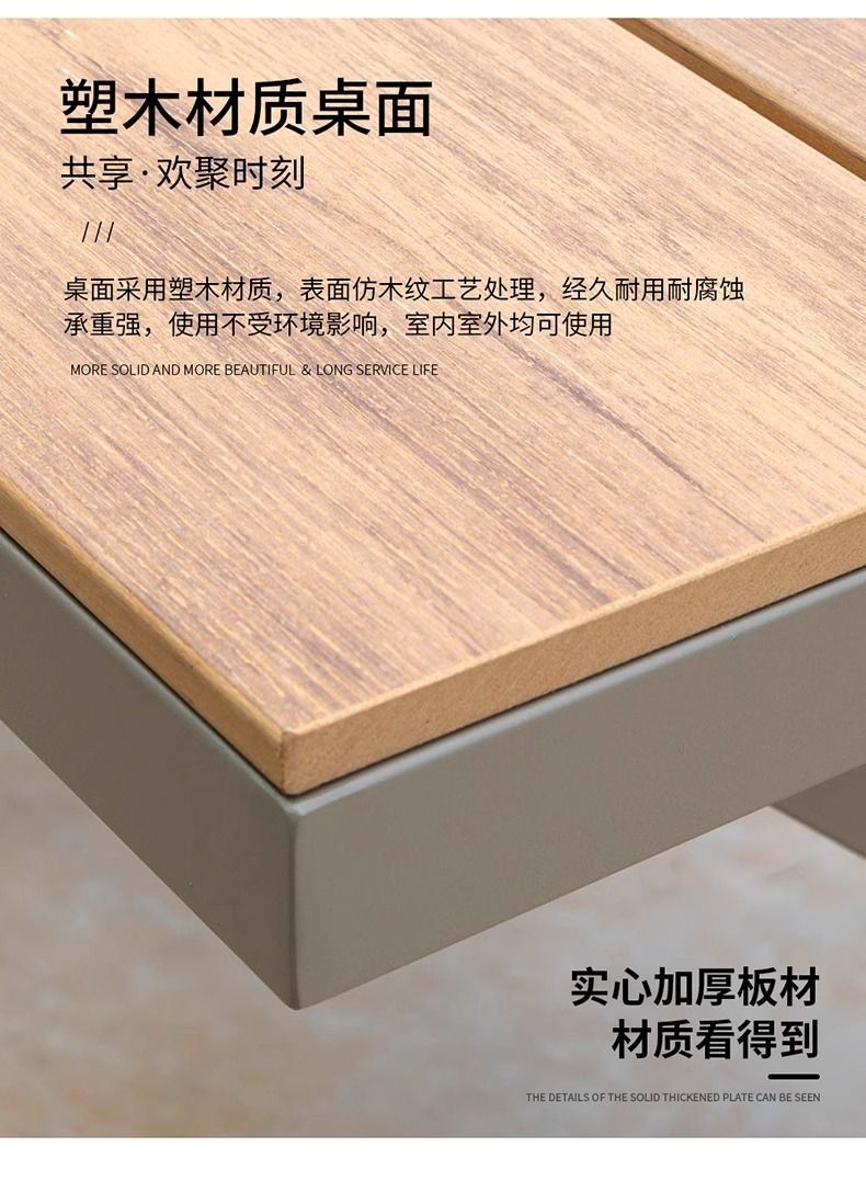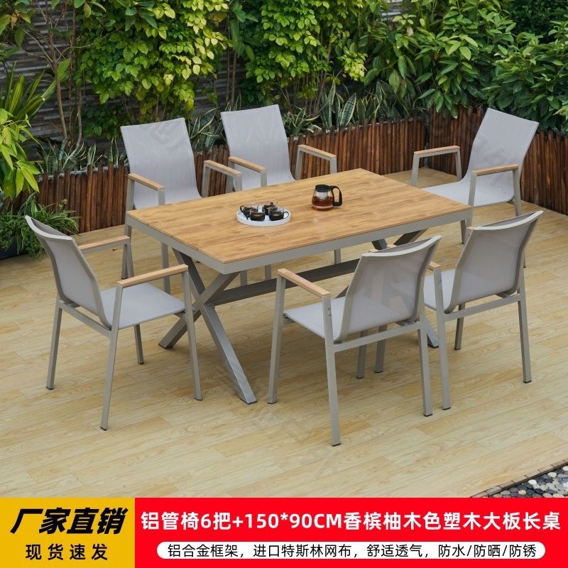 야외 안뜰 테이블과 의자 알루미늄 합금 야외 레저 플라스틱 목재 식탁 테라스 빌라 정원 부식 방지 목재 테이블과 의자 조합