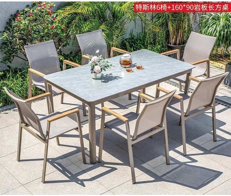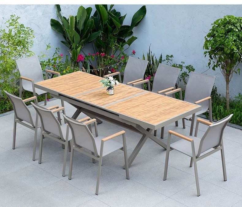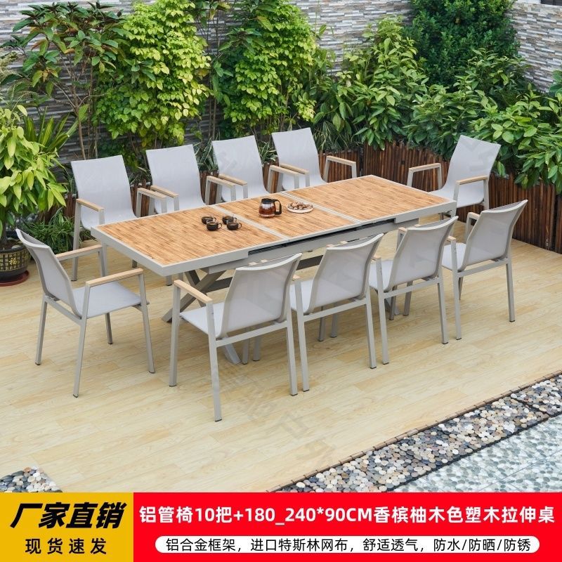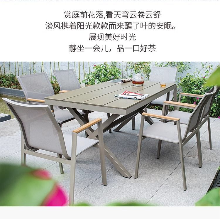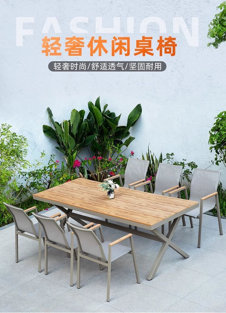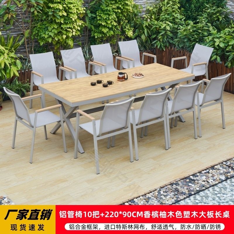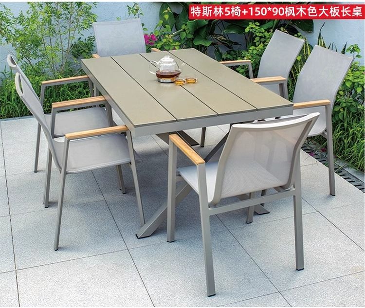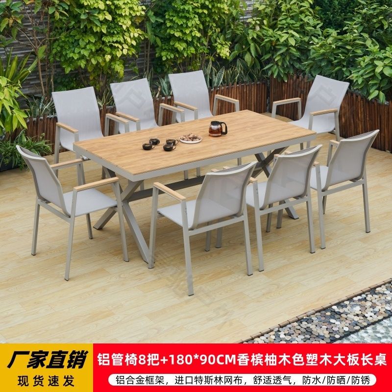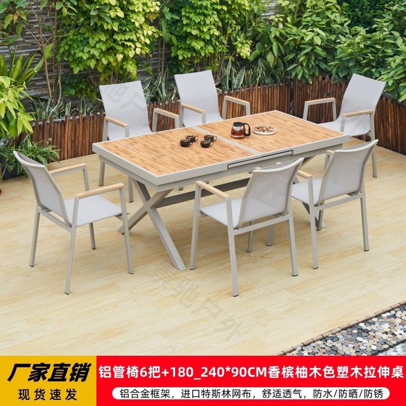 야외 안뜰 테이블과 의자 알루미늄 합금 야외 레저 플라스틱 목재 식탁 테라스 빌라 정원 부식 방지 목재 테이블과 의자 조합
