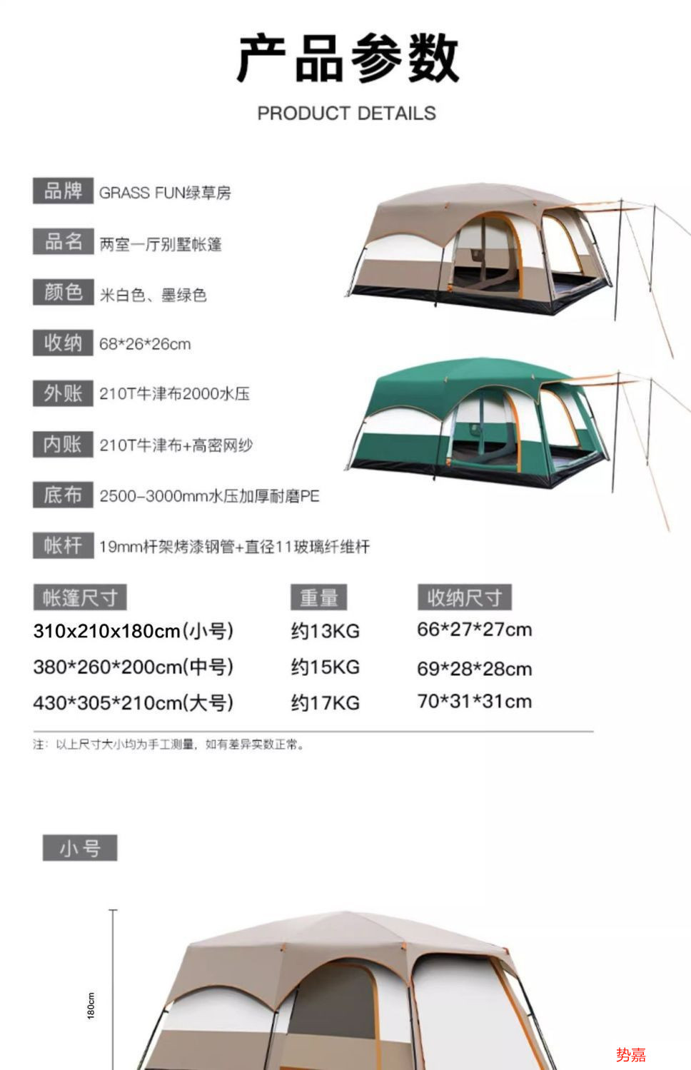 • 작은 크기: 침실 2개와 거실 1개 + 방습 매트*2 + 해먹