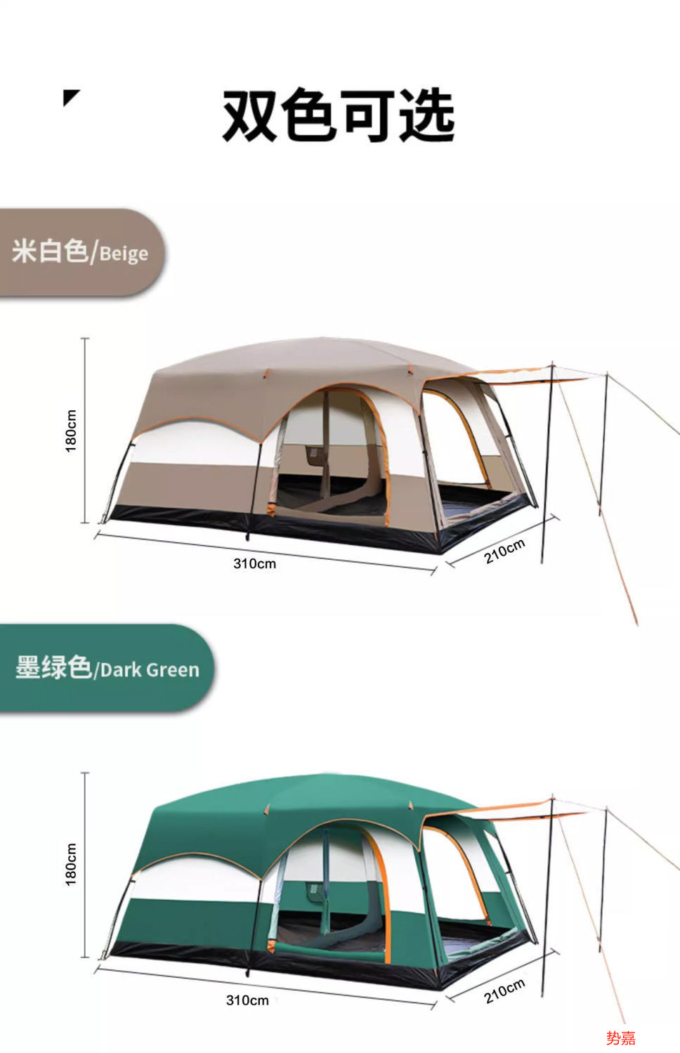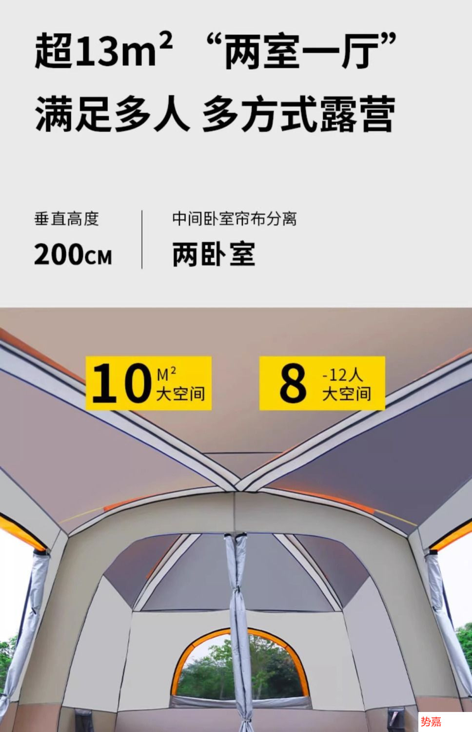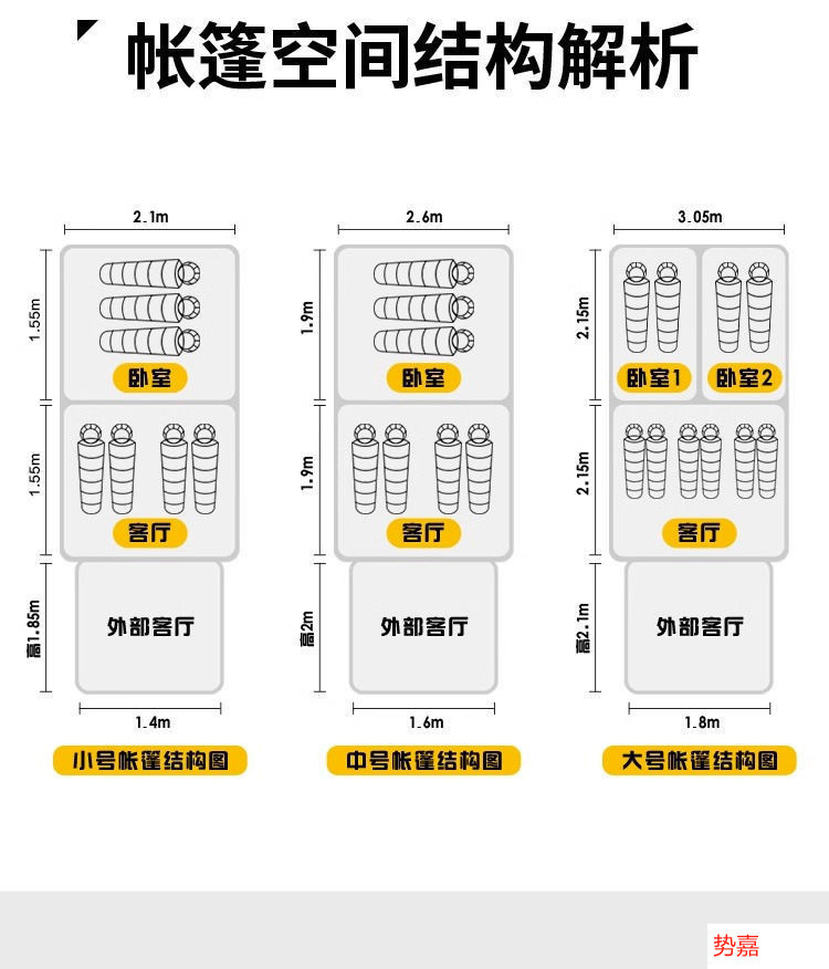 • 대형 사이즈: 침실 2개와 거실 1개가 있는 단일 텐트