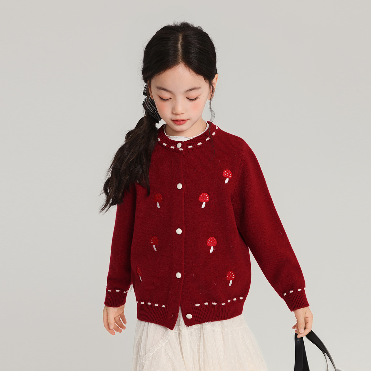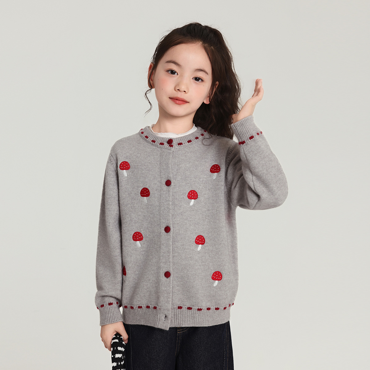 Pudding Haru Girls Top 2025 새로운 어린이 긴팔 버섯 자수 스웨터 카디건 소녀 가을 코트
