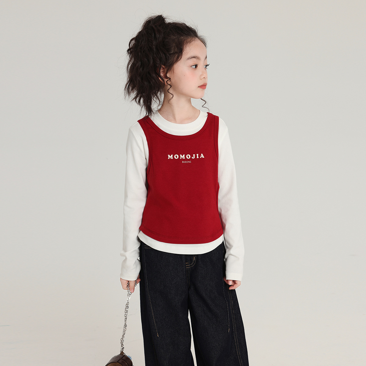 Pudding Haru Girls 라운드 넥 탑 2025 가을 새로운 대비 색상 가짜 투피스 어린이 한국 스타일 긴팔 티셔츠스토어 가기