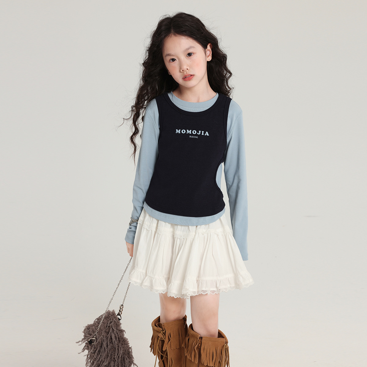 Pudding Haru Girls 라운드 넥 탑 2025 가을 새로운 대비 색상 가짜 투피스 어린이 한국 스타일 긴팔 티셔츠