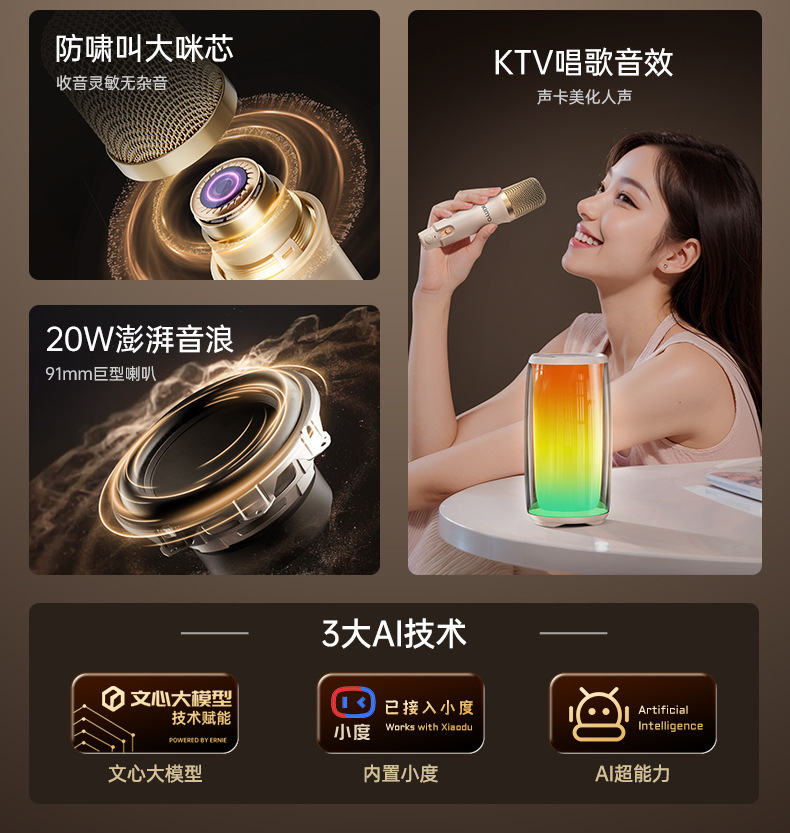 • 화이트 KTV 돌비 사운드 효과가 포함된 합창 버전 Xiaodu 음성 지원 20W 전력 및 대용량 Tmall 마이크 업계 선두 브랜드 주요 대회 시장 파트너