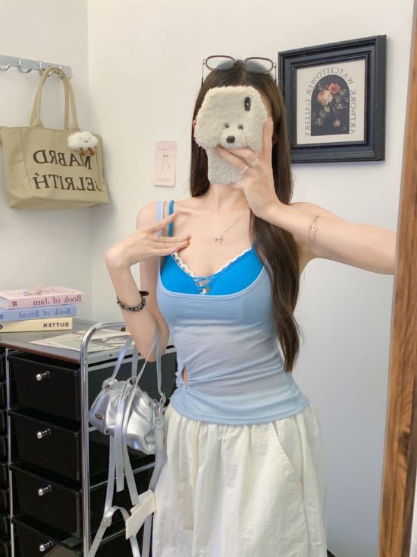 여름 휴가 투피스 새로운 달콤한 스타일 캐미솔 여성 한국 레이스 스플 라이스 슬림 피트 짧은스토어 가기