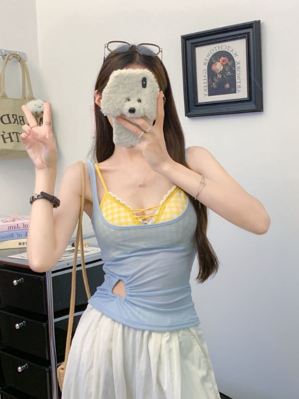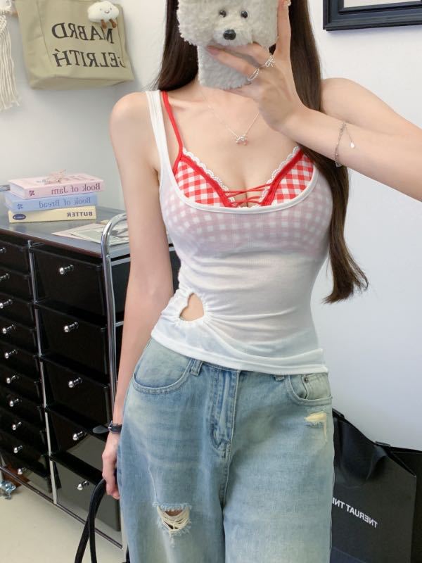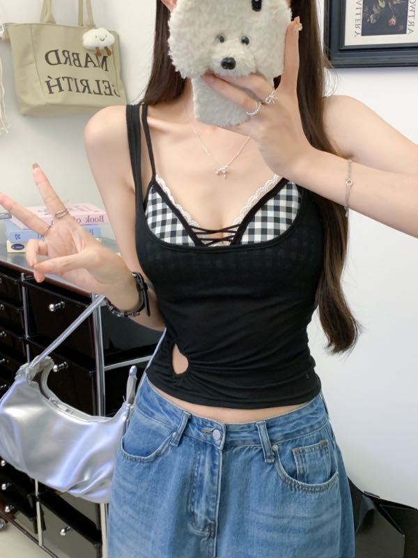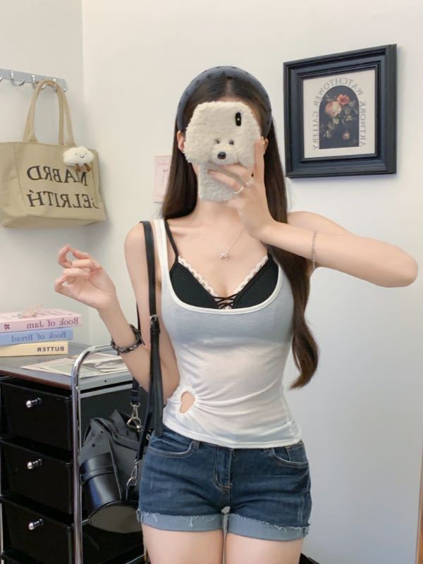 여름 휴가 투피스 새로운 달콤한 스타일 캐미솔 여성 한국 레이스 스플 라이스 슬림 피트 짧은