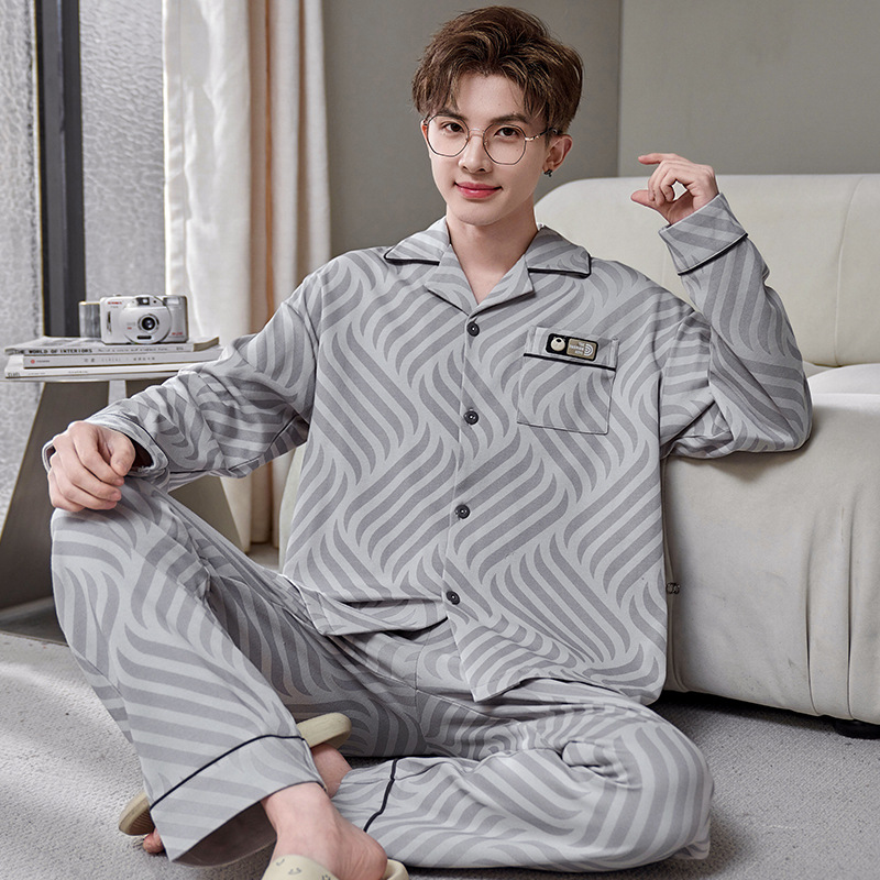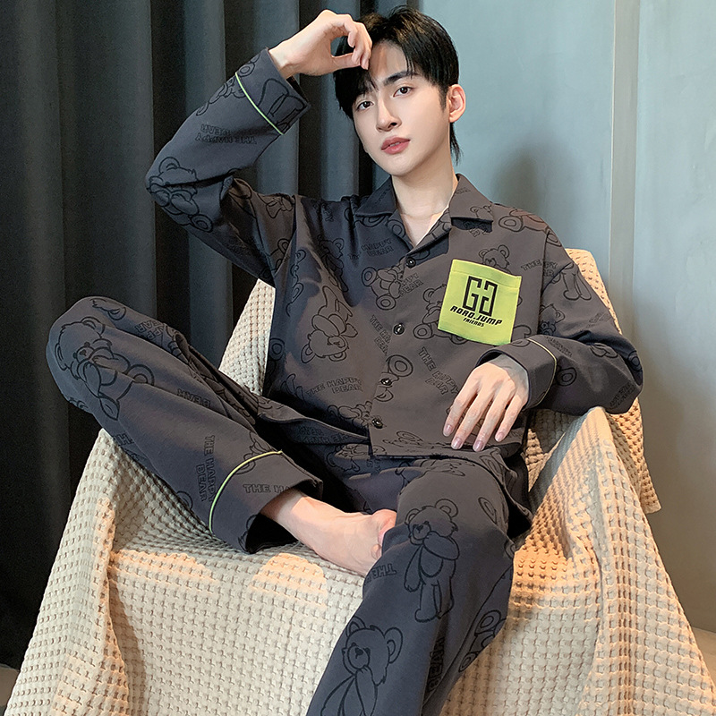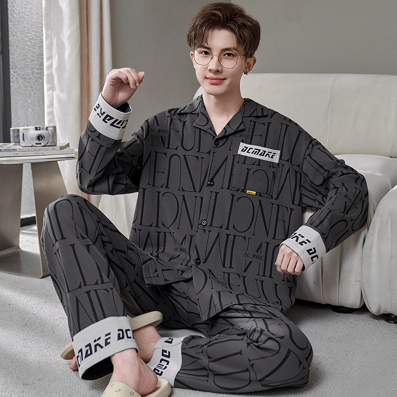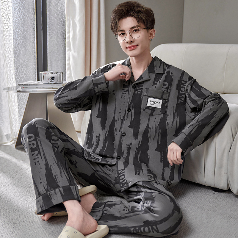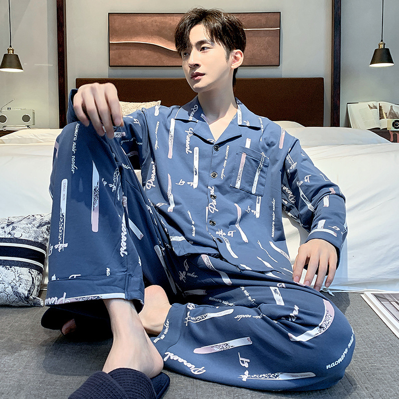 봄, 가을 남성용 잠옷, 긴팔 바지, 순면 가디건 슈트, 면 100% 버튼 홈복, 야외에서 착용 가능