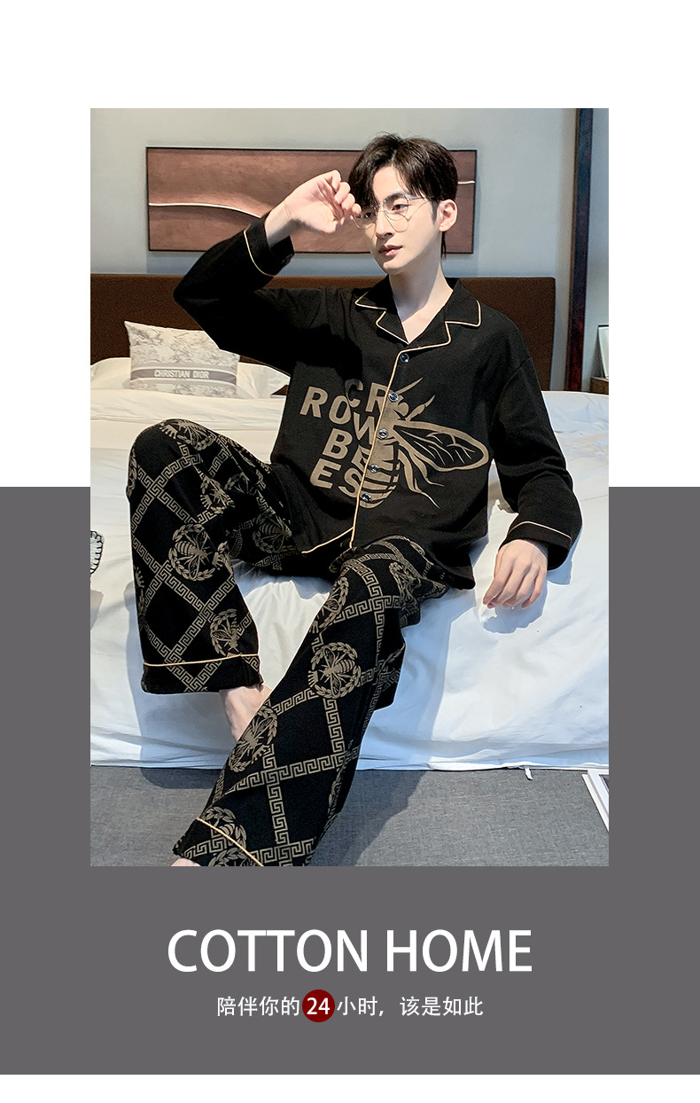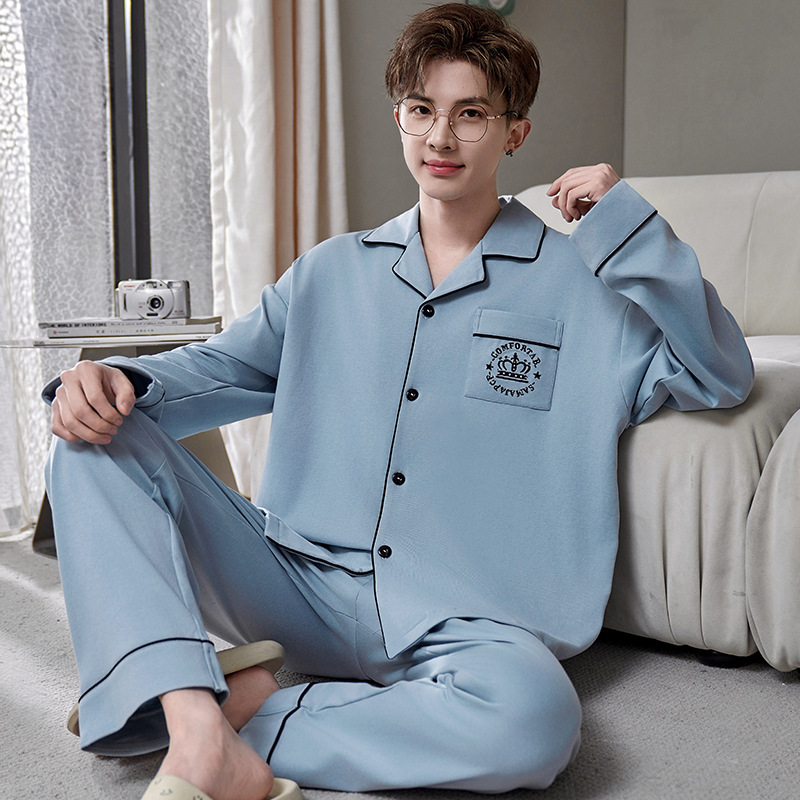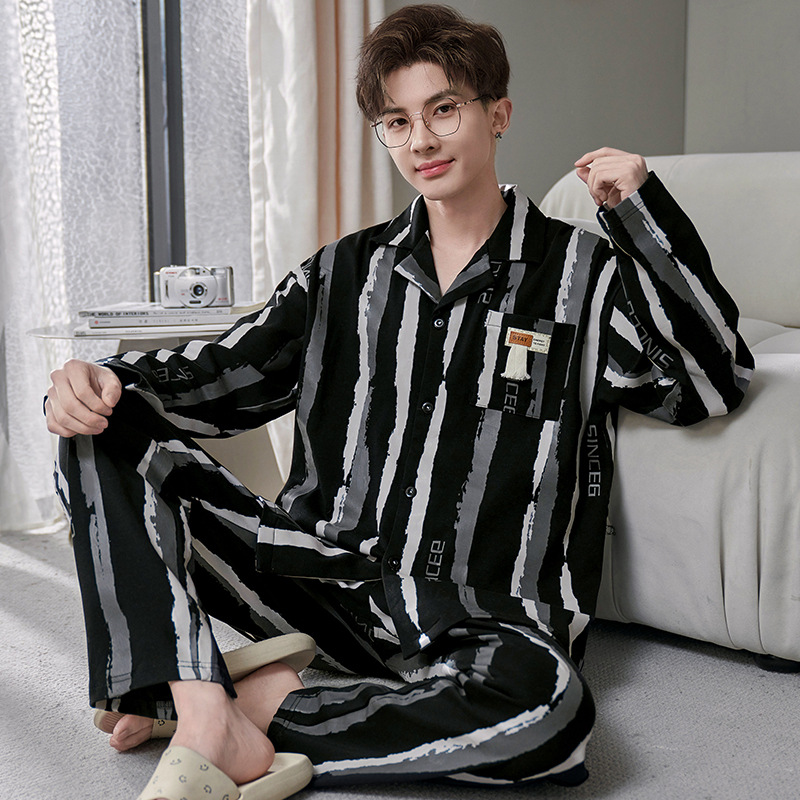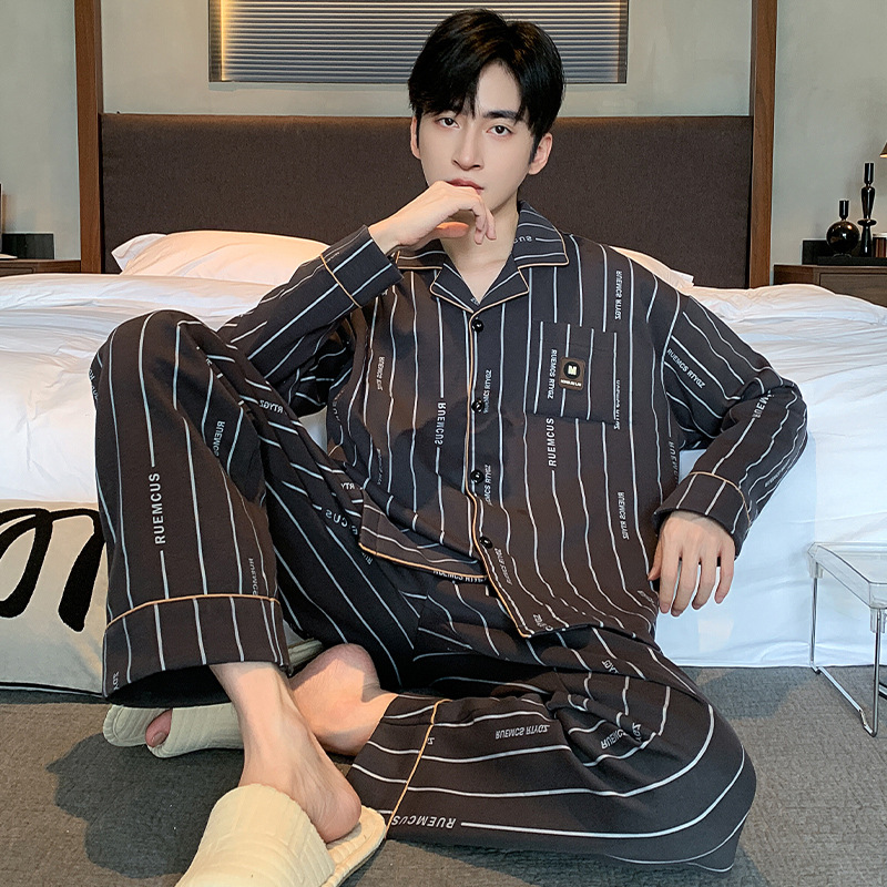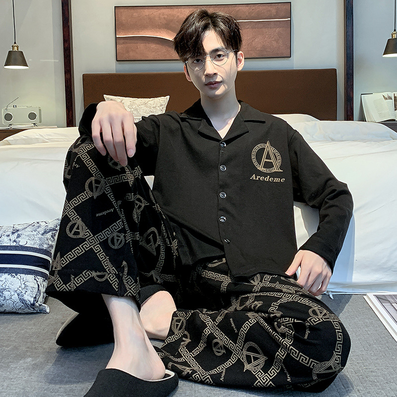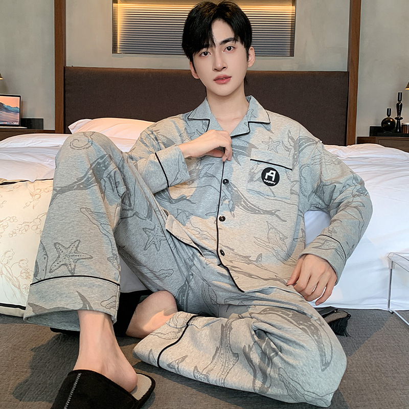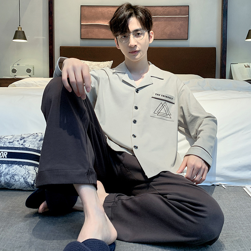 봄, 가을 남성용 잠옷, 긴팔 바지, 순면 가디건 슈트, 면 100% 버튼 홈복, 야외에서 착용 가능스토어 가기