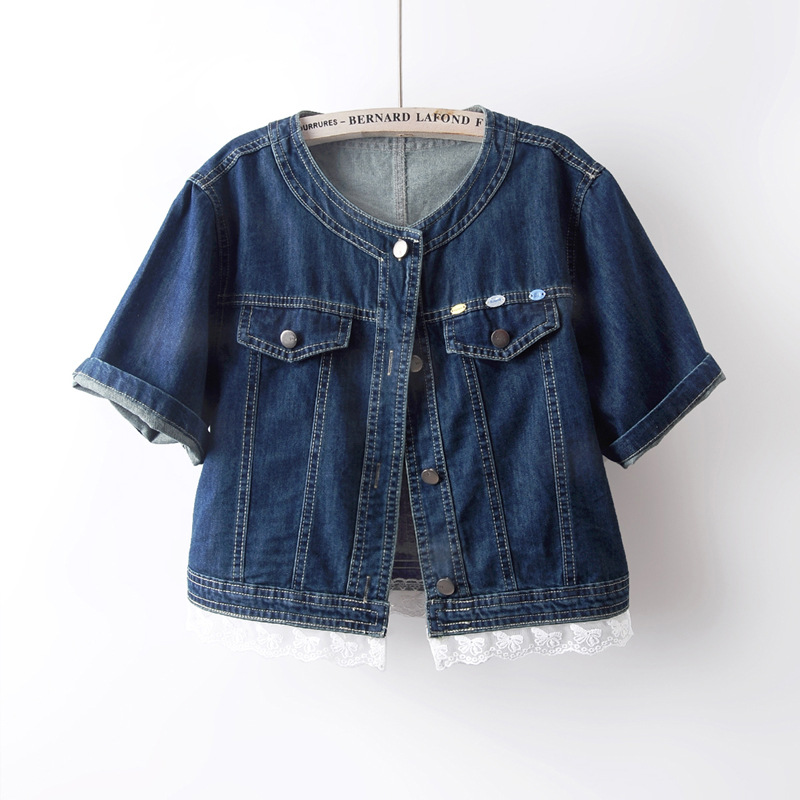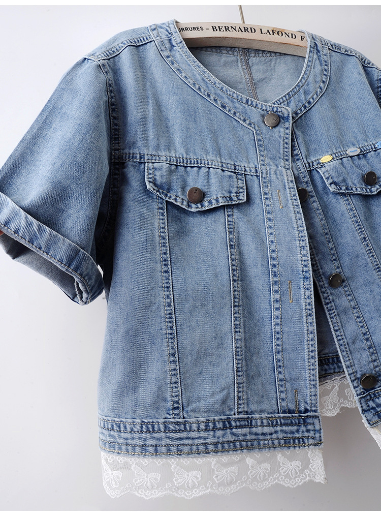 2025 여름 새 스타일 레이스 라운드 넥 반팔 데님 자켓 여성 짧은 쁘띠 탑 자켓 얇은