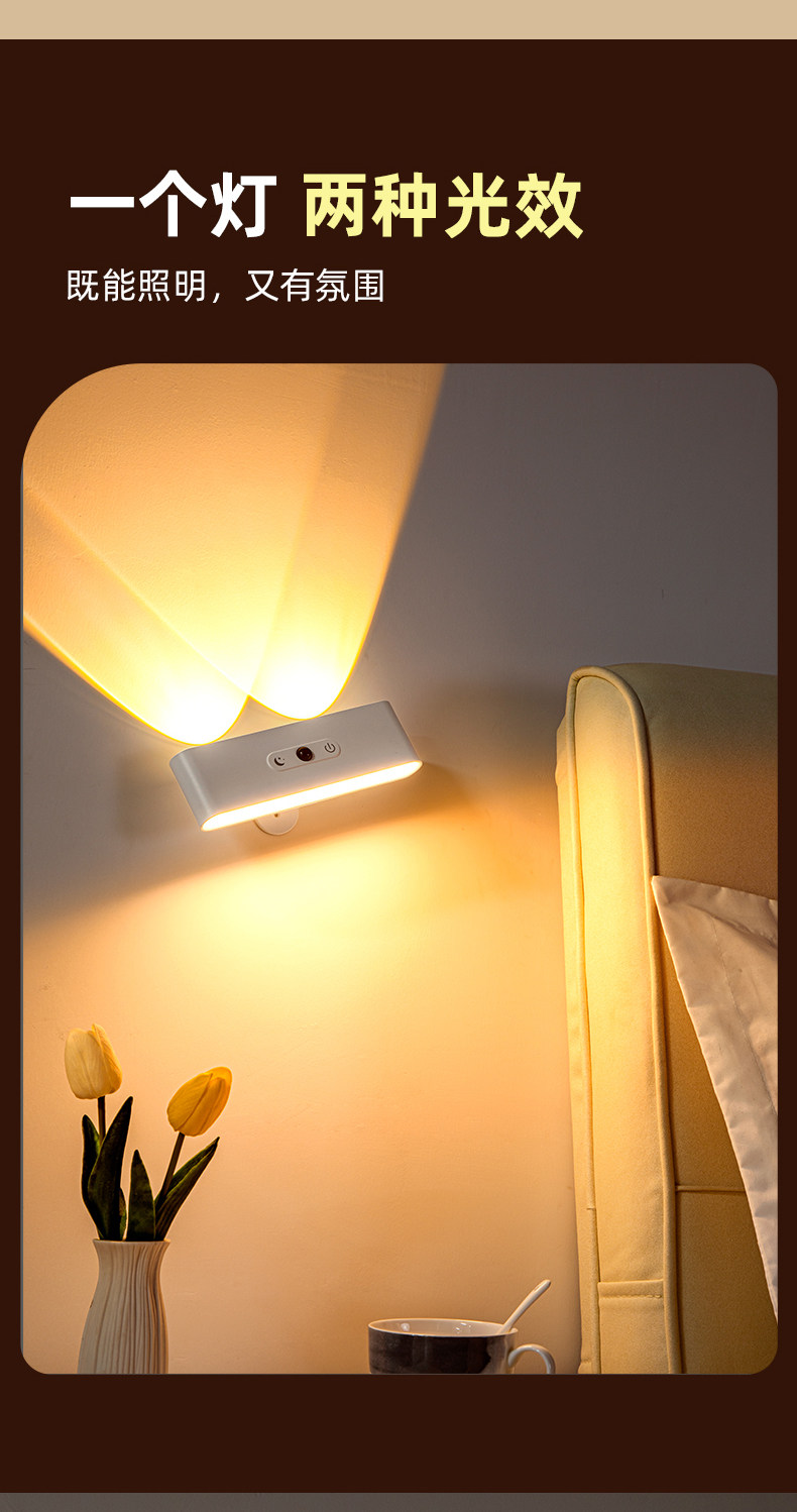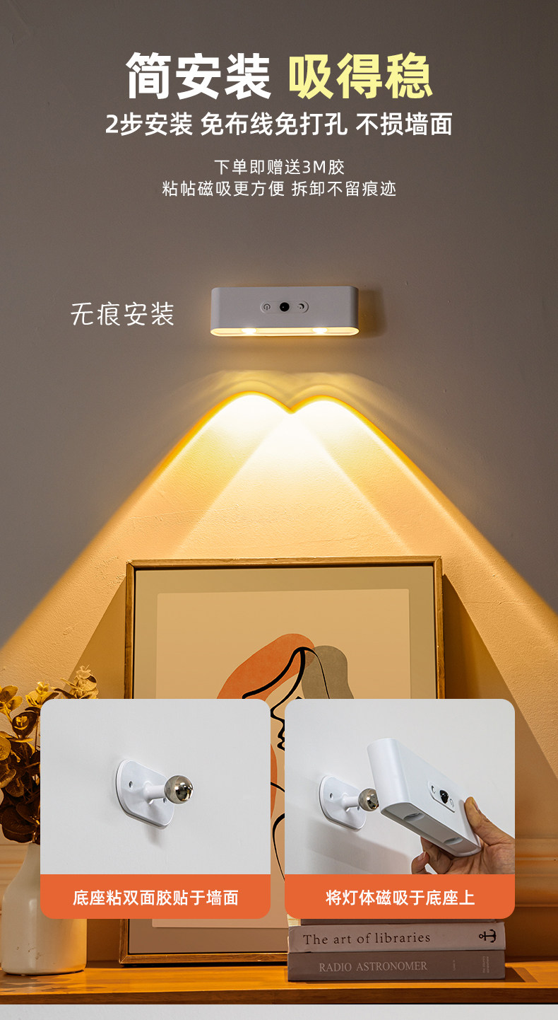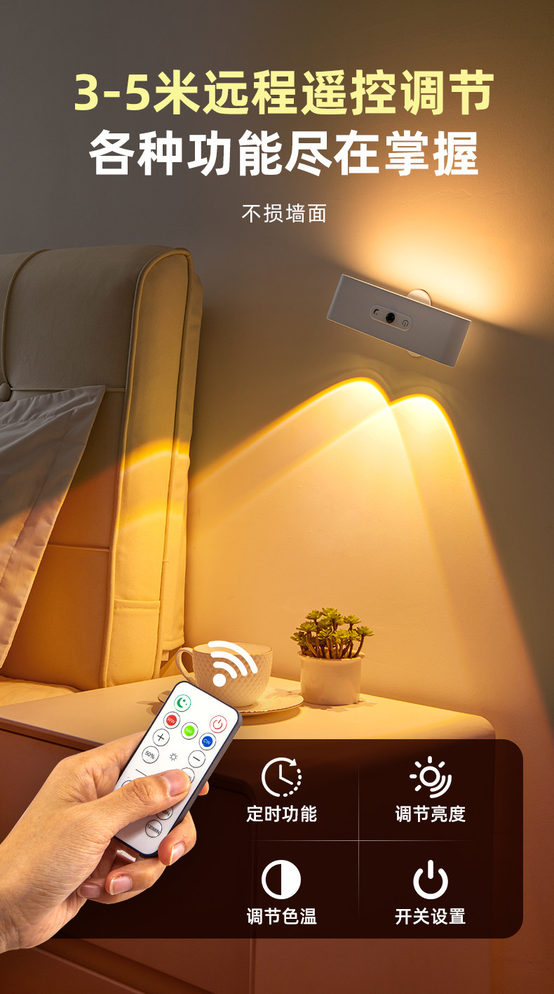국경을 넘는 무선 무타공 침실용 야간 조명, 실내 센서형 자석 부착 리모컨 USB 충전 벽등