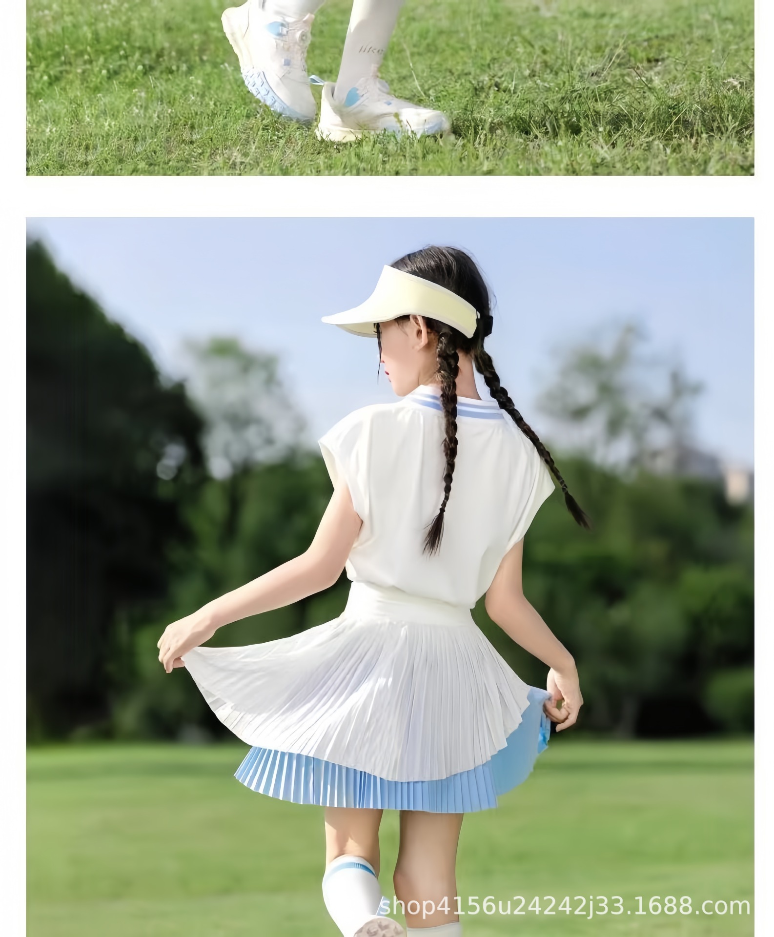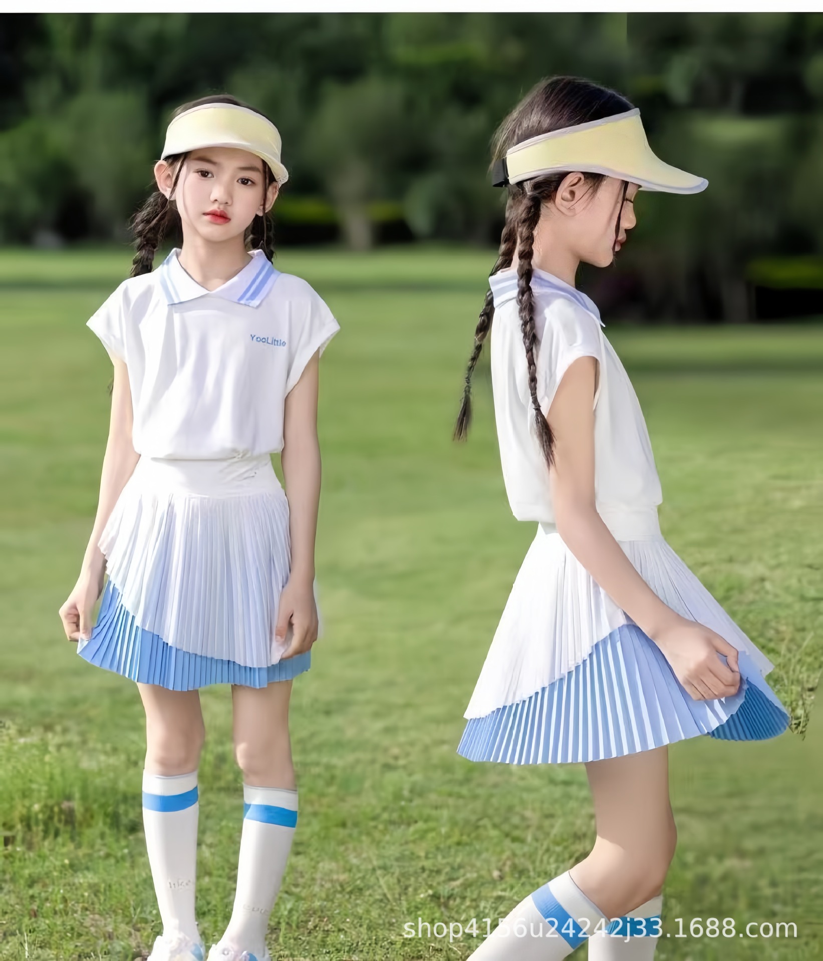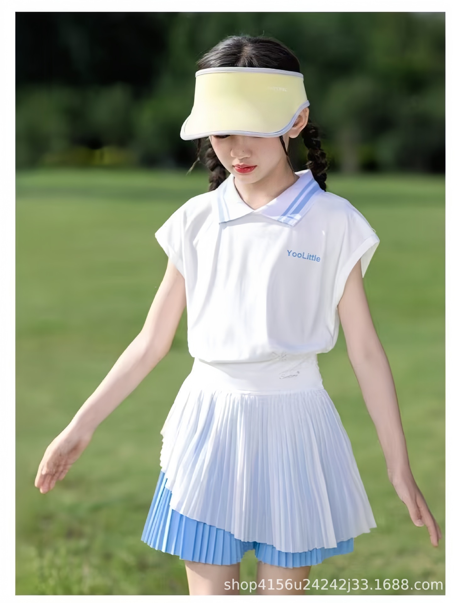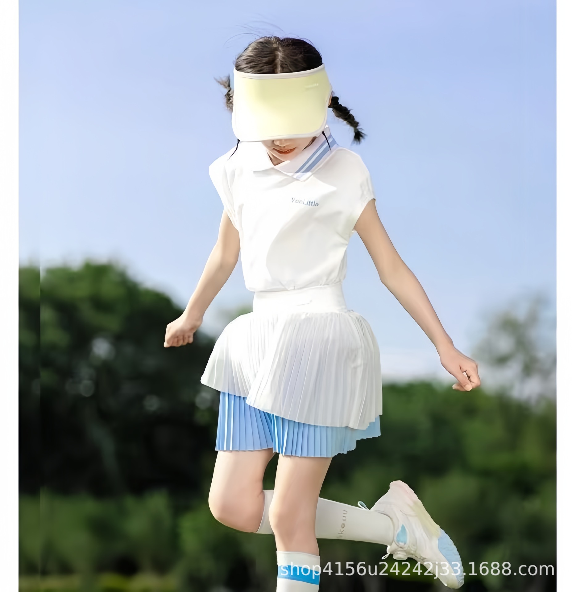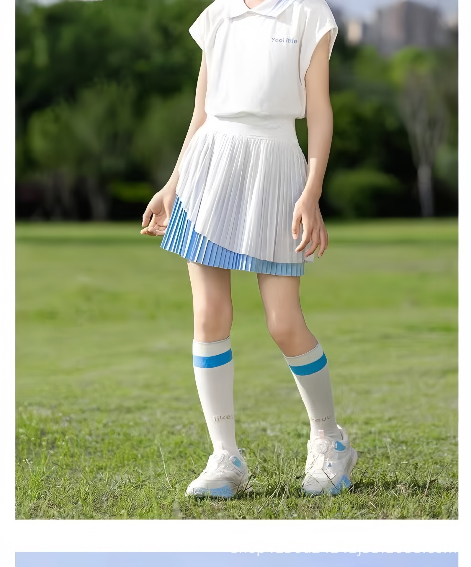 • 크레센트 컬러 폴로 셔츠 탑 + 스카이블루 플리츠 스커트