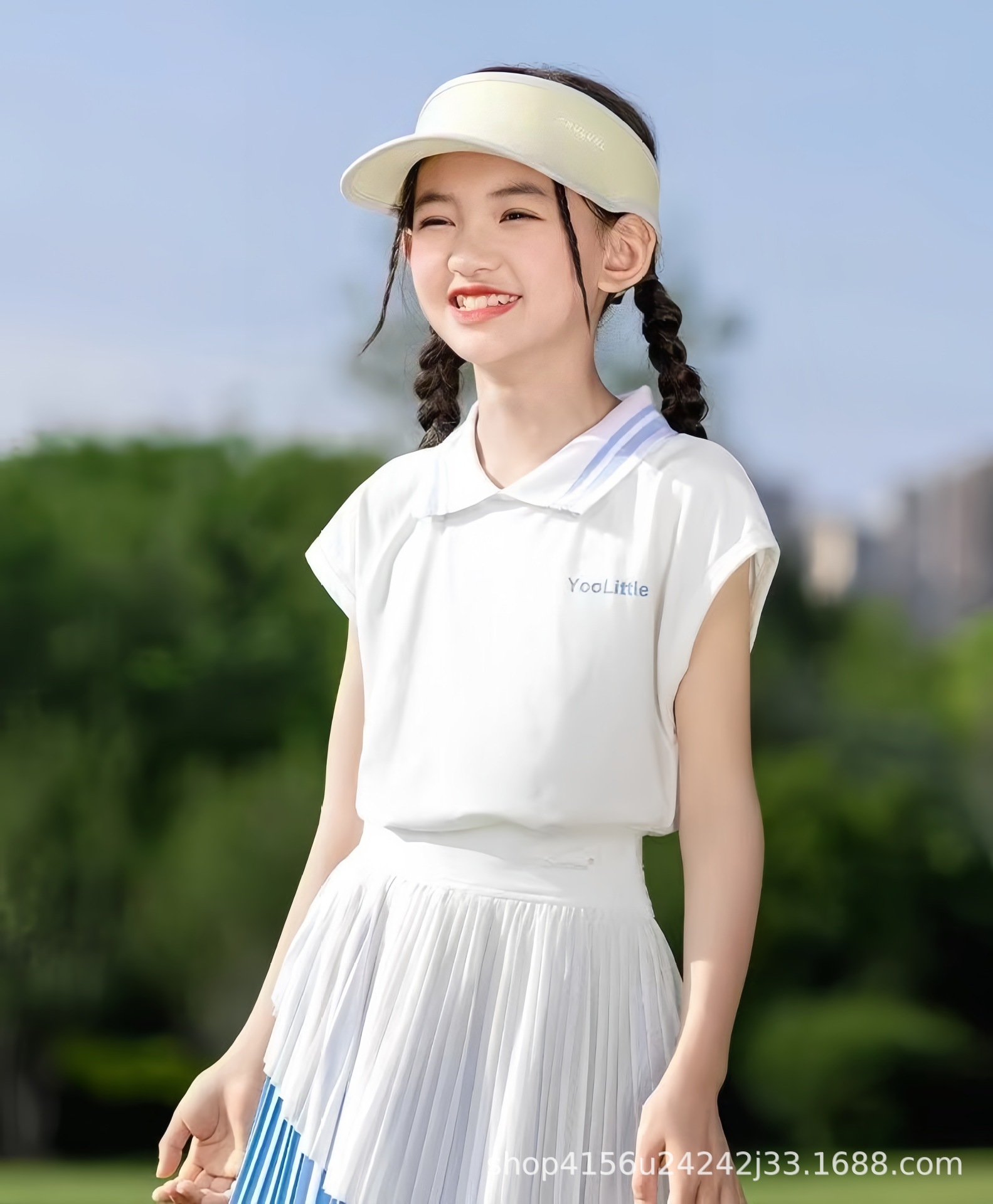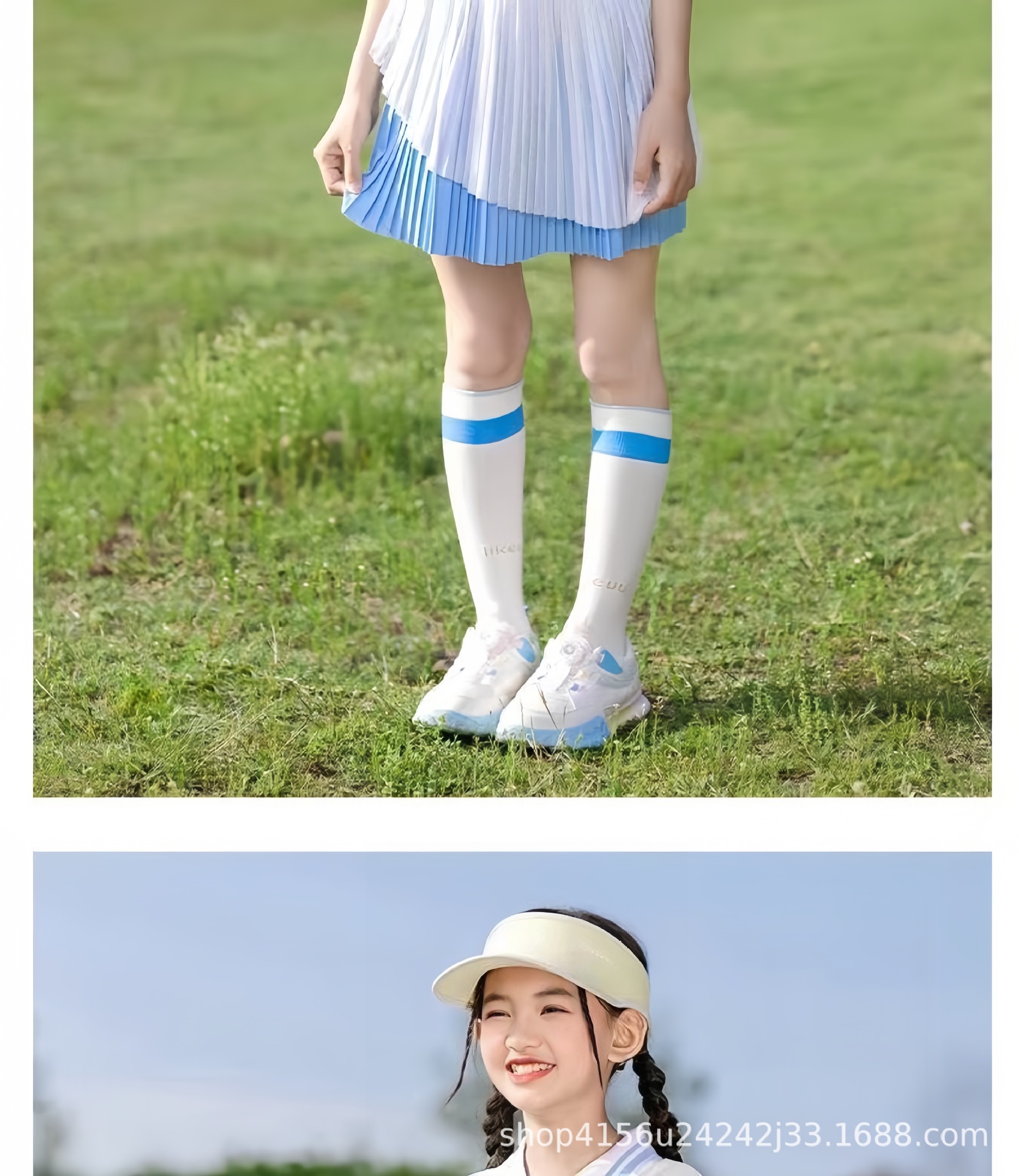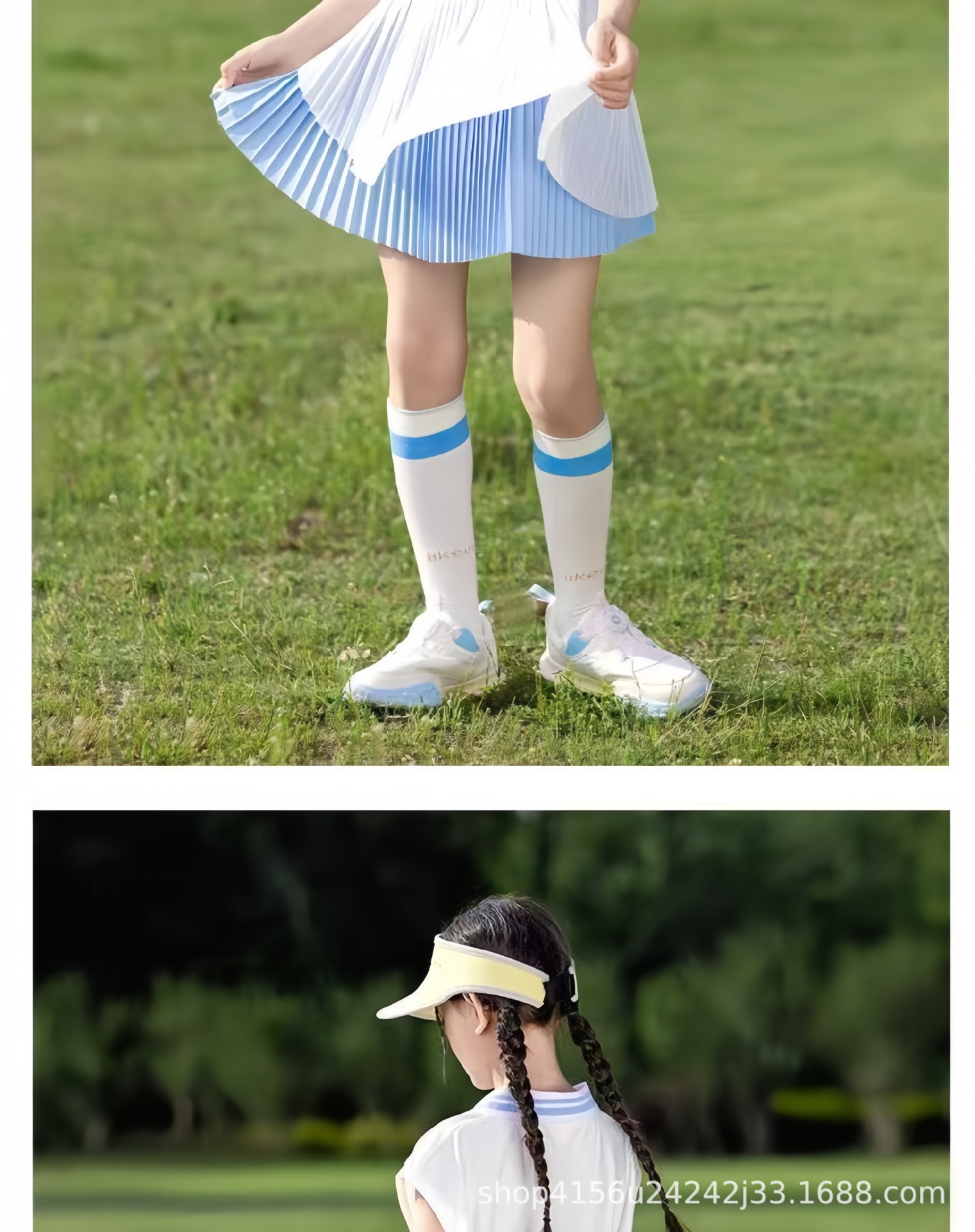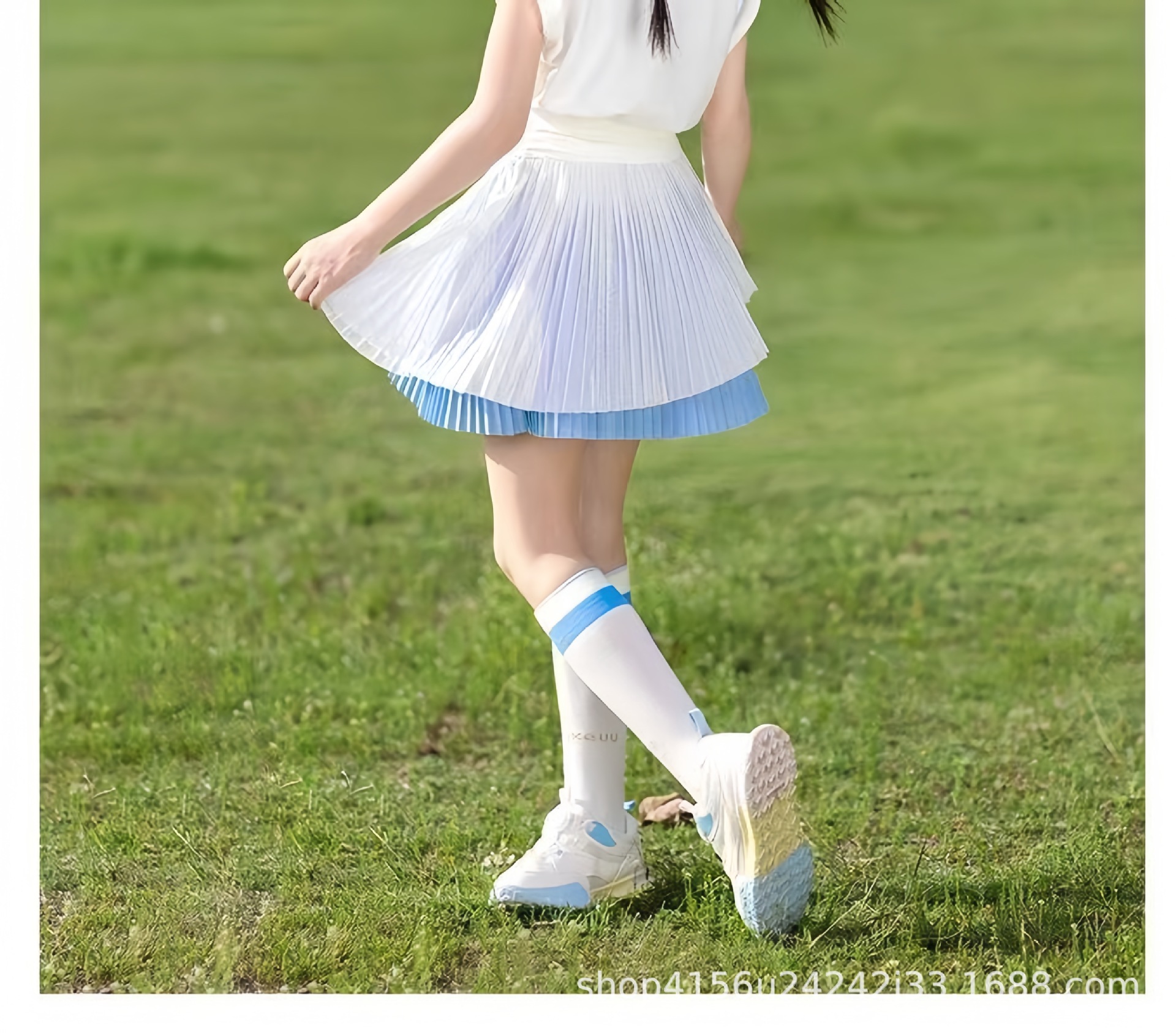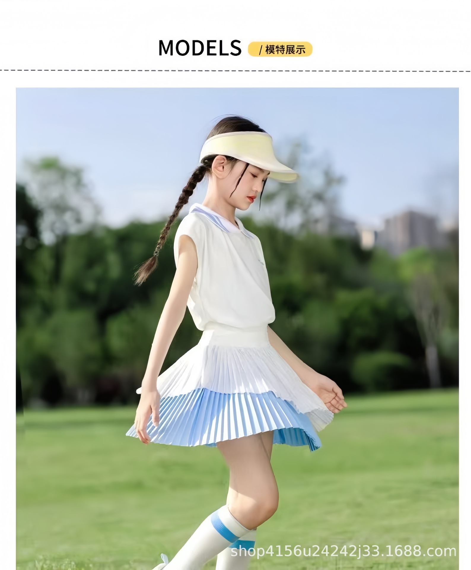 • 크레센트 컬러 폴로 셔츠 탑 + 스카이블루 플리츠 스커트