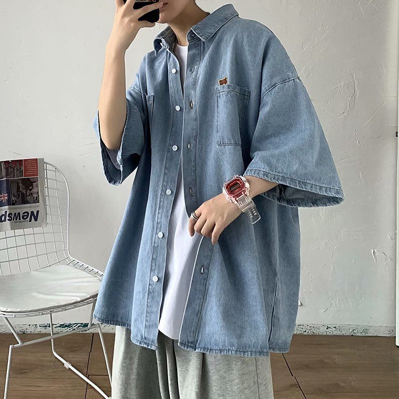 남성용 반팔 데님 셔츠 여름 미국 복고풍 곰 자수 핸섬 셔츠 루즈한 게으른 인치 셔츠 재킷스토어 가기
