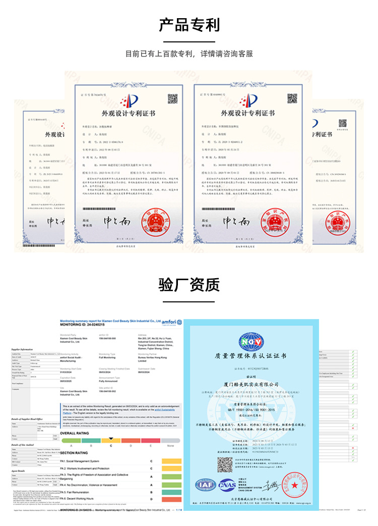 厦门酷美肌实业有限公司是一家集研发、生产、销售为一体的企业。主要生产不锈钢制品、不锈钢家庭用品、不锈钢化妆品、按摩工具等。作为一家专业的不锈钢产品供应商,我们拥有优秀的团队,专注于产品开发和设计、质量控制和检验以及公司运营。为了提供满意的产品和服务,我们建立了严格按照国际标准的现代化质量管理体系。公司已有ISO9001,BSCI等各类验厂资质,在国内外拥有上百款的外观专利。