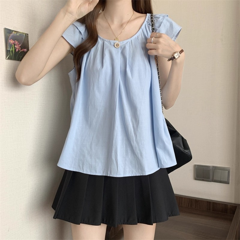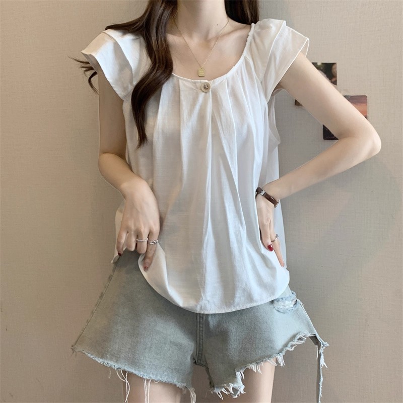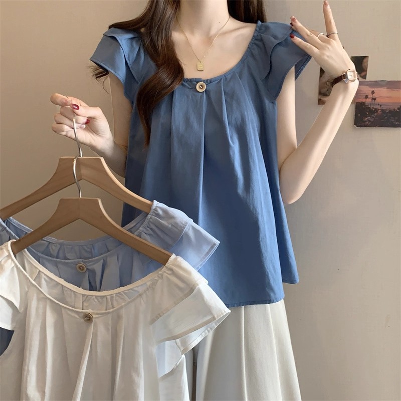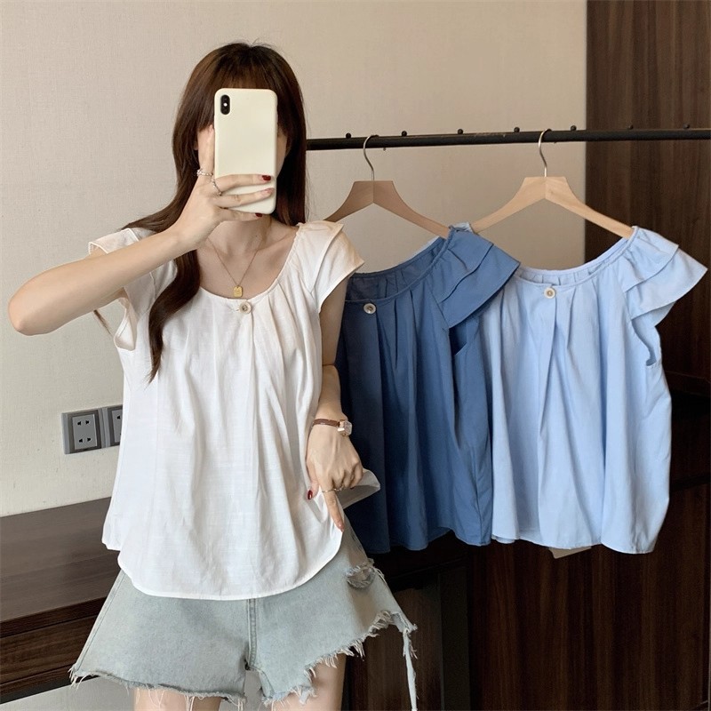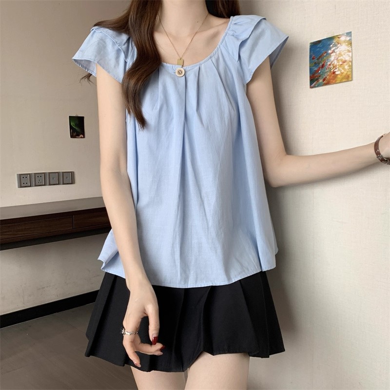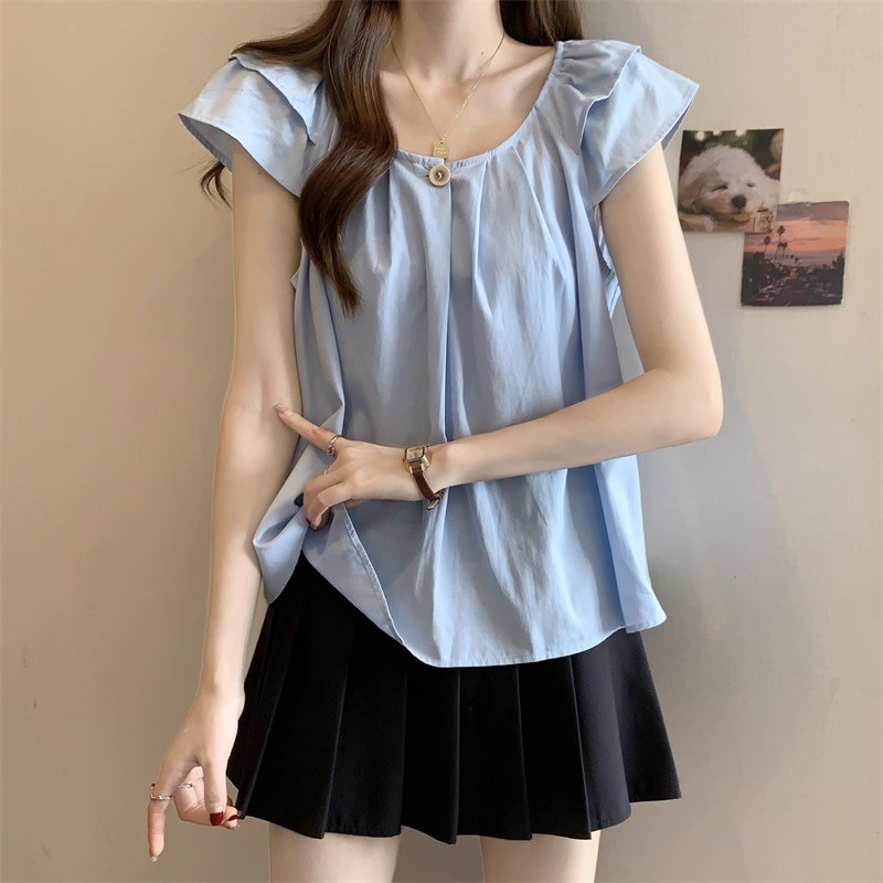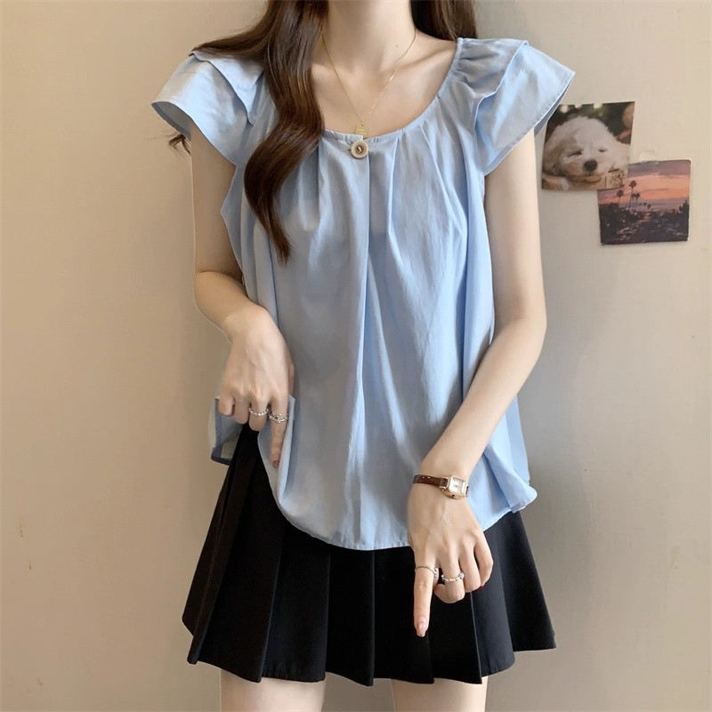 새로운 한국 슈퍼 100kg 플러스 사이즈 뚱뚱한 mm 플라잉 슬리브 플리츠 베이비돌 셔츠 여성 여름 루즈 탑 여성스토어 가기