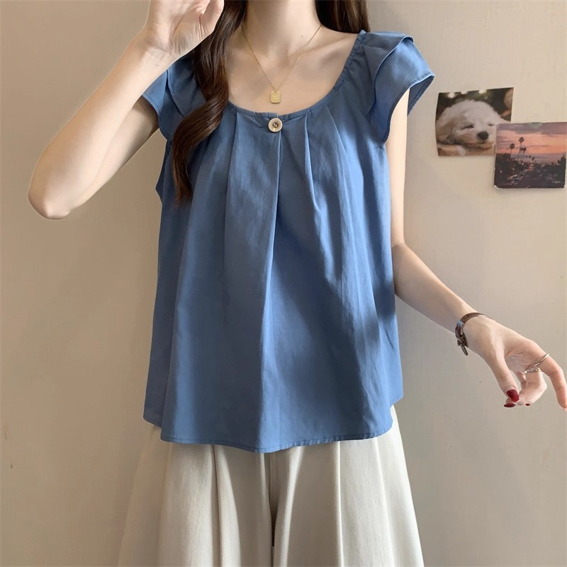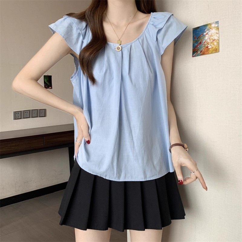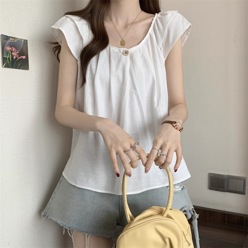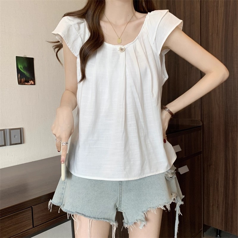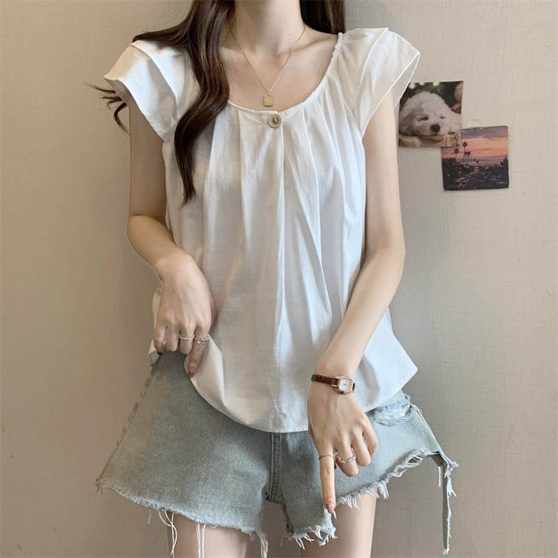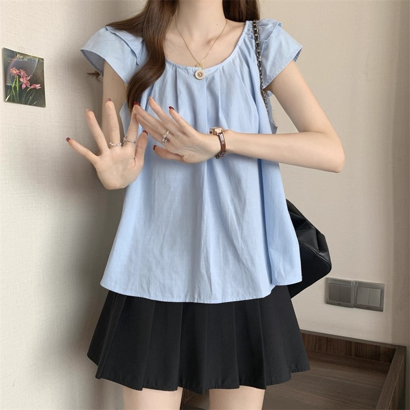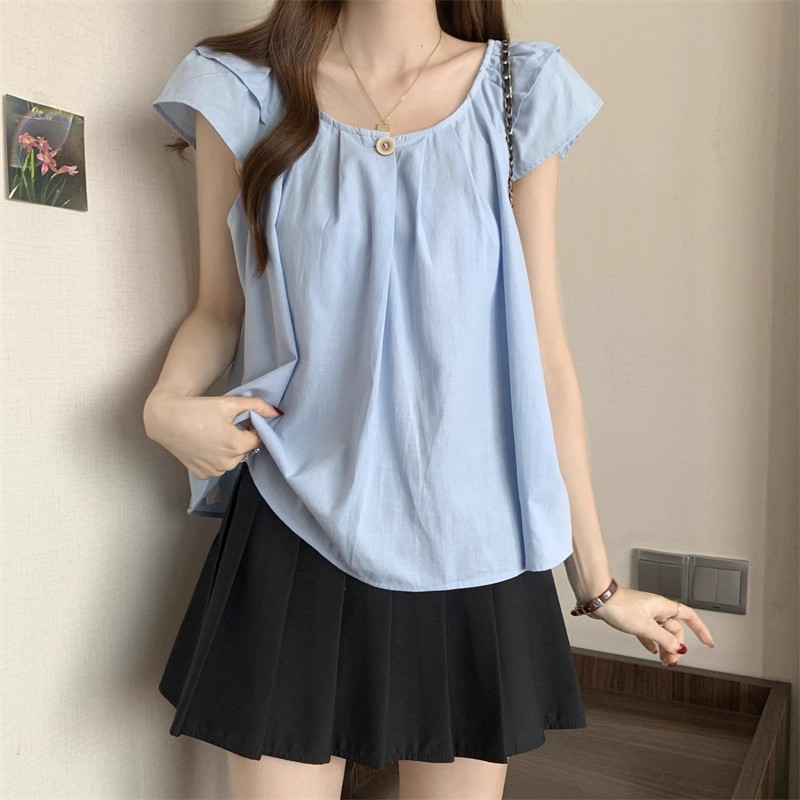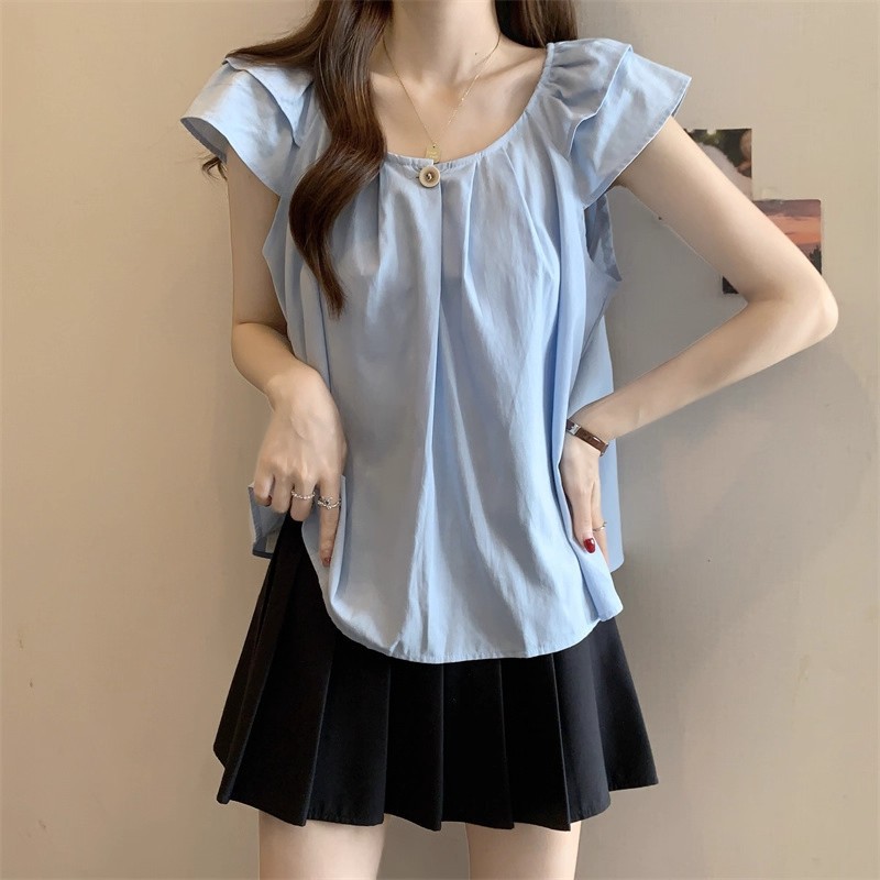 새로운 한국 슈퍼 100kg 플러스 사이즈 뚱뚱한 mm 플라잉 슬리브 플리츠 베이비돌 셔츠 여성 여름 루즈 탑 여성스토어 가기