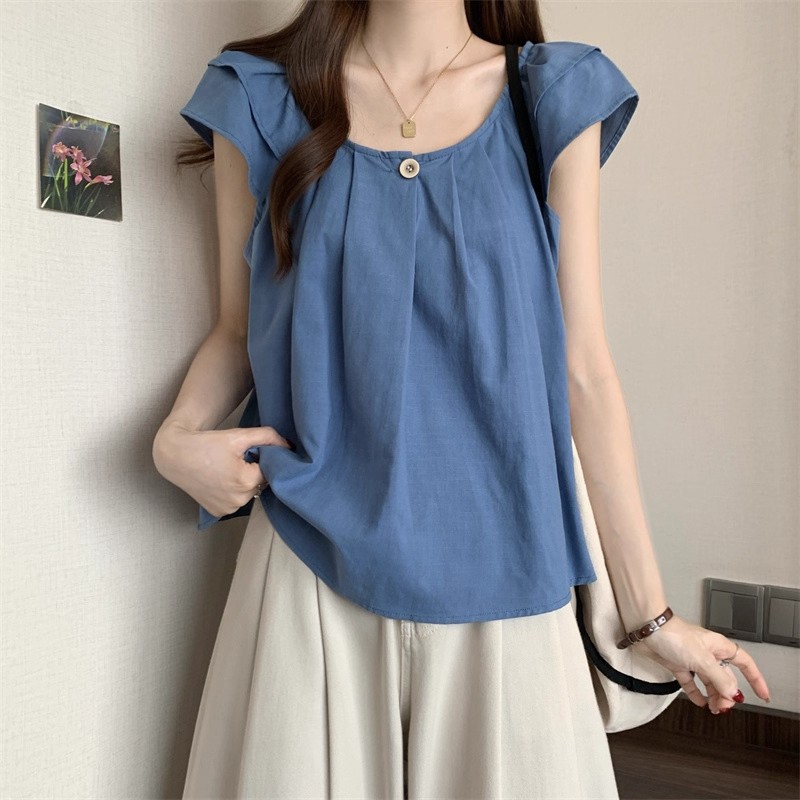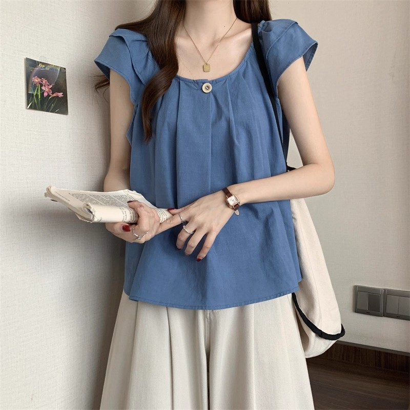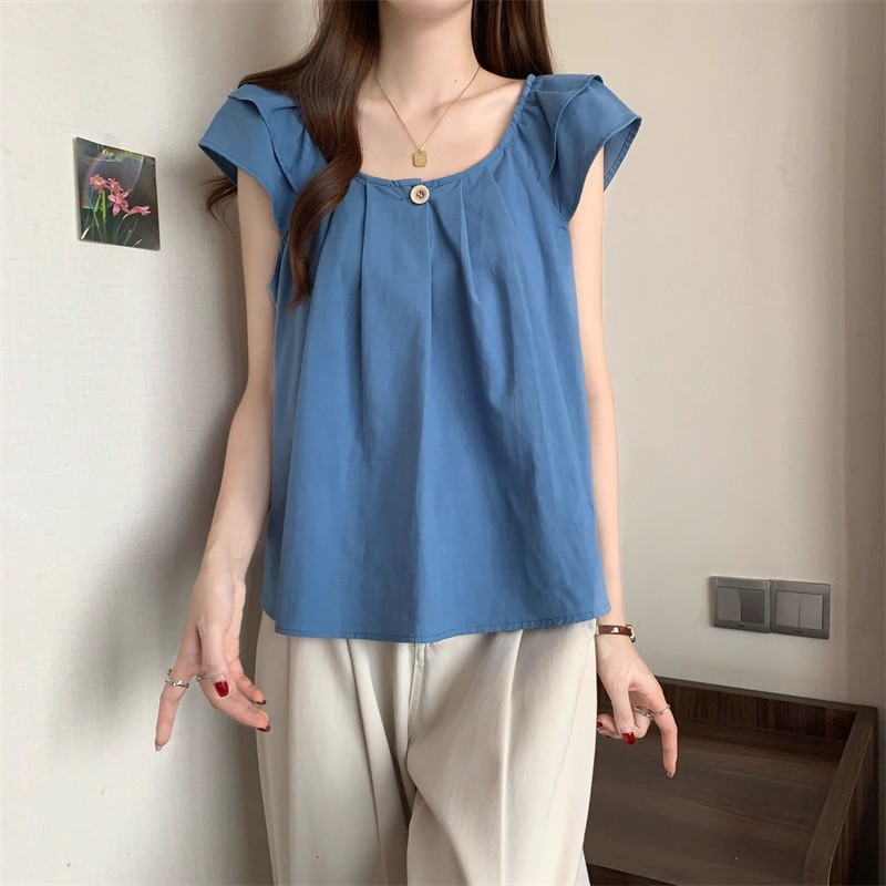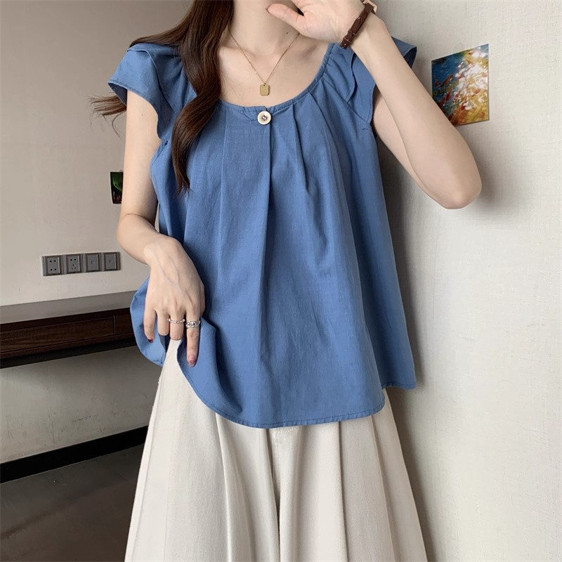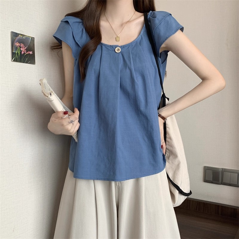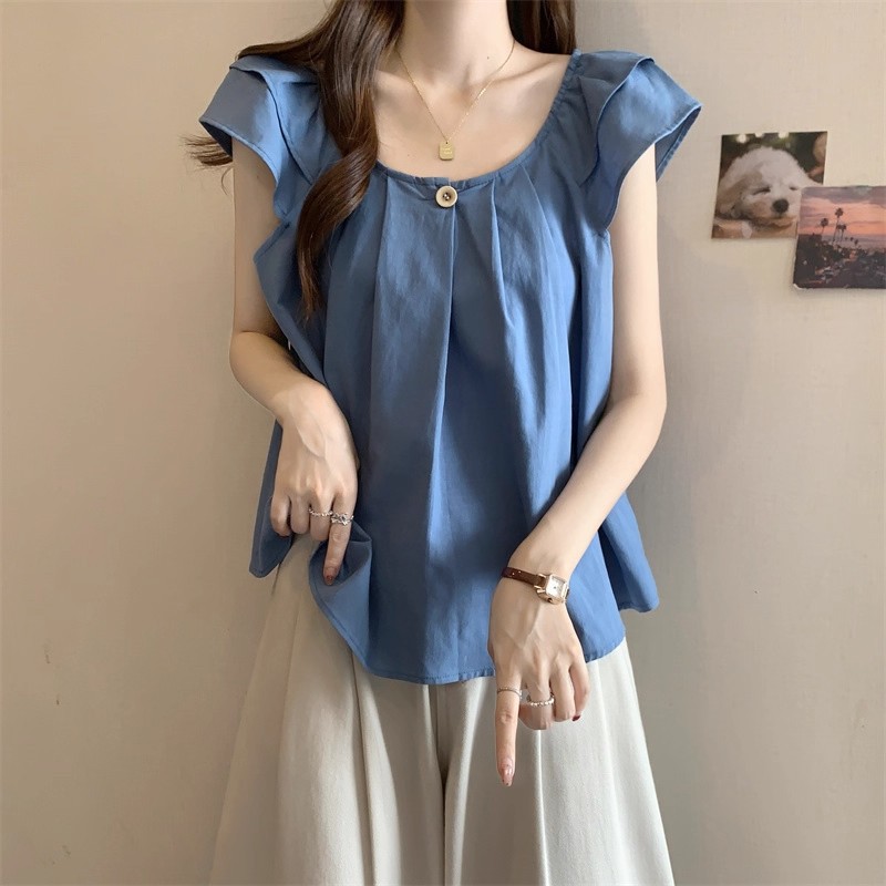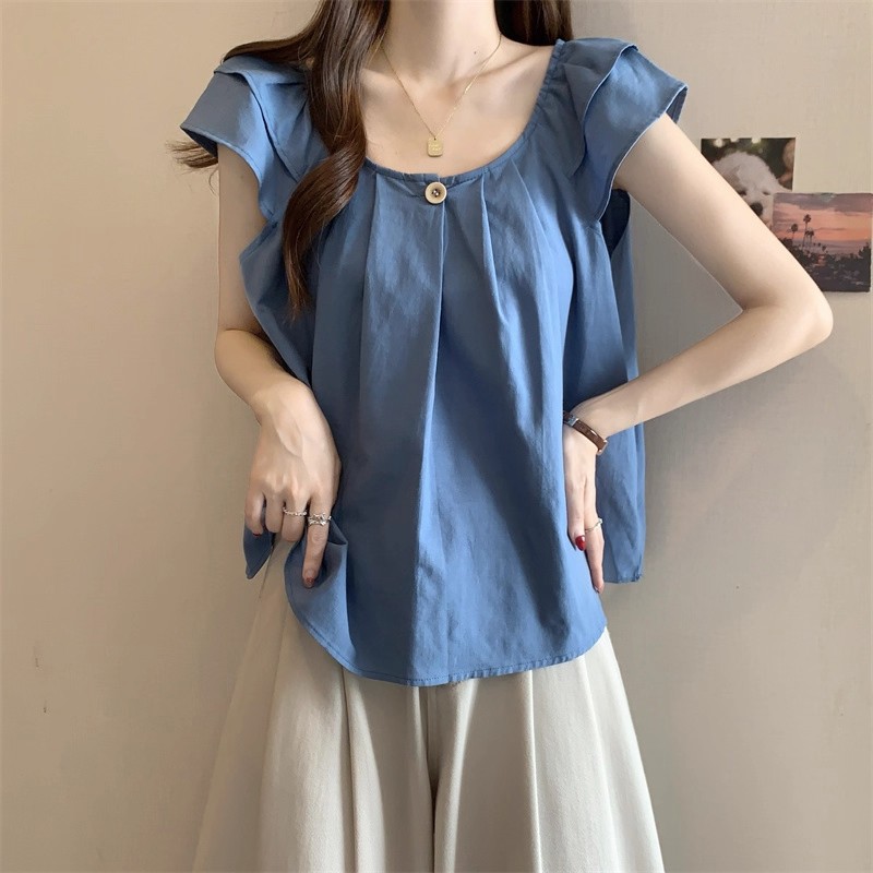 새로운 한국 슈퍼 100kg 플러스 사이즈 뚱뚱한 mm 플라잉 슬리브 플리츠 베이비돌 셔츠 여성 여름 루즈 탑 여성스토어 가기