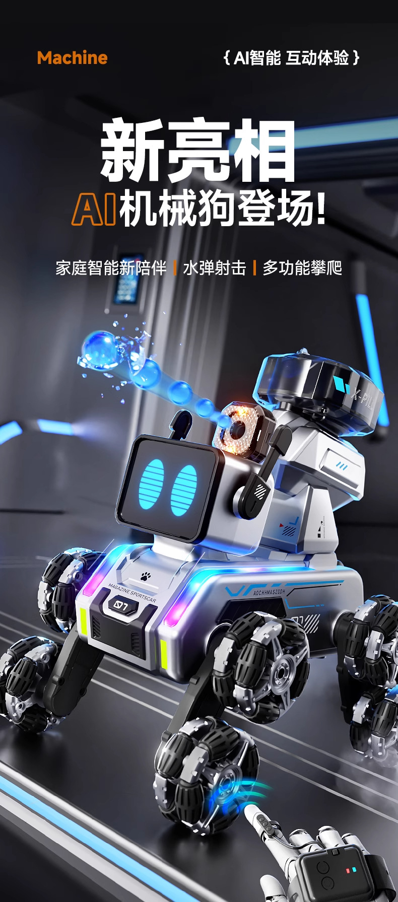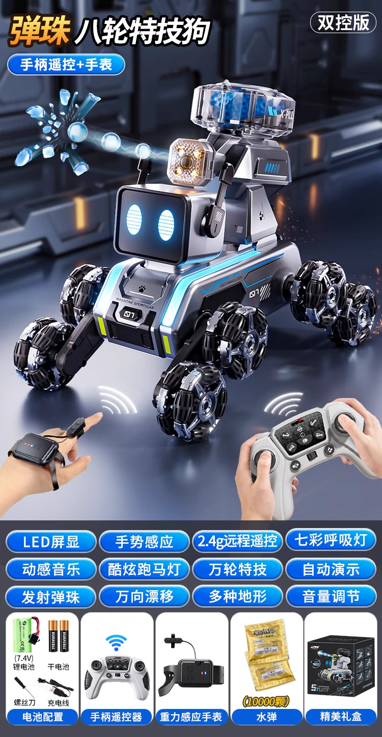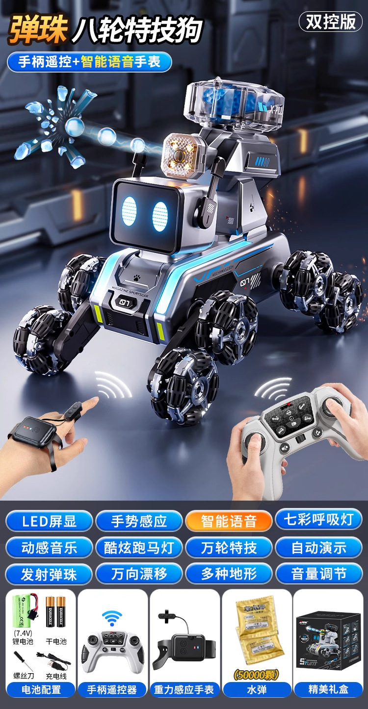 • 업그레이드된 물탄 8륜 스턴트 로봇 강아지 ★ 더블 컨트롤의 선물 상자 버전 [핸들 리모컨 + 시계 + 5W 물폭탄]