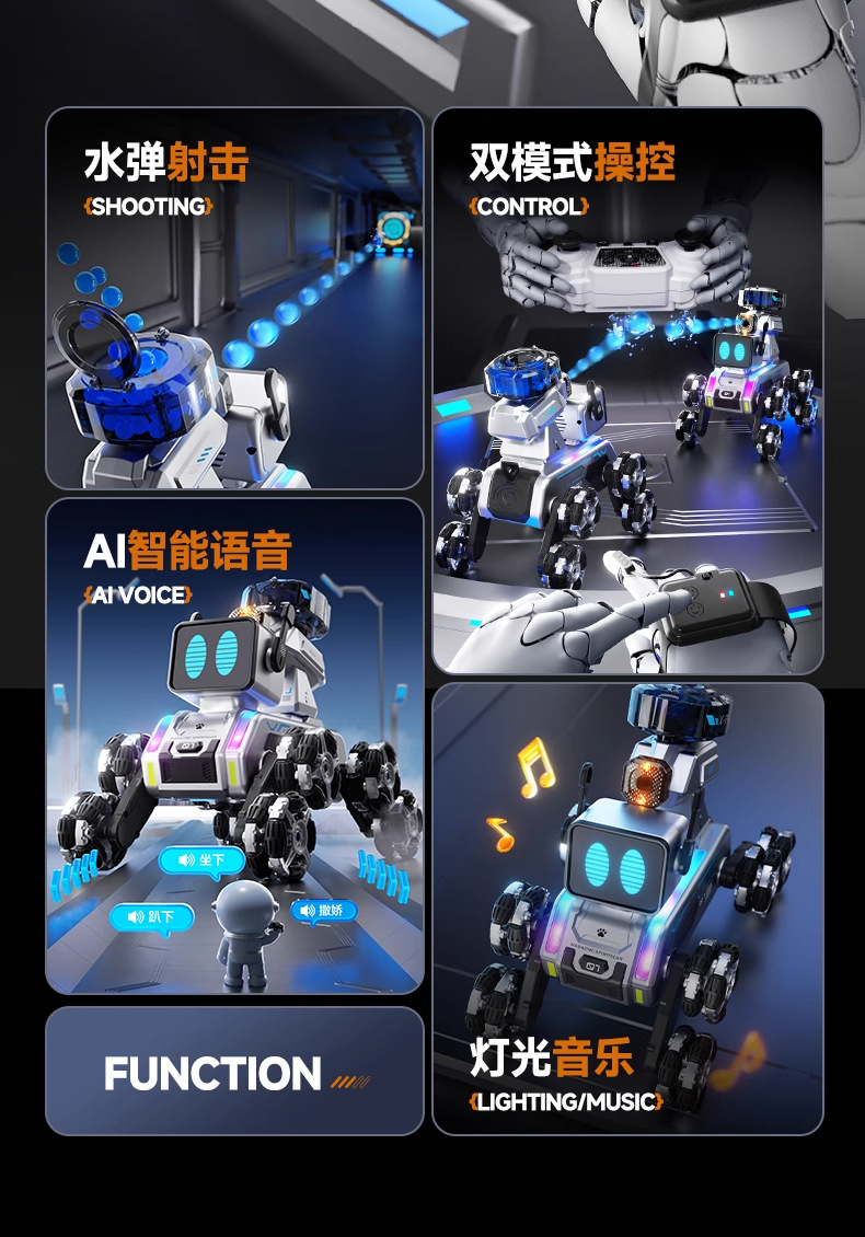 • 업그레이드 버전 - 물탄 8륜 특수 기능 로봇 강아지★더블 컨트롤의 선물 상자 버전 [핸들 리모컨 + 스마트 보이스 워치 + 5W 물폭탄]