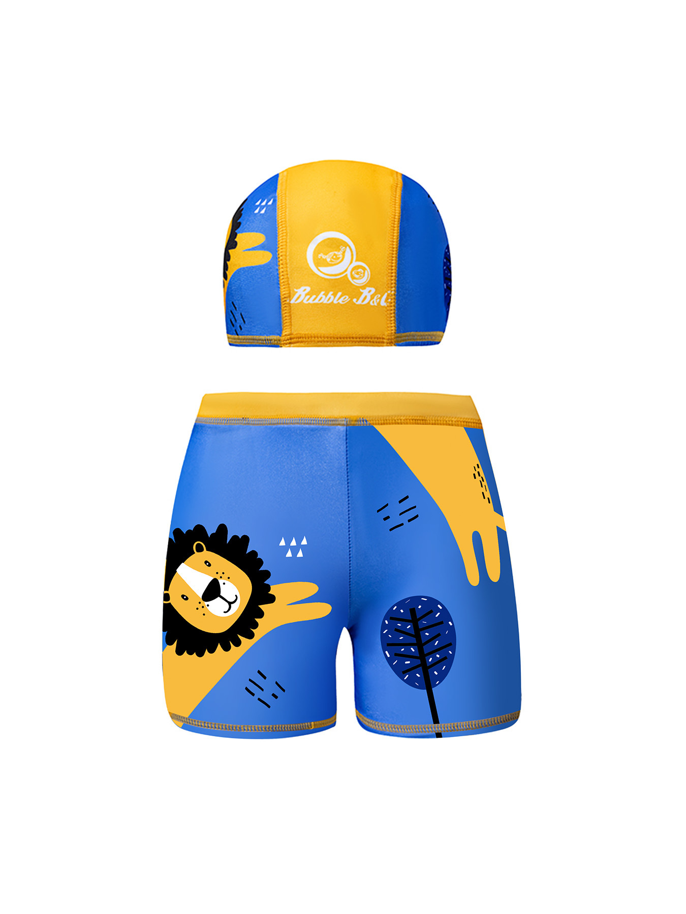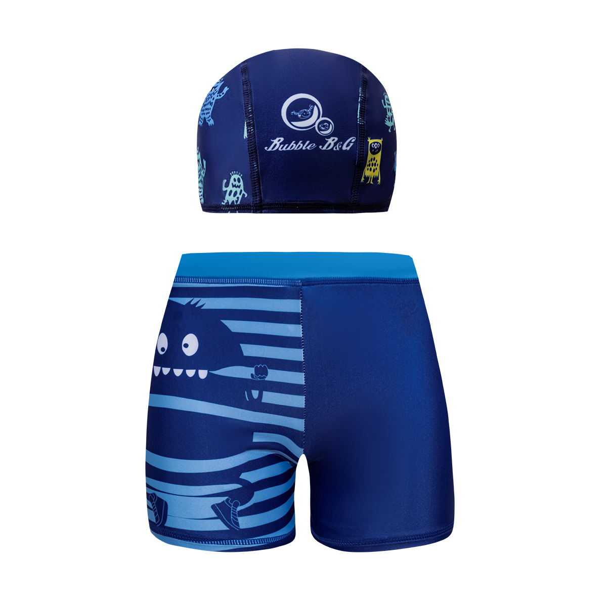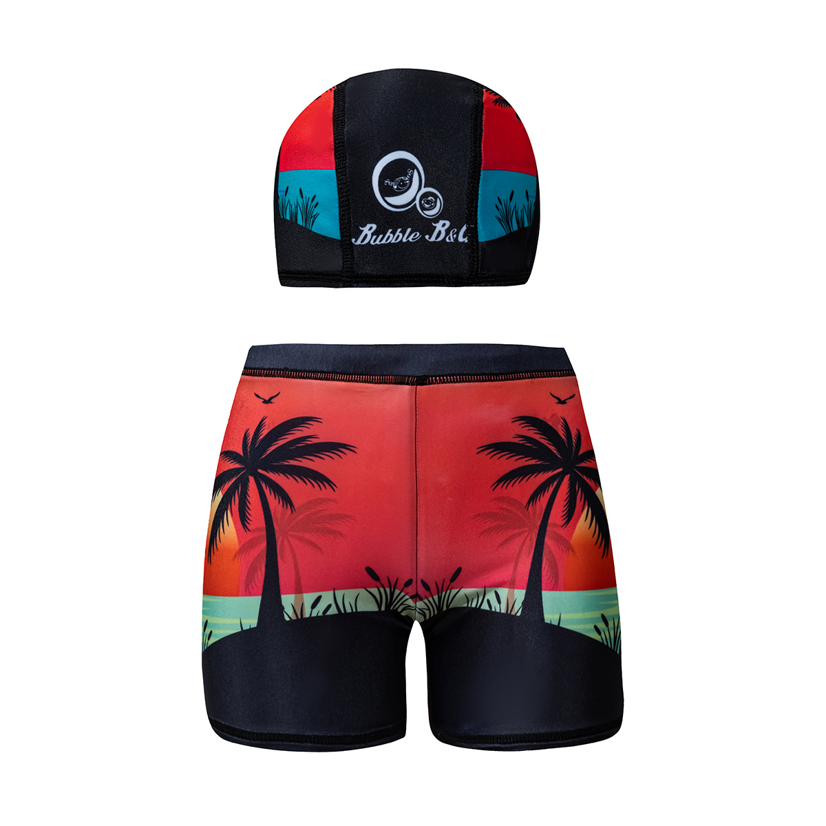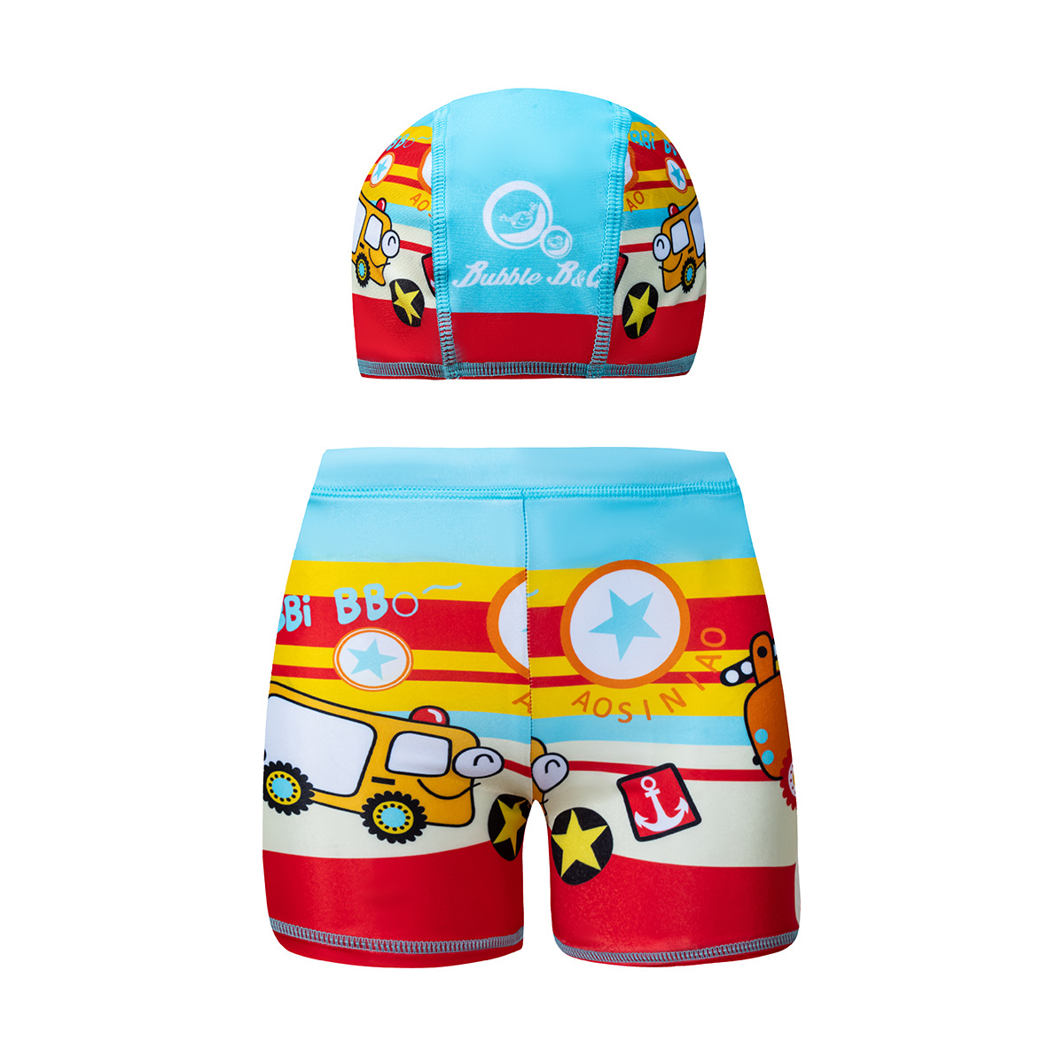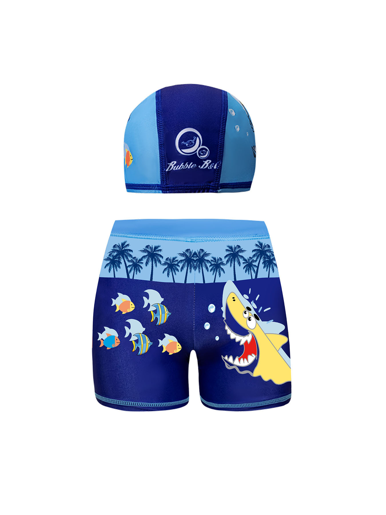 국경 간 어린이 수영 트렁크 소년 수영 트렁크 수영 모자 세트 속건성 만화 인쇄 중형 및 대형 어린이 레이스 업 복서 수영 트렁크