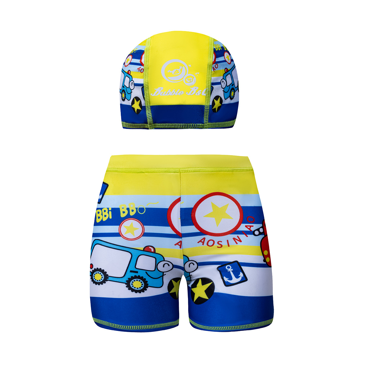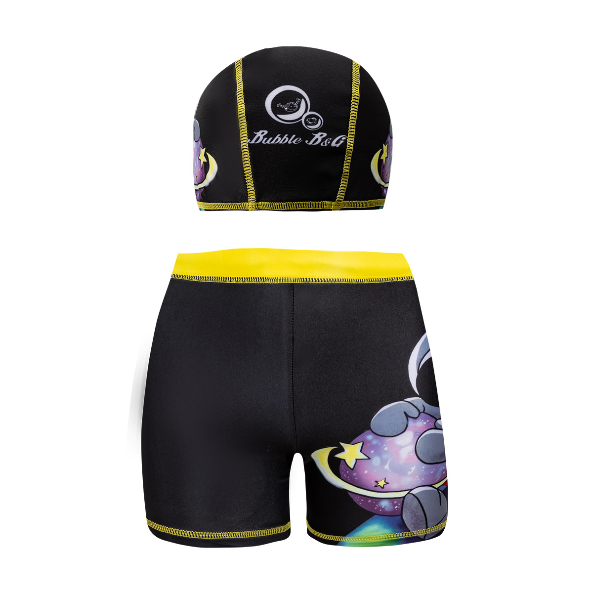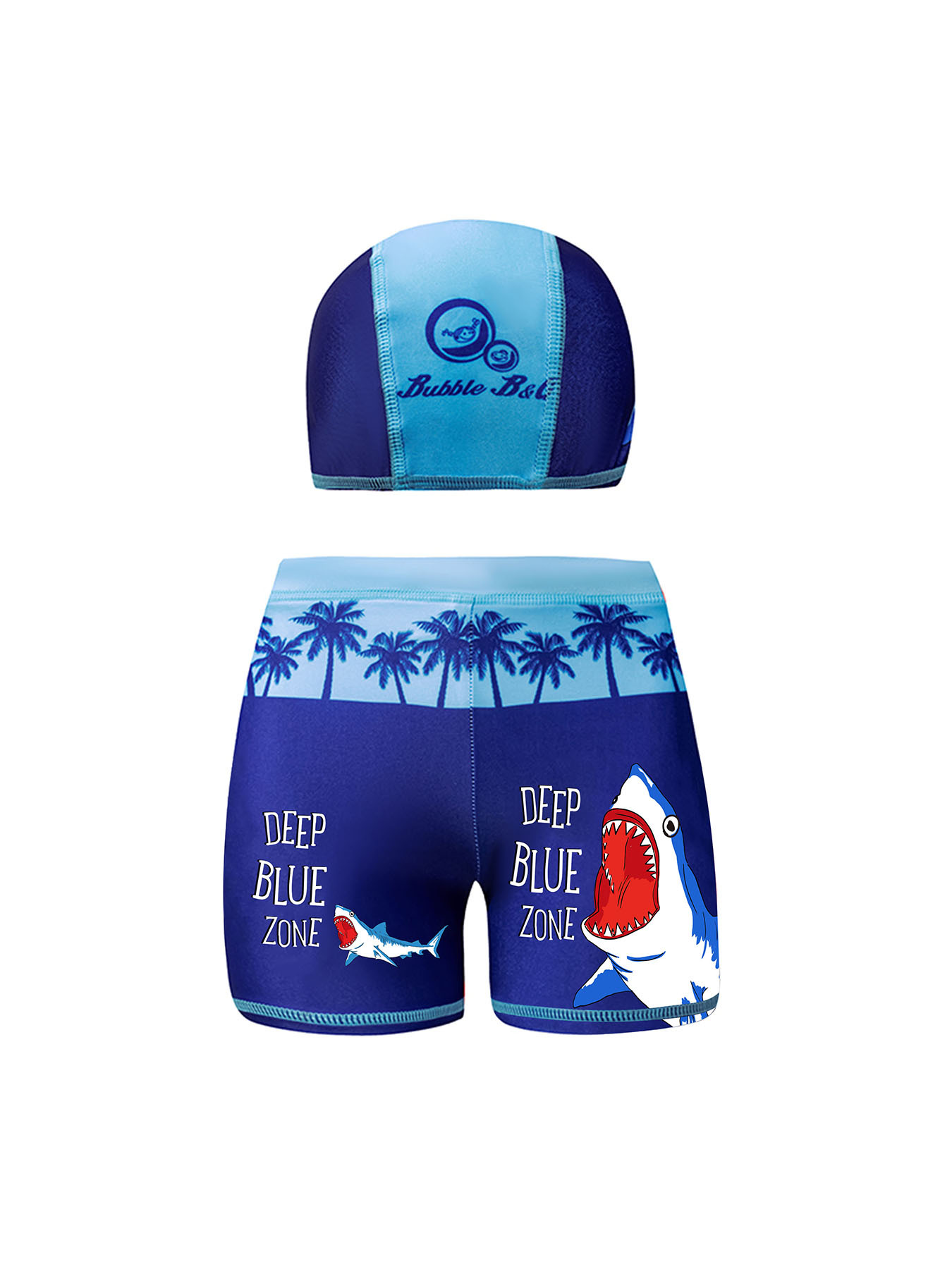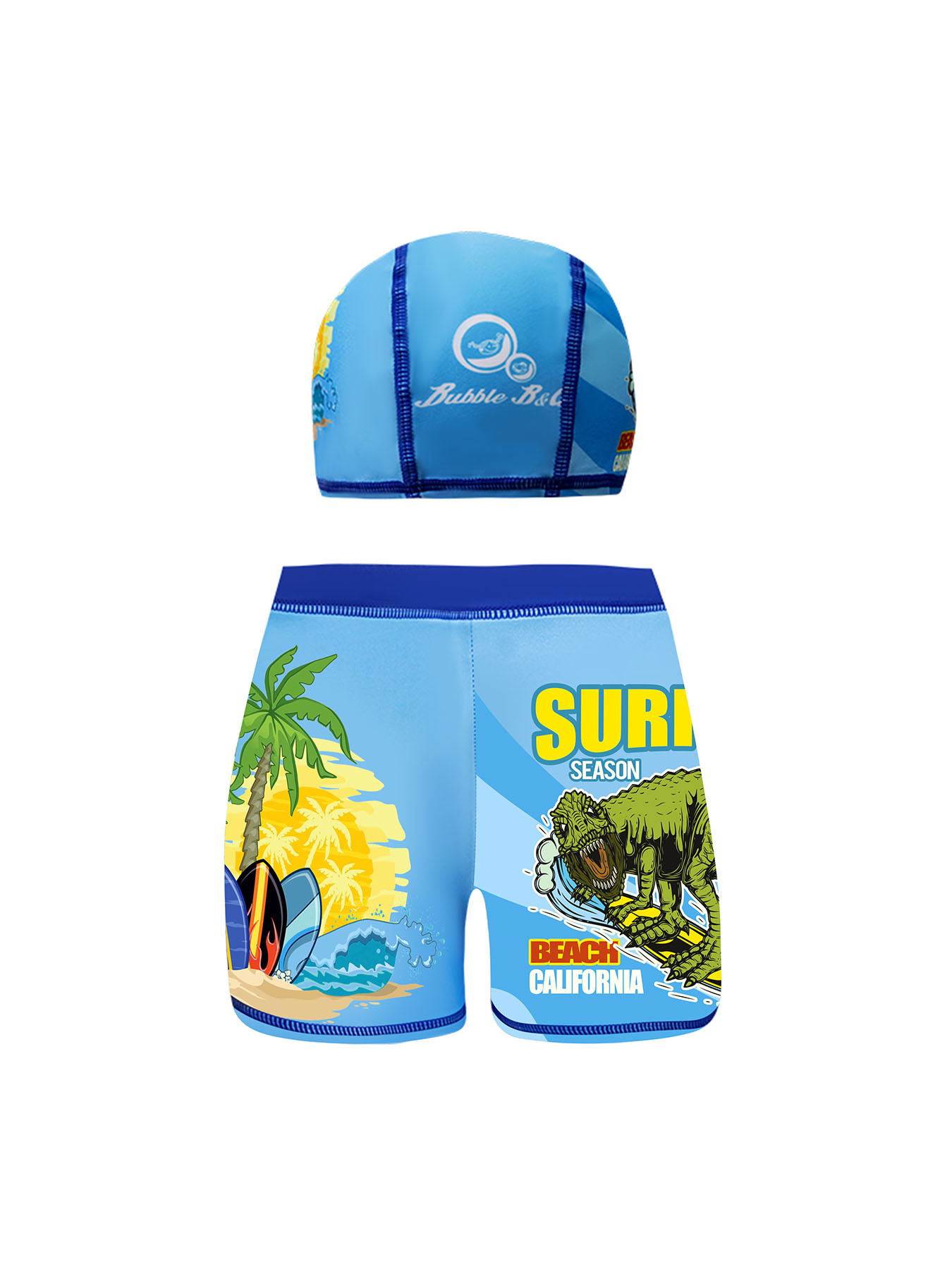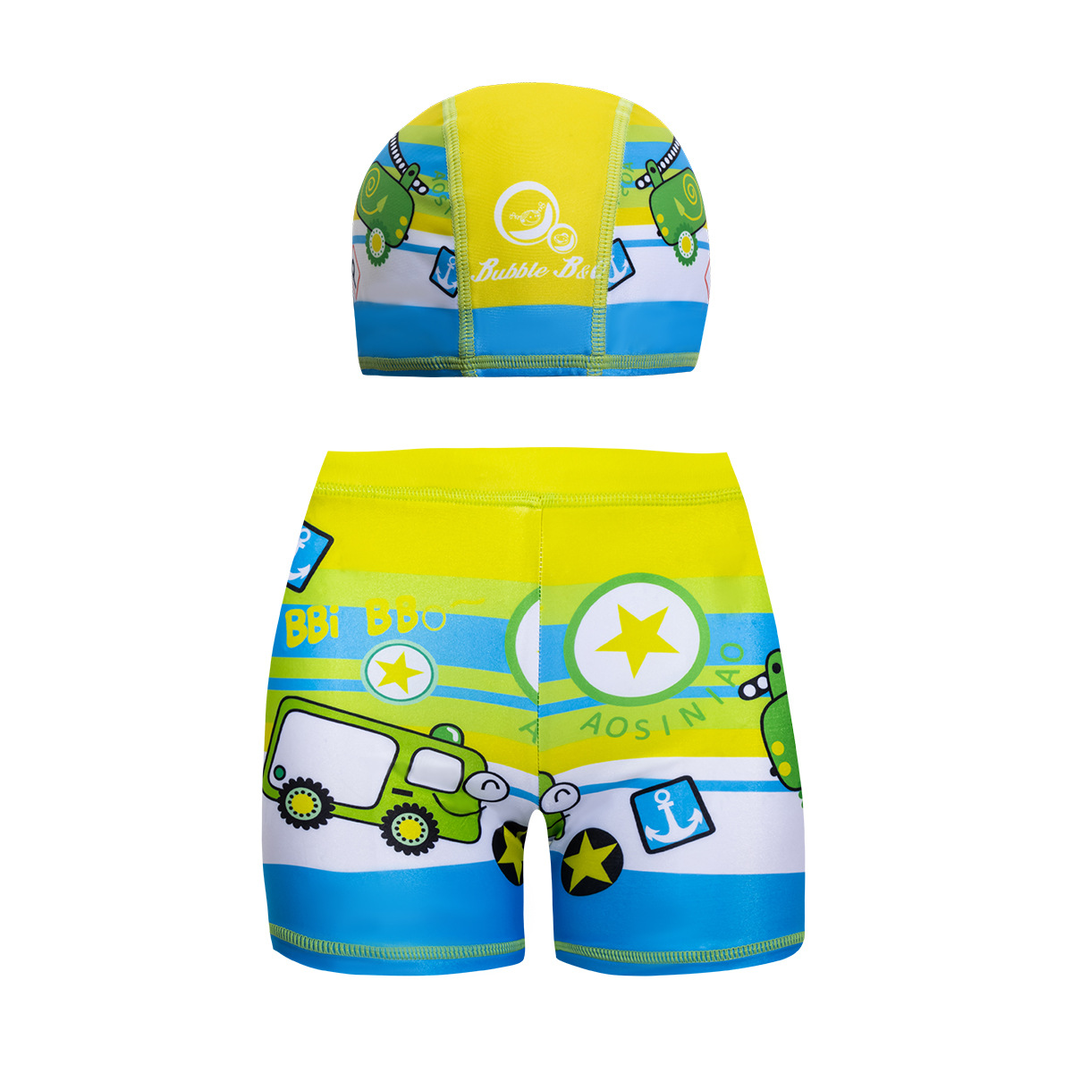 국경 간 어린이 수영 트렁크 소년 수영 트렁크 수영 모자 세트 속건성 만화 인쇄 중형 및 대형 어린이 레이스 업 복서 수영 트렁크