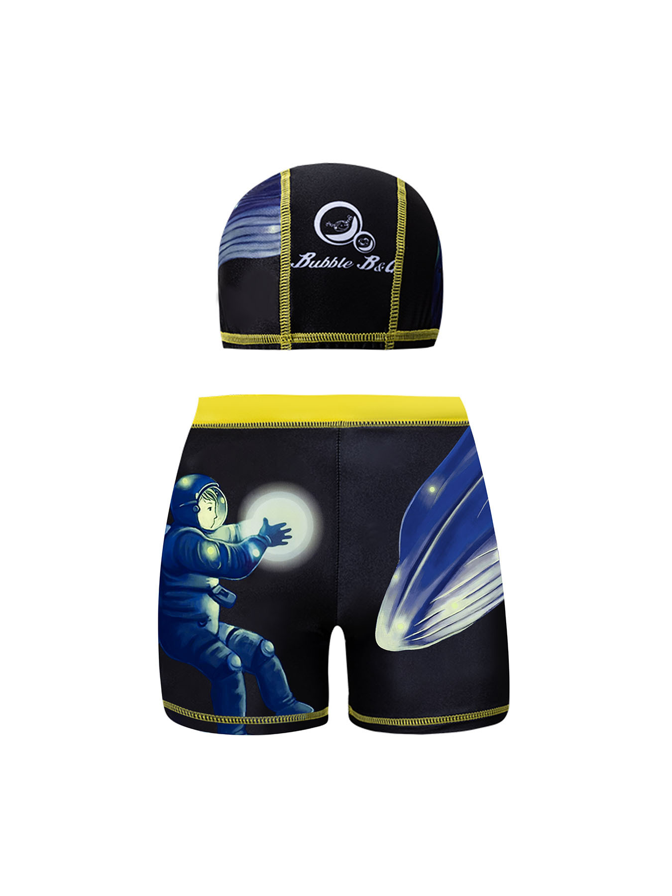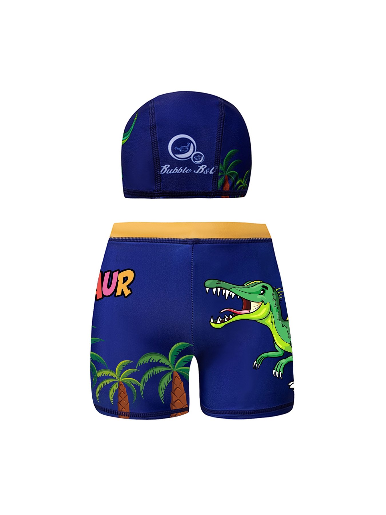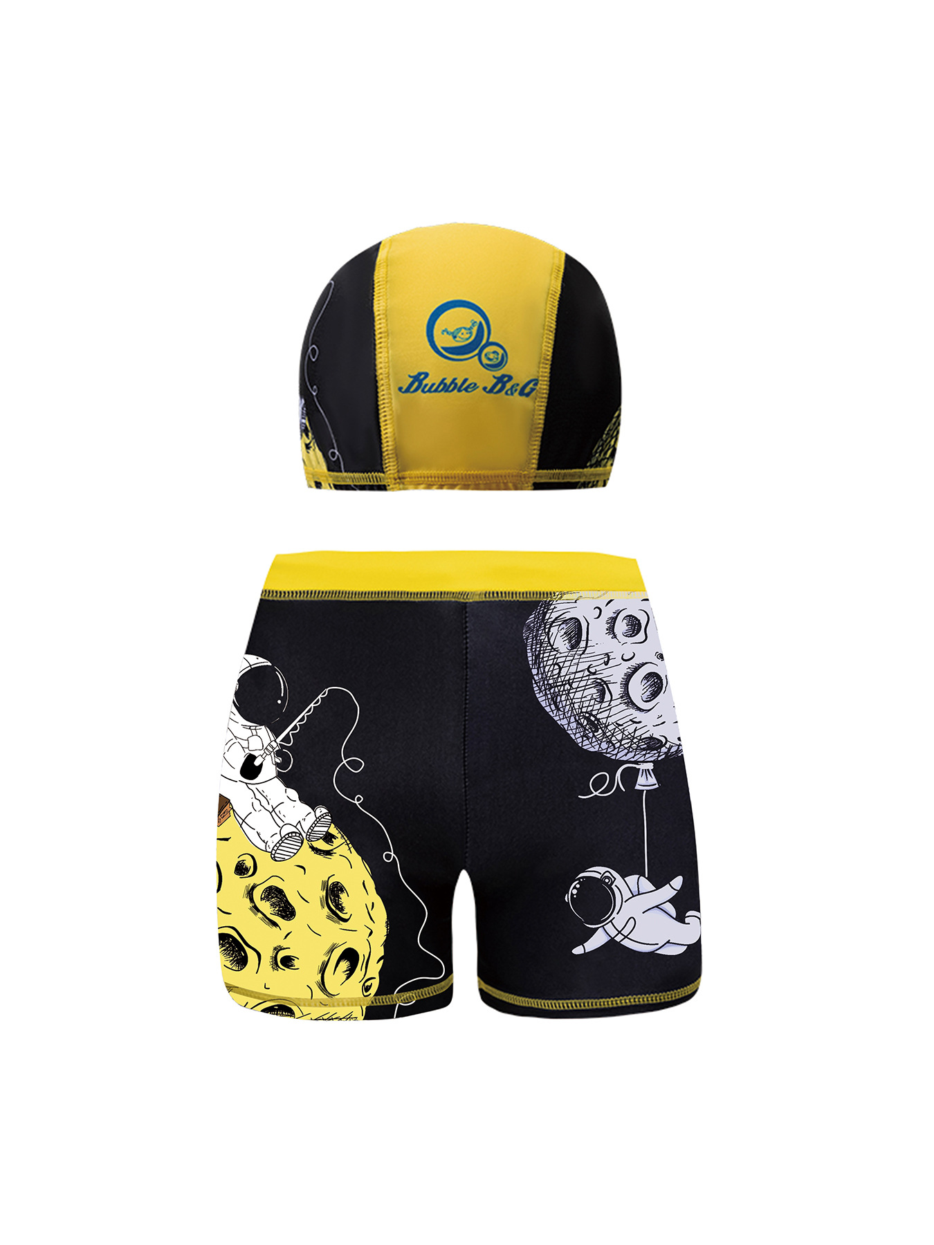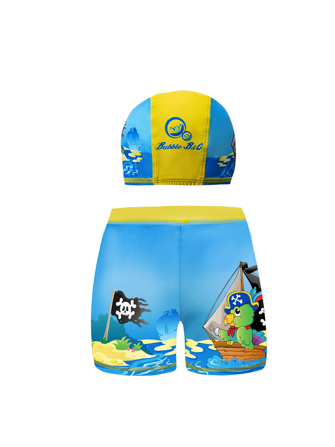 국경 간 어린이 수영 트렁크 소년 수영 트렁크 수영 모자 세트 속건성 만화 인쇄 중형 및 대형 어린이 레이스 업 복서 수영 트렁크