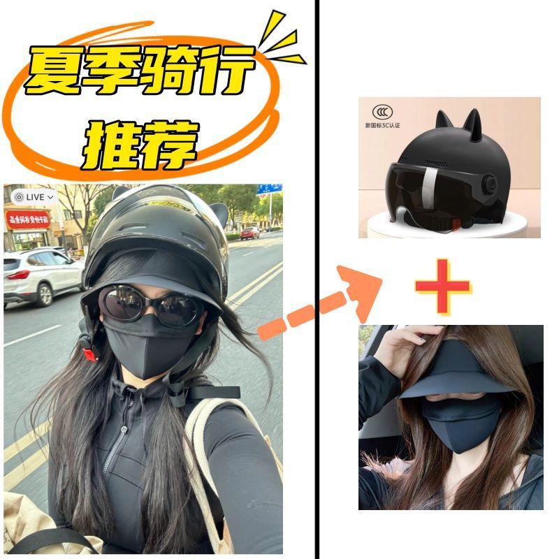 • 검은색 짧은 차 고양이 귀 헬멧 + 자외선 차단 마스크 [선글라스 없음]