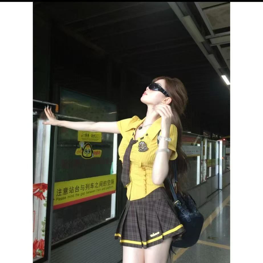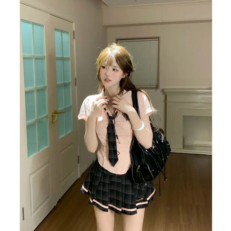 여성을위한 대학 스타일 폴로 칼라 귀 버니 셔츠 정장 여름 하이 웨이스트 스커트 틈새 디자인 반팔 투피스스토어 가기