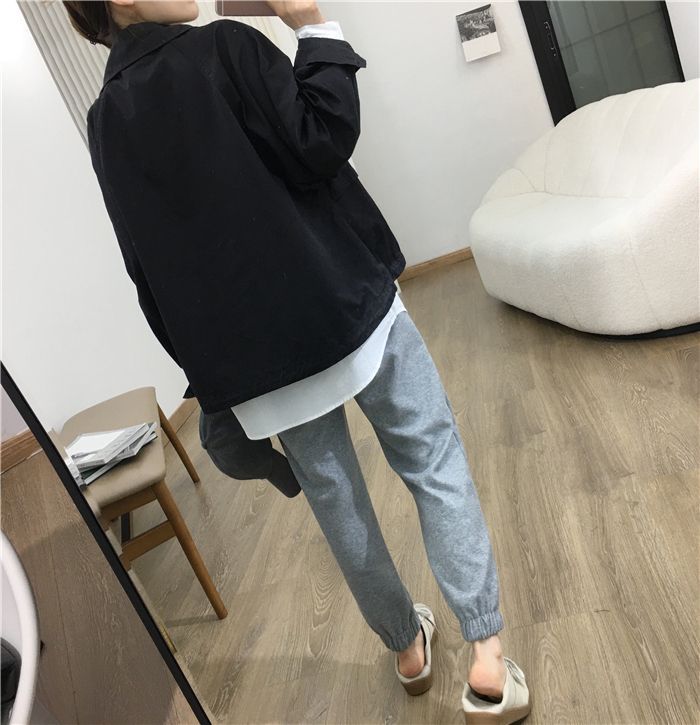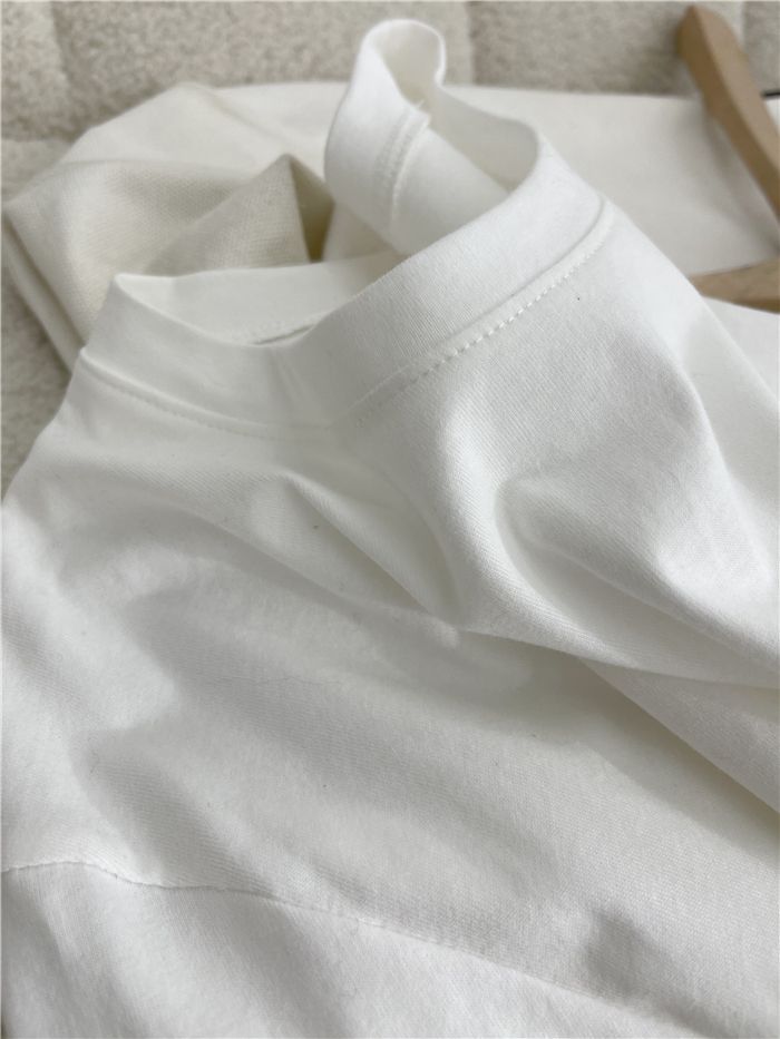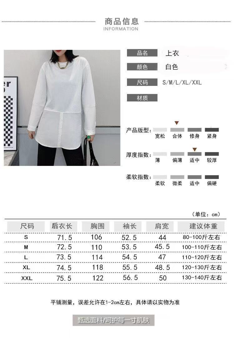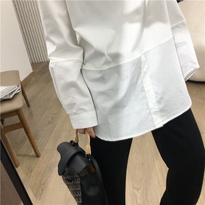 새로운 디자인 심플 코튼 티셔츠 스플라이스 셔츠 한국 스타일 라운드 넥 루즈 화이트 긴팔 셔츠스토어 가기