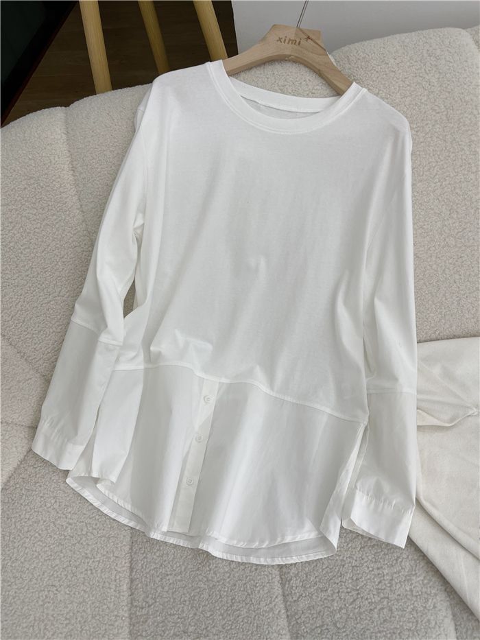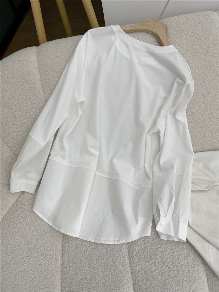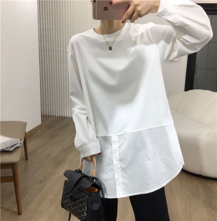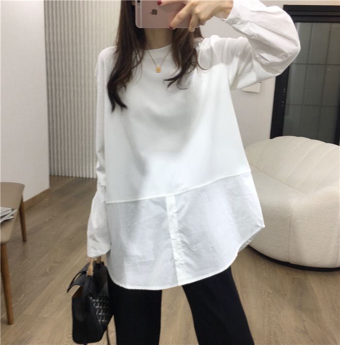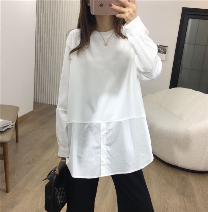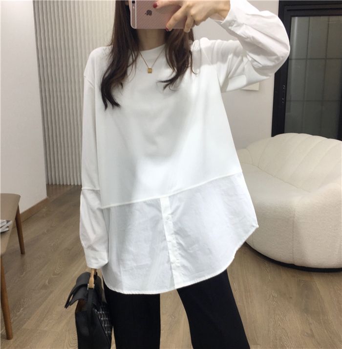 새로운 디자인 심플 코튼 티셔츠 스플라이스 셔츠 한국 스타일 라운드 넥 루즈 화이트 긴팔 셔츠