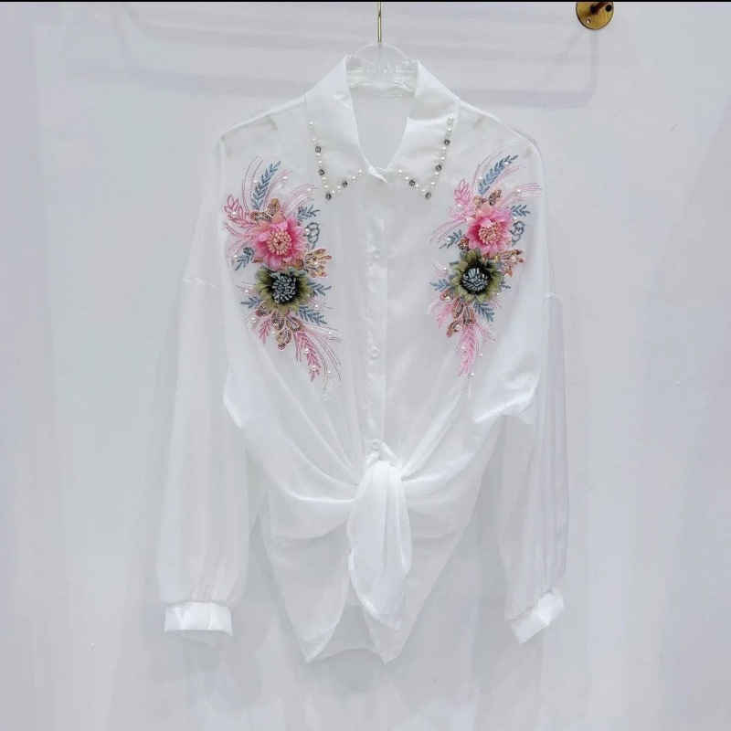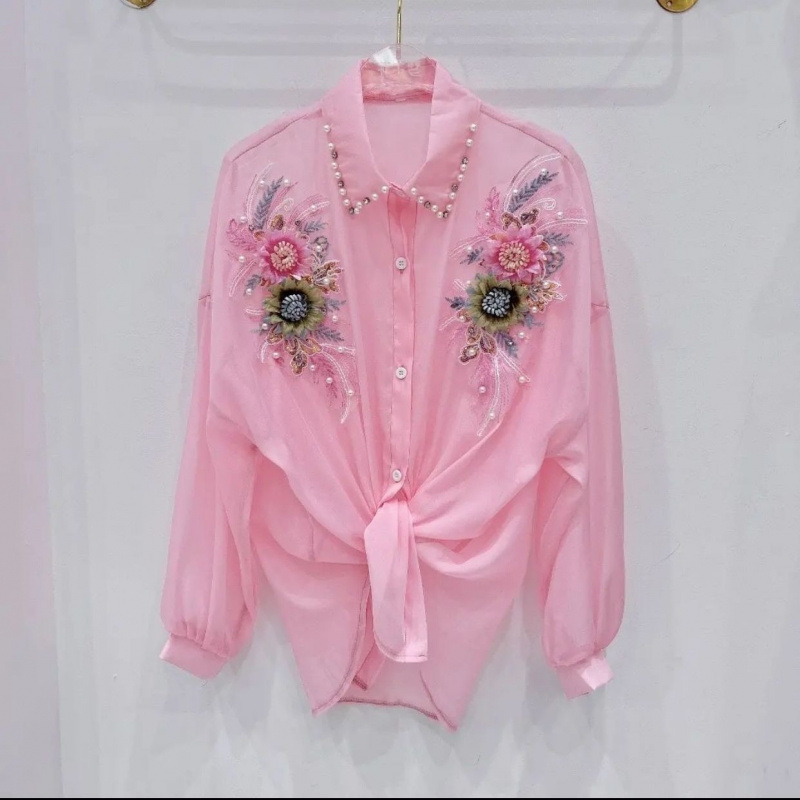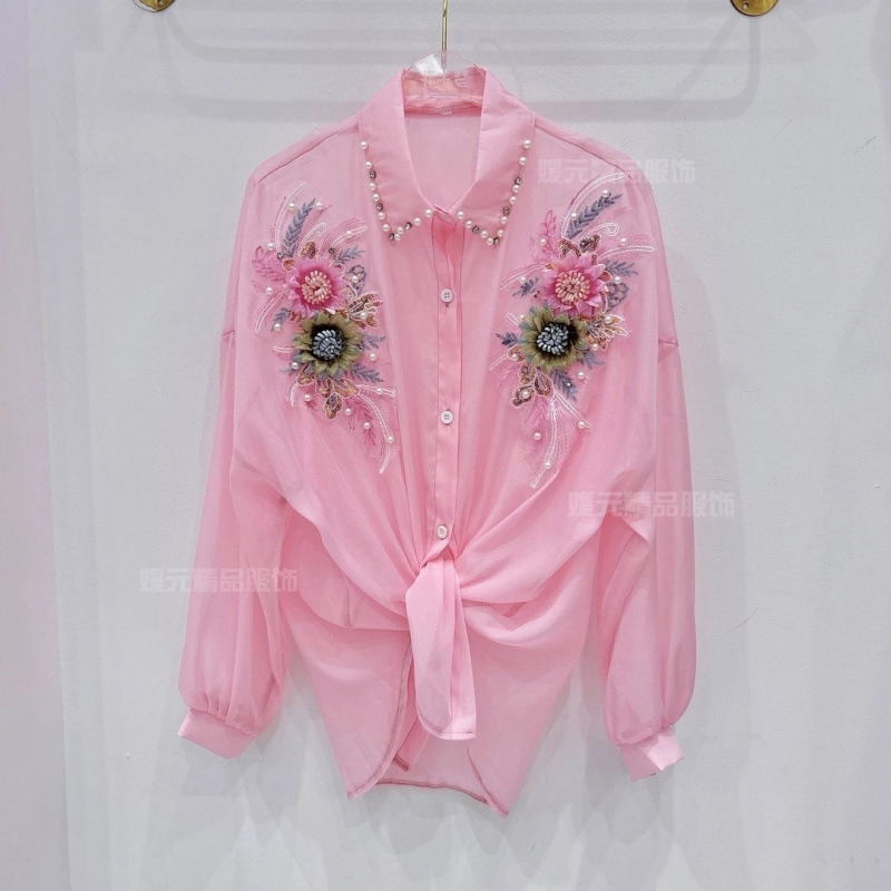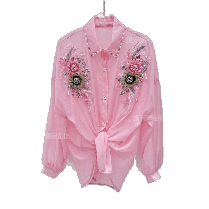 抖音爆款立体花朵钉珠防晒衬衫女重工钉珠镶钻衬衣甜美雪纺上衣