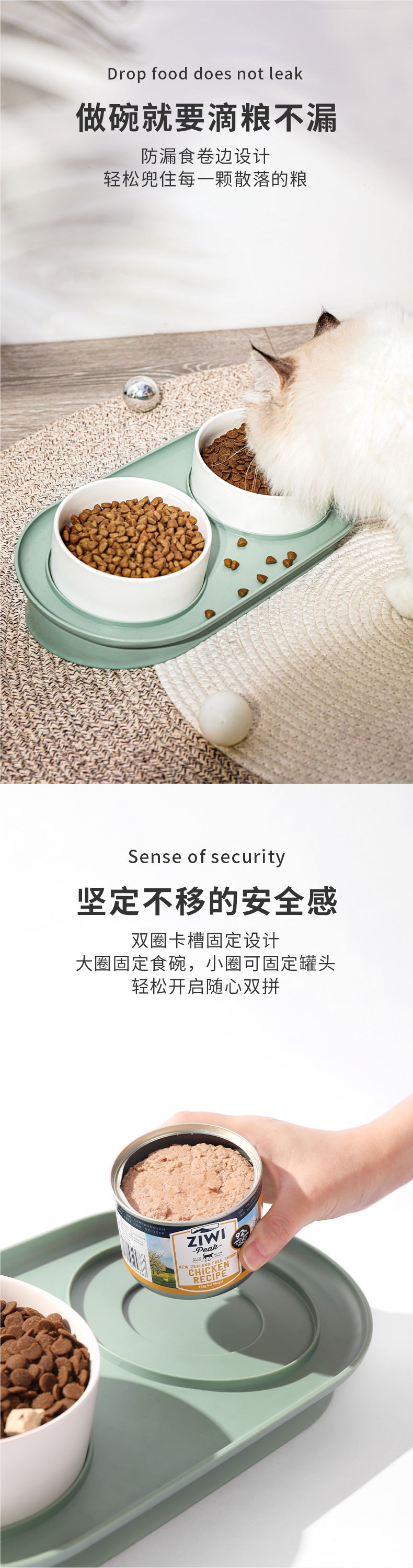 • [누수방지 그릇걸이 + 세라믹 이중그릇 + 미끄럼방지 플레이스매트] 마키노 그린