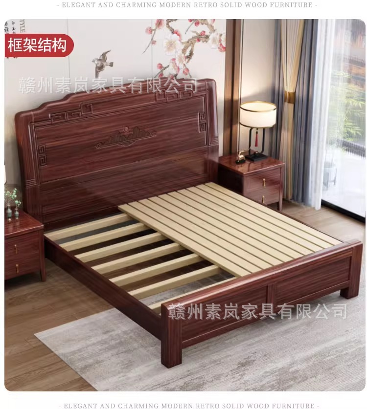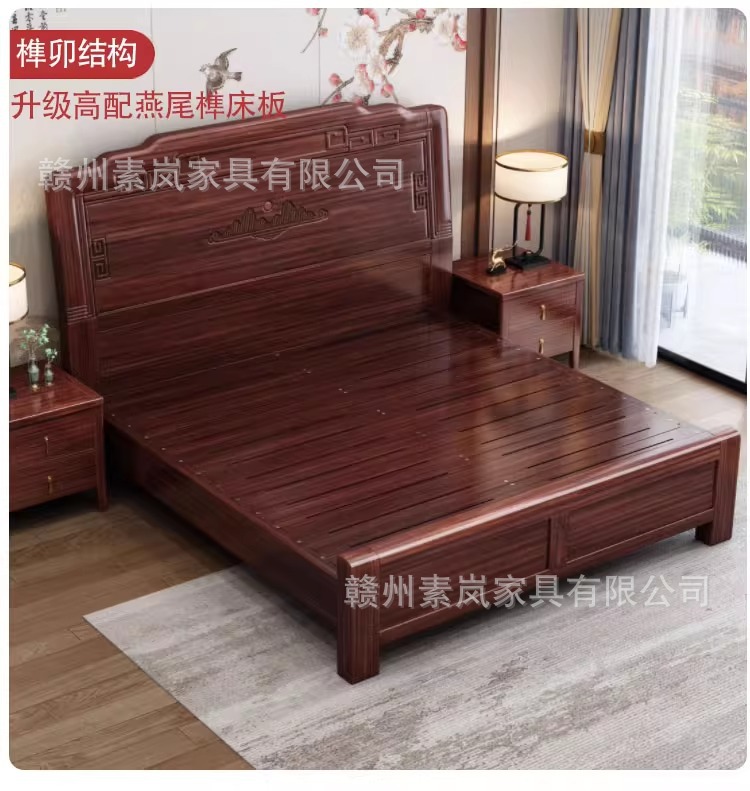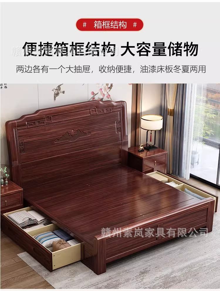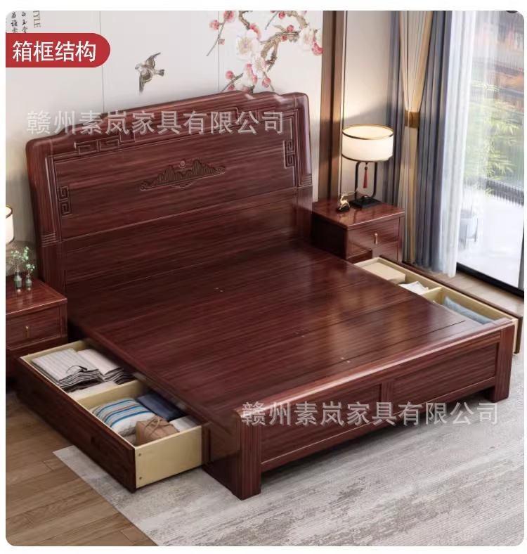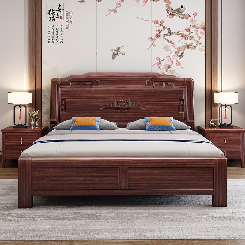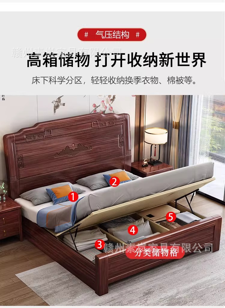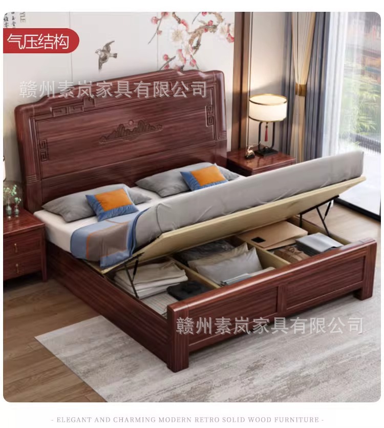 앤티크 조각된 새로운 중국 스타일의 검은색 금색 원목 침대 마스터 침실 1.8M 더블 침대 침실 1.5M 공기압 원목 침대