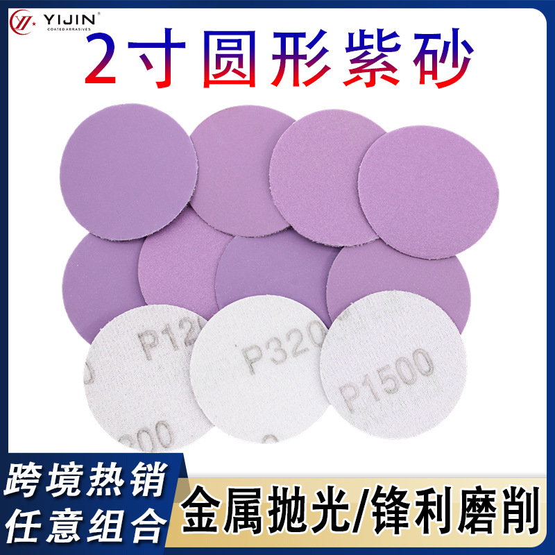 재고 있음 2인치 50mm 자체 접착식 플로킹 보라색 모래 금속 연마 및 연마 사포 막힘 방지 원형 디스크 보라색 모래 종이스토어 가기