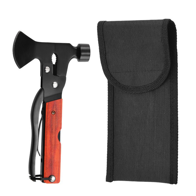• 부드러운 가방에 들어 있는 검은색 도끼 망치와 다채로운 나무 손잡이