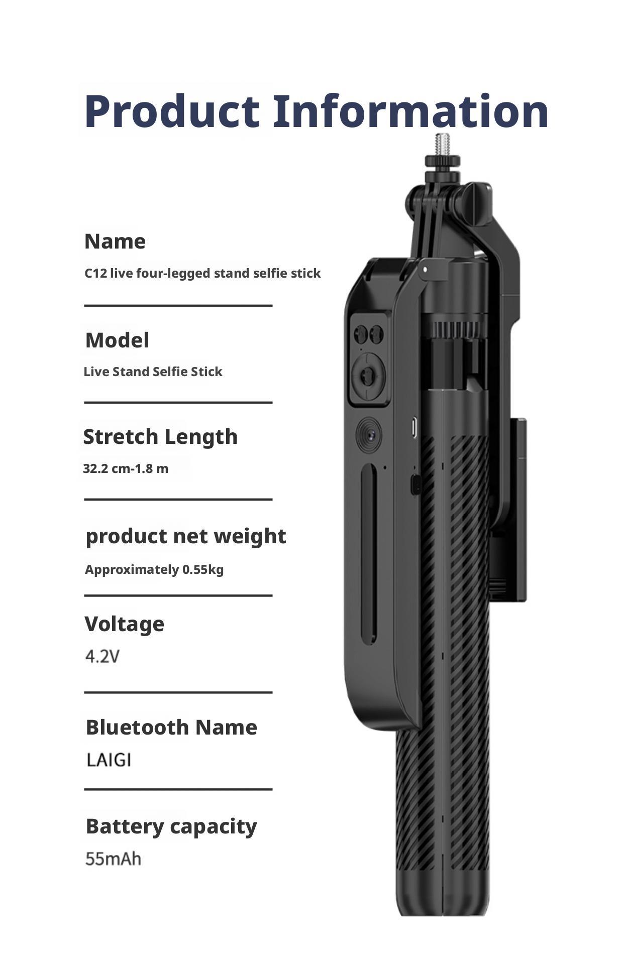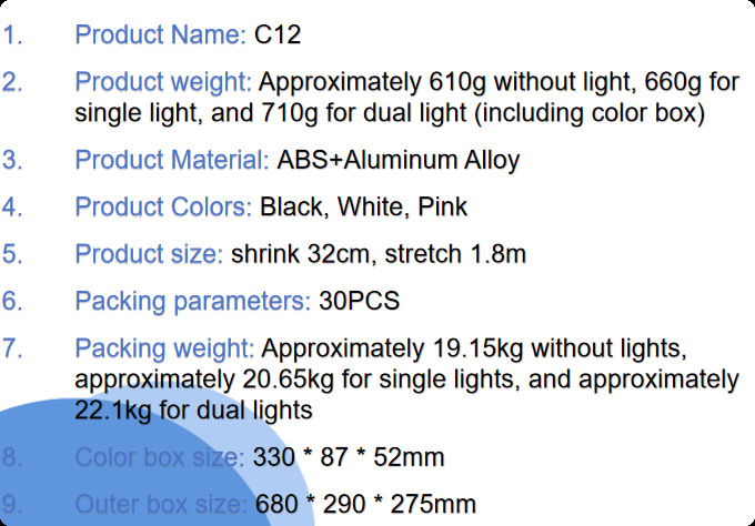 • C12 1.8m + 지능형 얼굴 추적 + Douyin 리모컨 충전 + 이중 대형 원형 조명