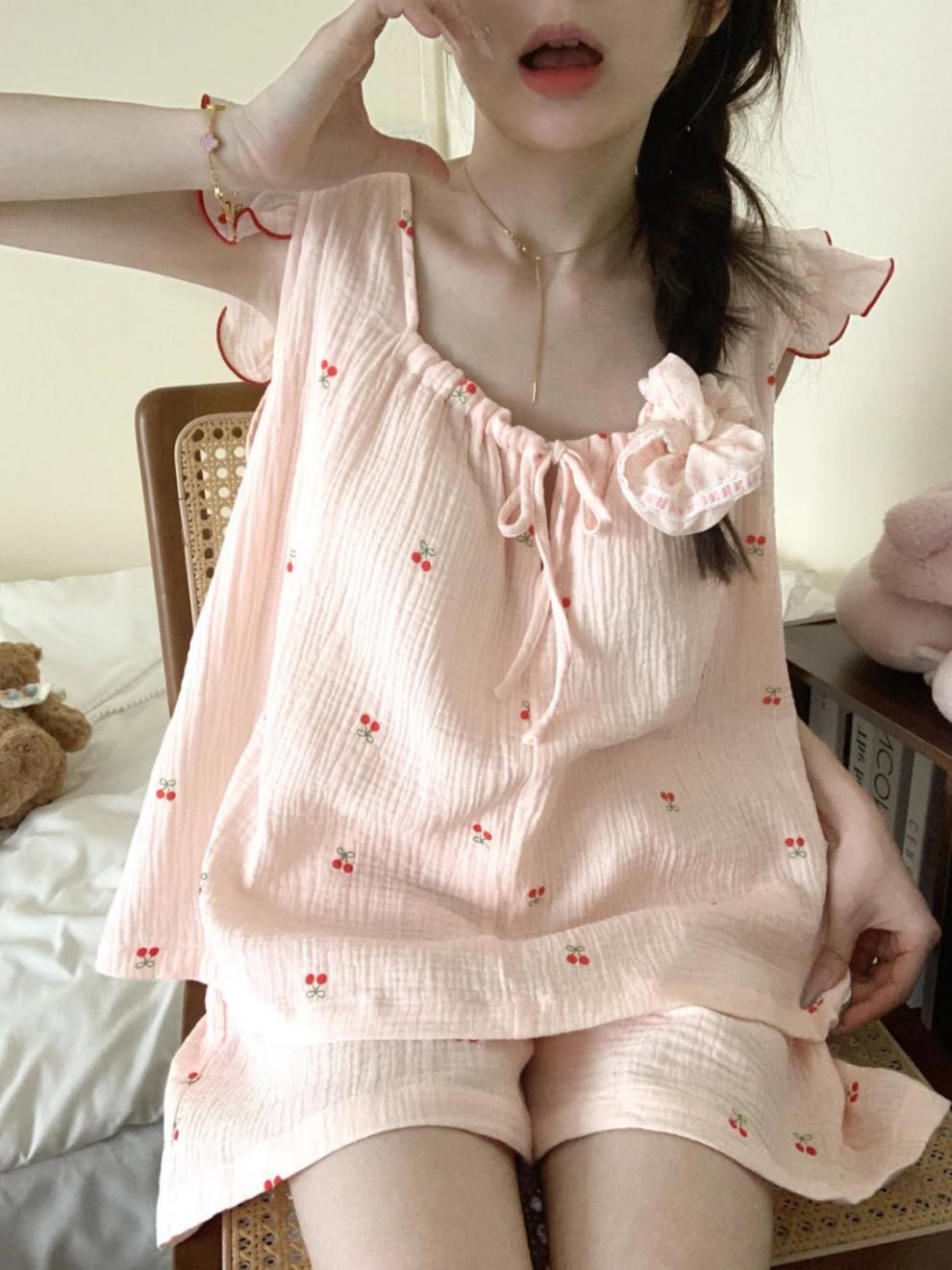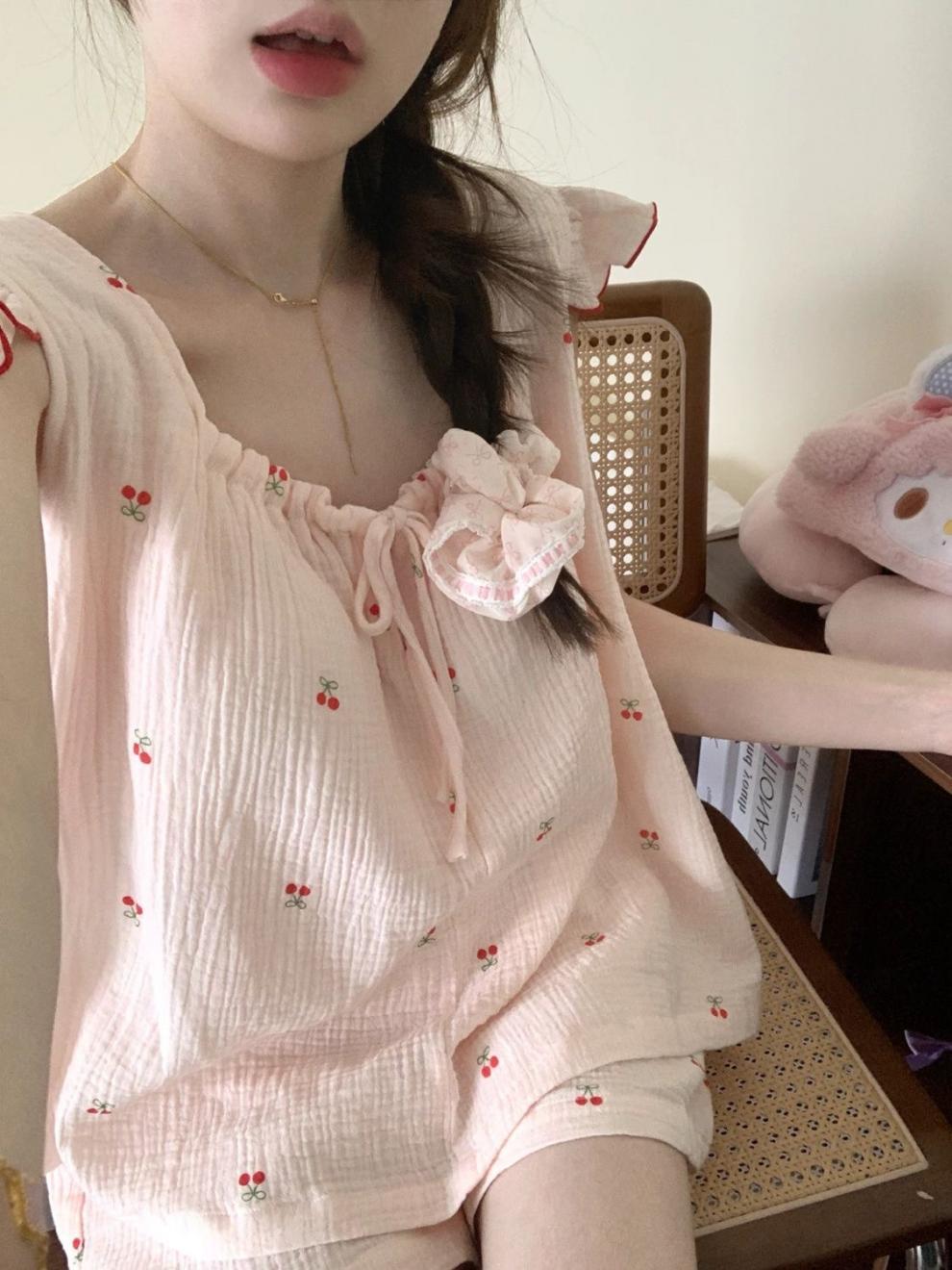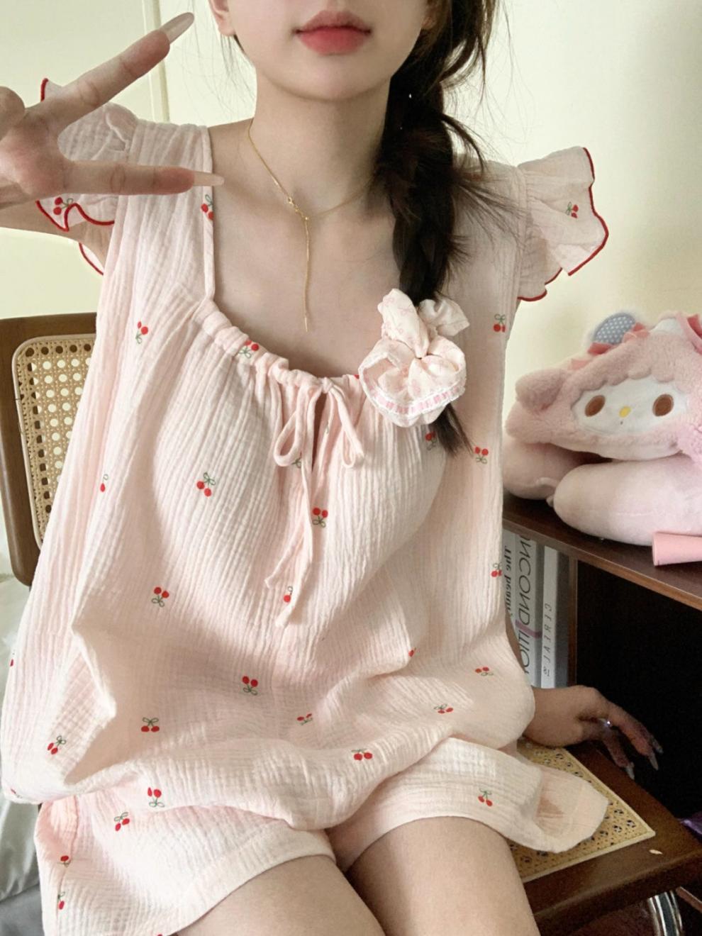 Yunduo 면화 가슴 패드 일본 ins 달콤한 인터넷 연예인 체리 잠옷 소녀 여름 얇은 서스펜더 반바지 정장