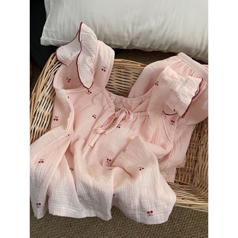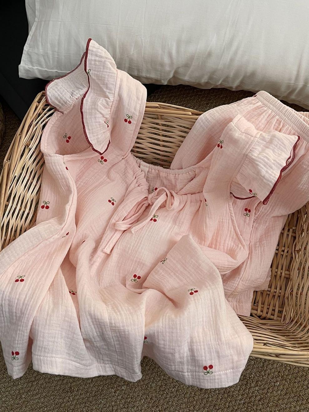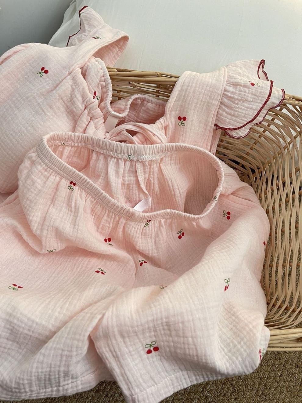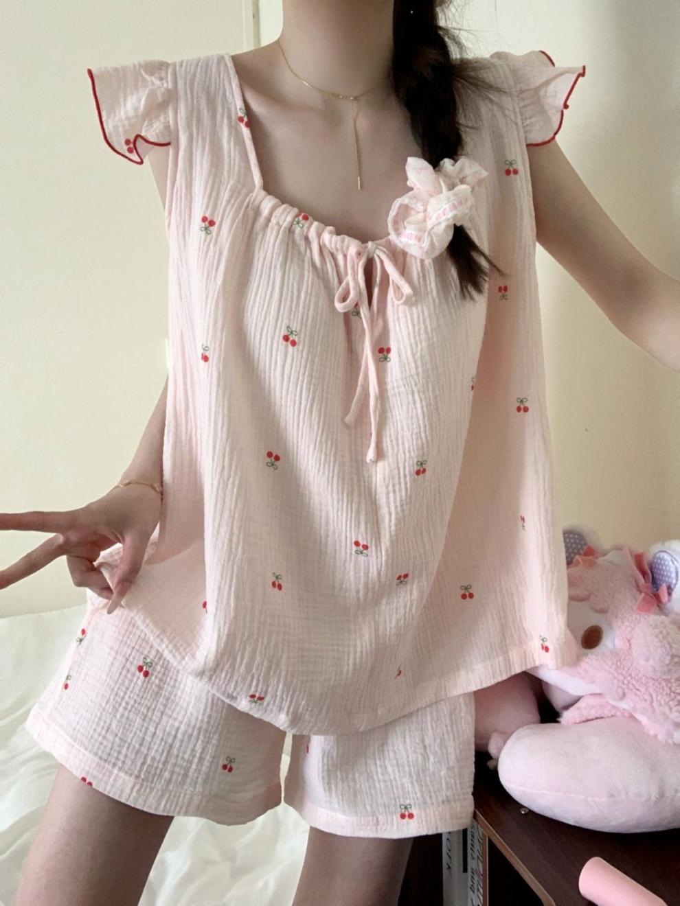 Yunduo 면화 가슴 패드 일본 ins 달콤한 인터넷 연예인 체리 잠옷 소녀 여름 얇은 서스펜더 반바지 정장
