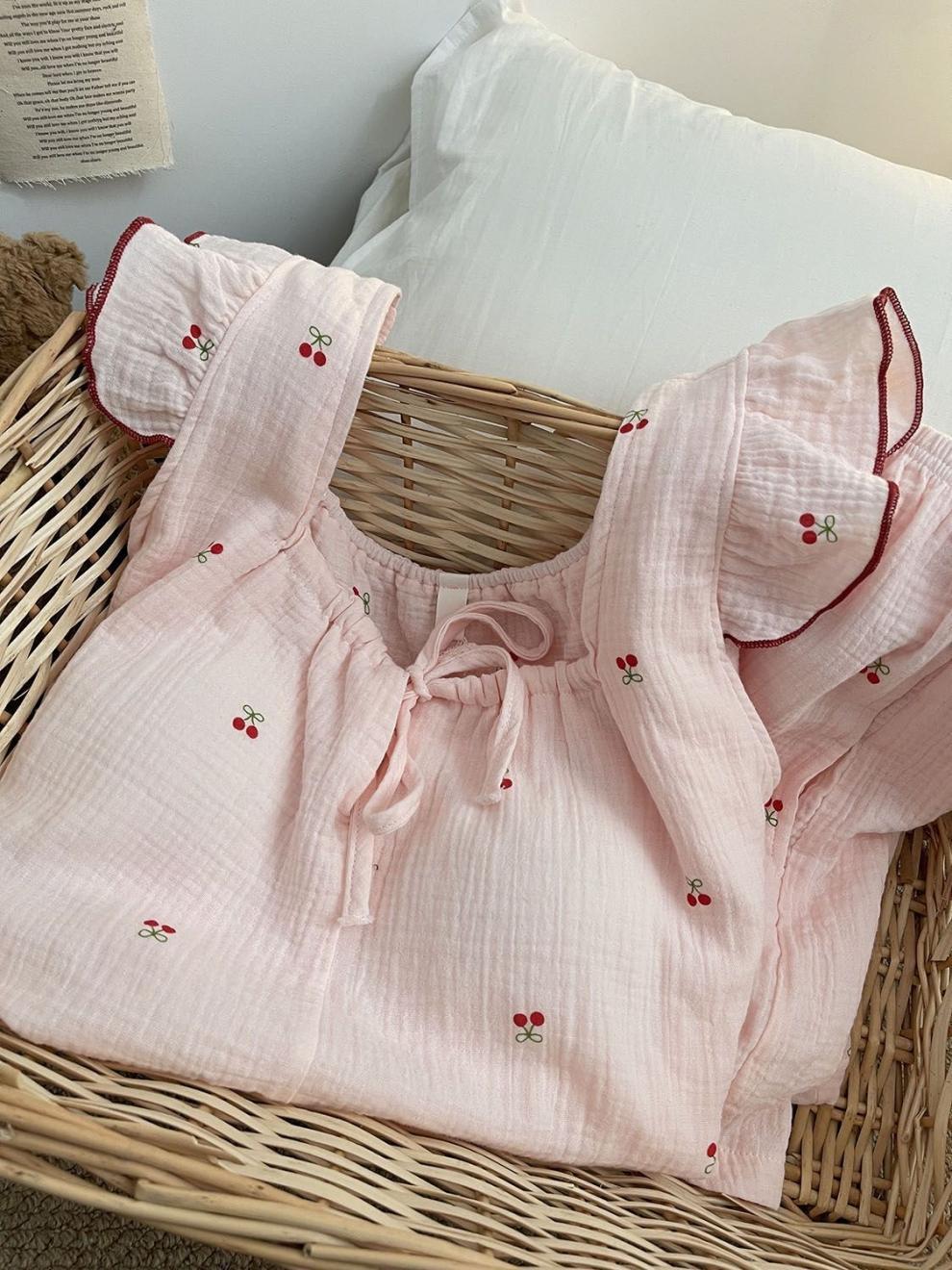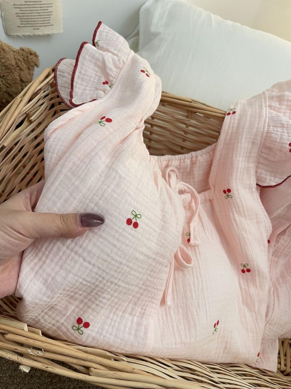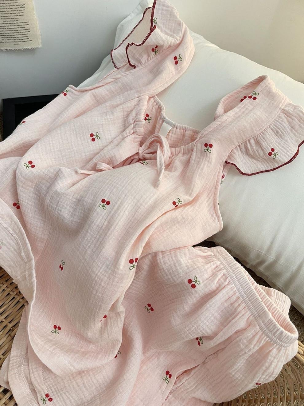 Yunduo 면화 가슴 패드 일본 ins 달콤한 인터넷 연예인 체리 잠옷 소녀 여름 얇은 서스펜더 반바지 정장스토어 가기