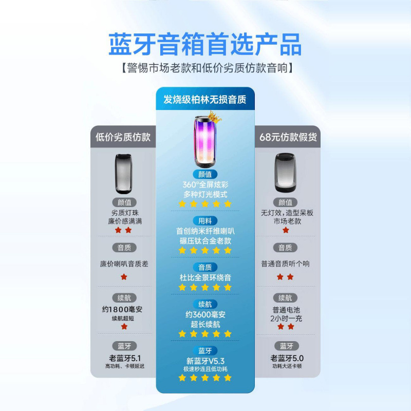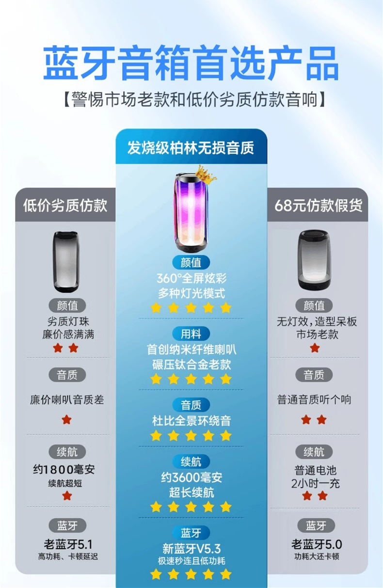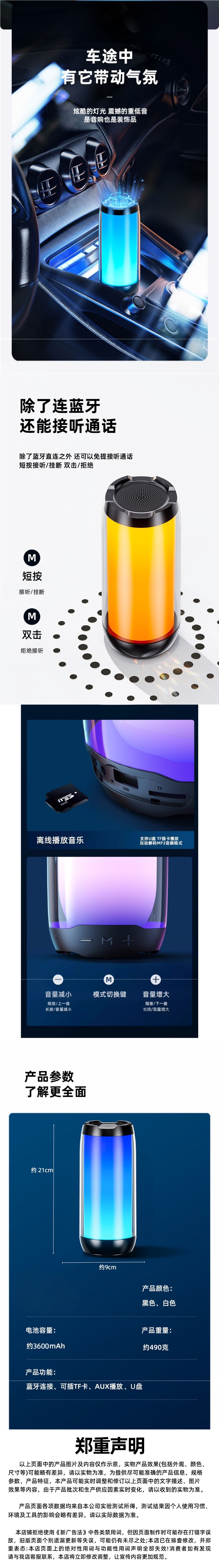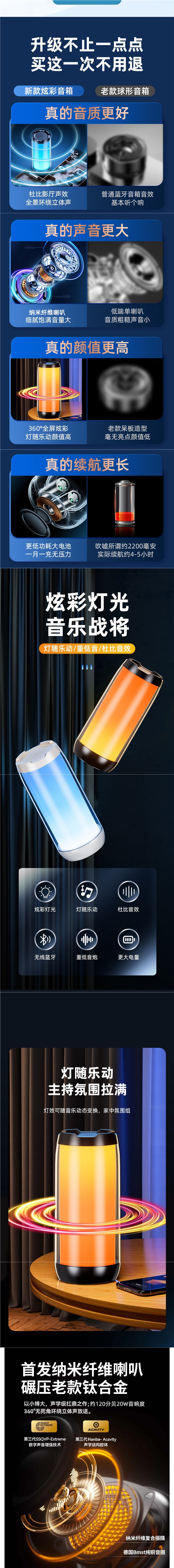 • 상위 버전은 패셔너블한 흰색, 약 120데시벨의 초대형 볼륨, 최초의 나노섬유 다이어프램, USB 플래시 드라이브 삽입 가능, 3600mAh의 매우 긴 배터리 수명, Bluetooth 5.3입니다.