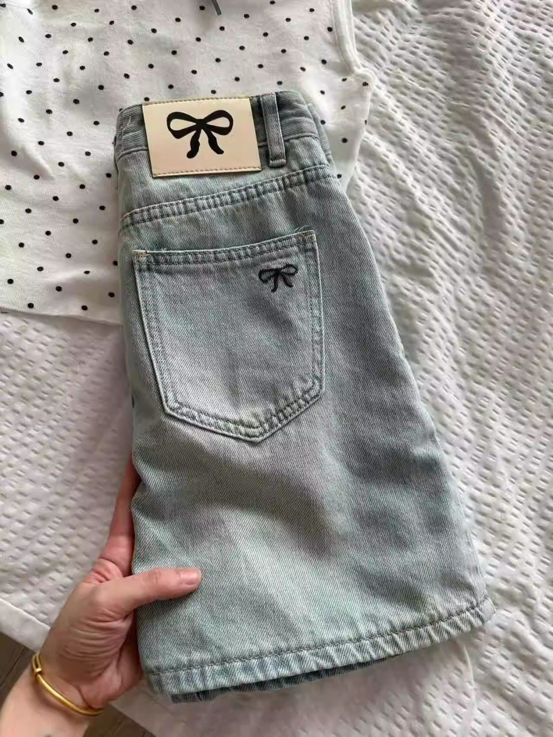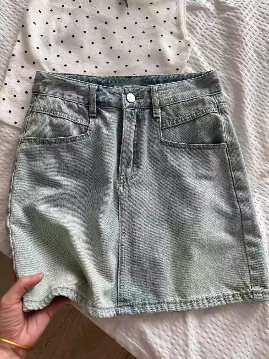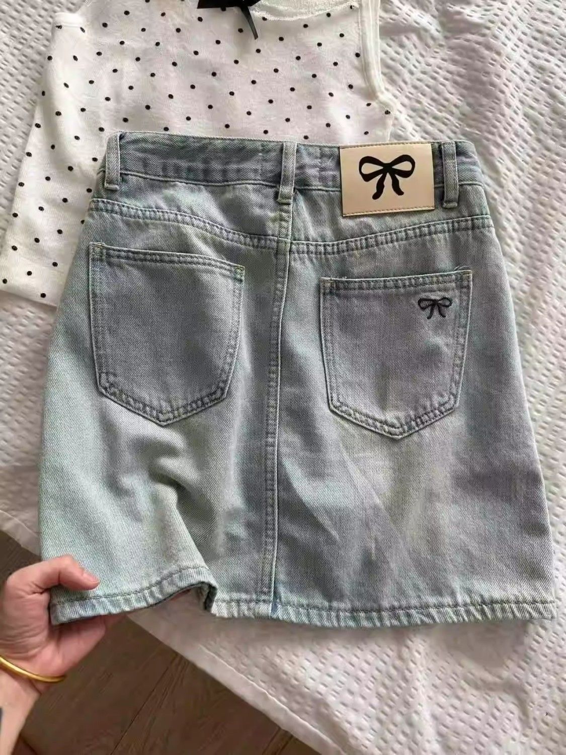 여름 핫걸을 위한 밝은 색상의 복고풍 리본 자수 데님 스커트, 엉덩이를 덮는 미니 스커트, A라인 슬리밍 스커트스토어 가기