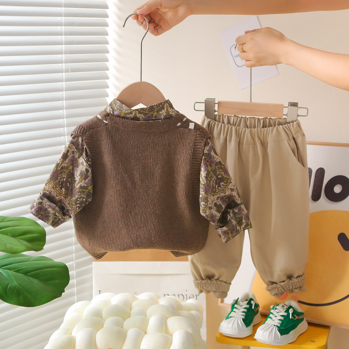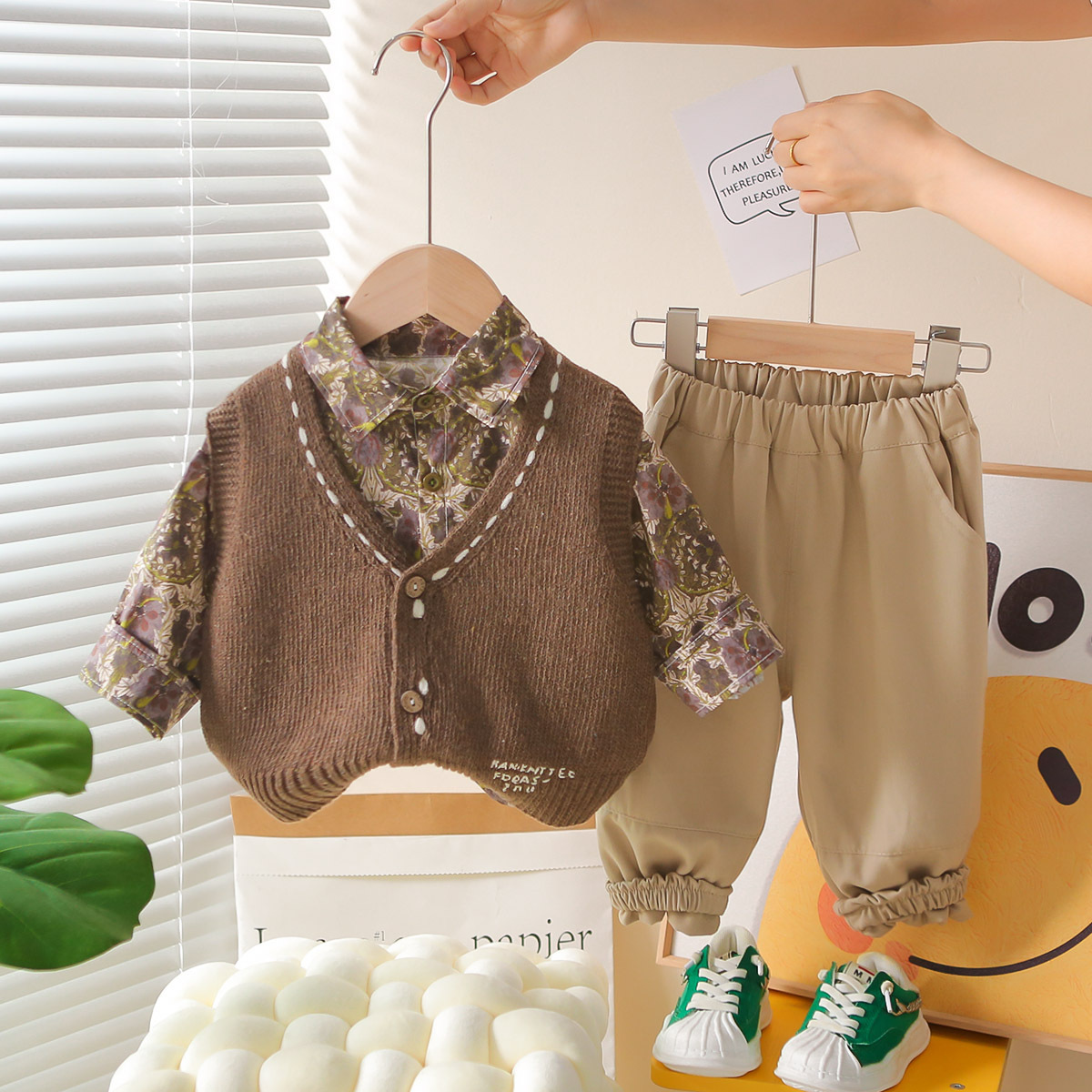 소년 정장 봄과 가을 새로운 캐주얼 패션 꽃무늬 셔츠 스웨터 카디건 3피스 세트 아동 봄과 가을 의류 트렌드스토어 가기
