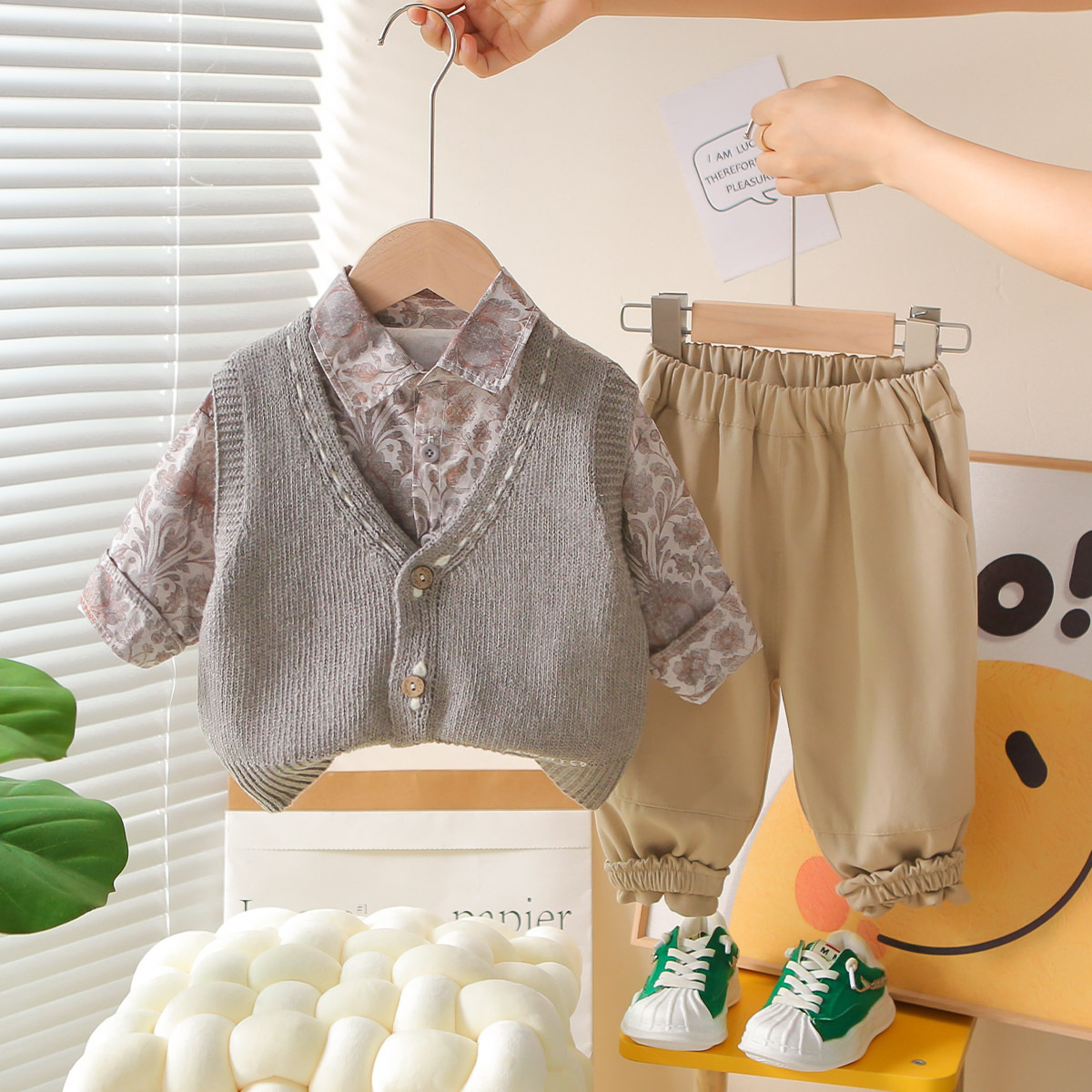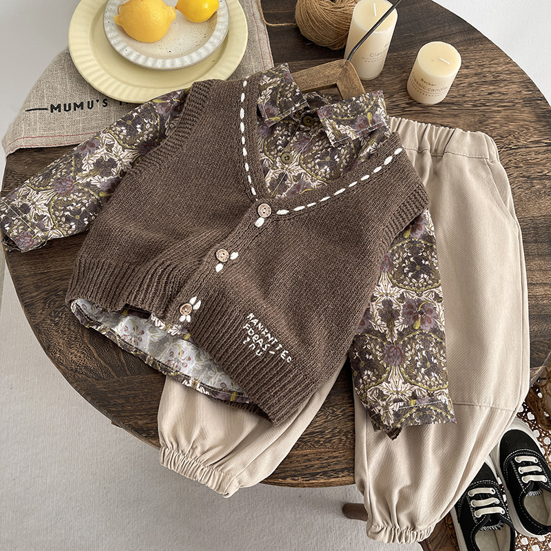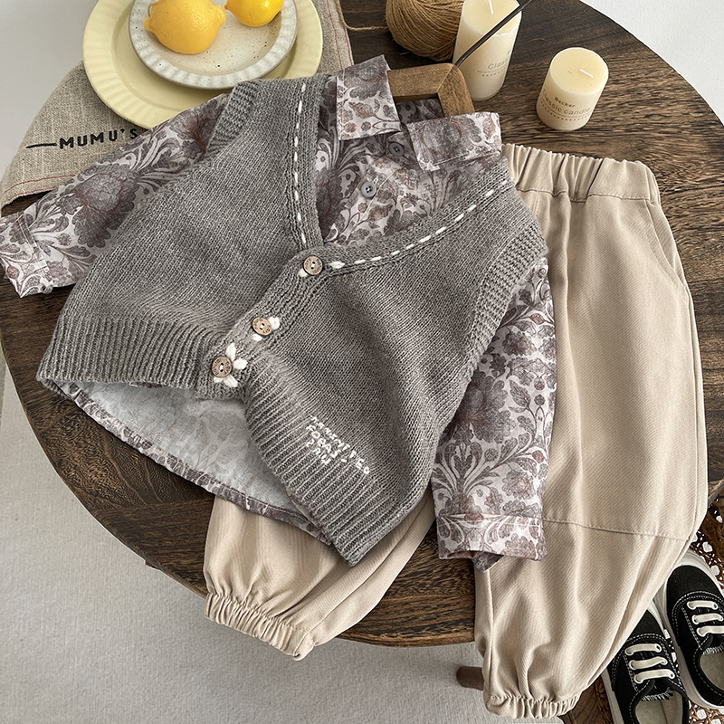소년 정장 봄과 가을 새로운 캐주얼 패션 꽃무늬 셔츠 스웨터 카디건 3피스 세트 아동 봄과 가을 의류 트렌드