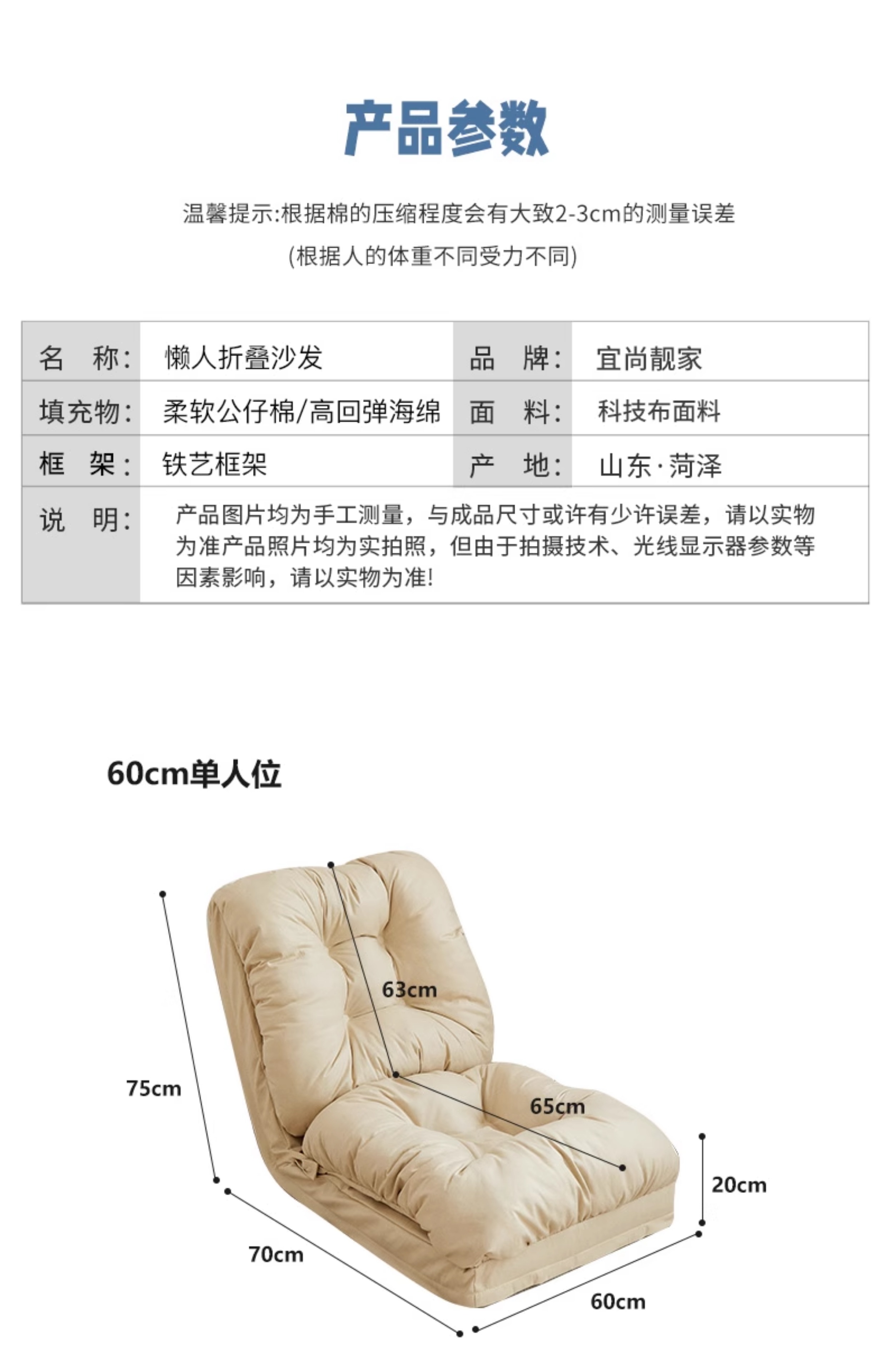 • 米白色60CM+五档扶手【升级防水科技布料】