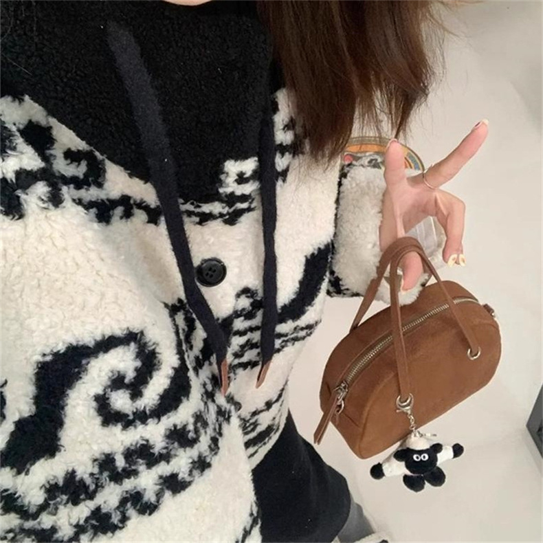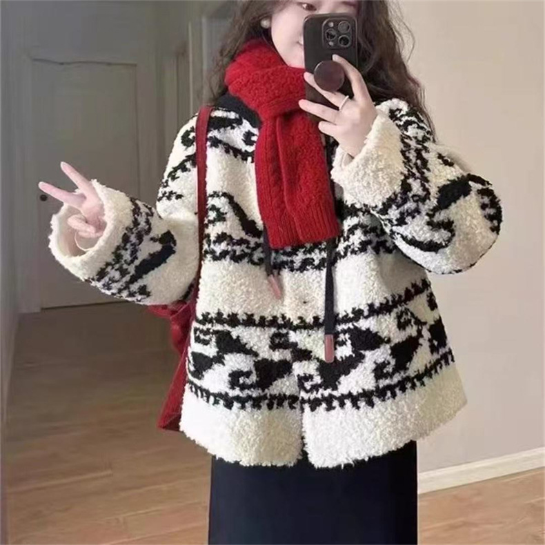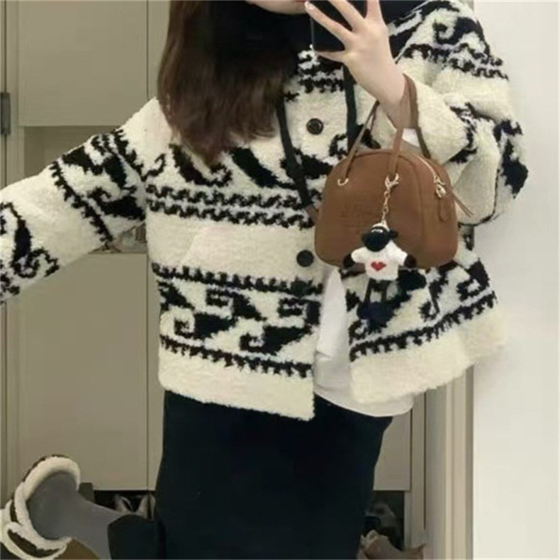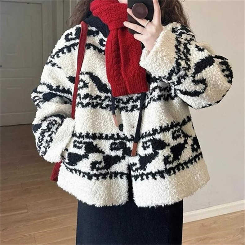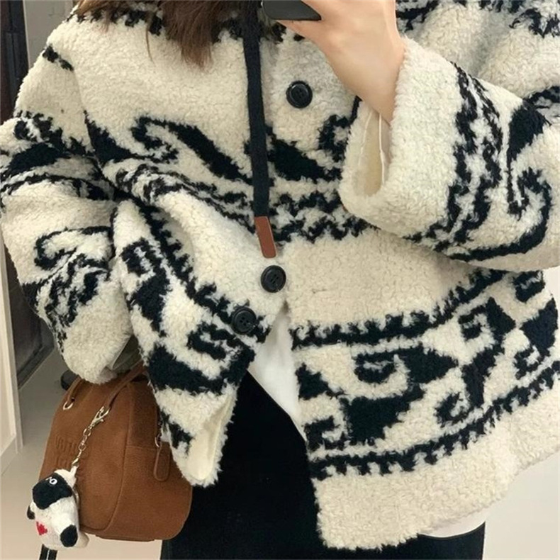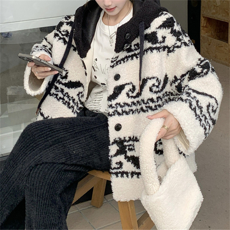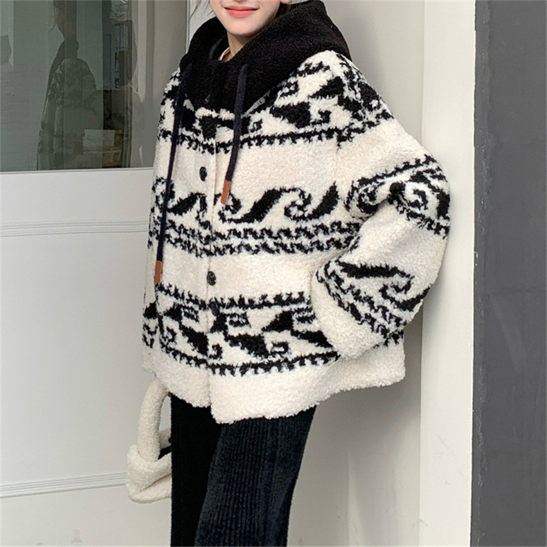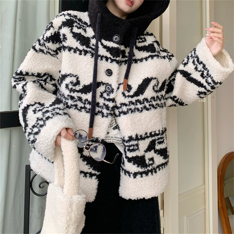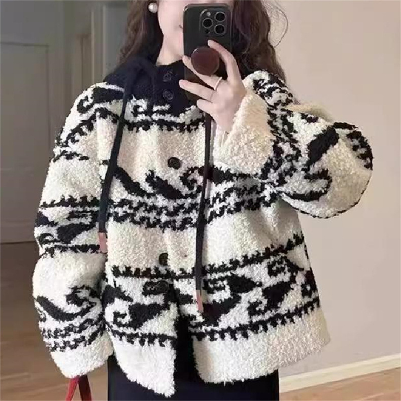 디자인 중공업 자카드 대비 색상 가을, 겨울 새로운 긴팔 느슨한 후드 자켓 니트 카디건 스웨터 여성상의스토어 가기