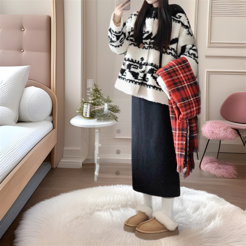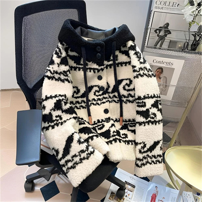 디자인 중공업 자카드 대비 색상 가을, 겨울 새로운 긴팔 느슨한 후드 자켓 니트 카디건 스웨터 여성상의