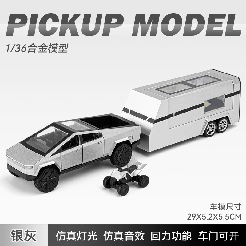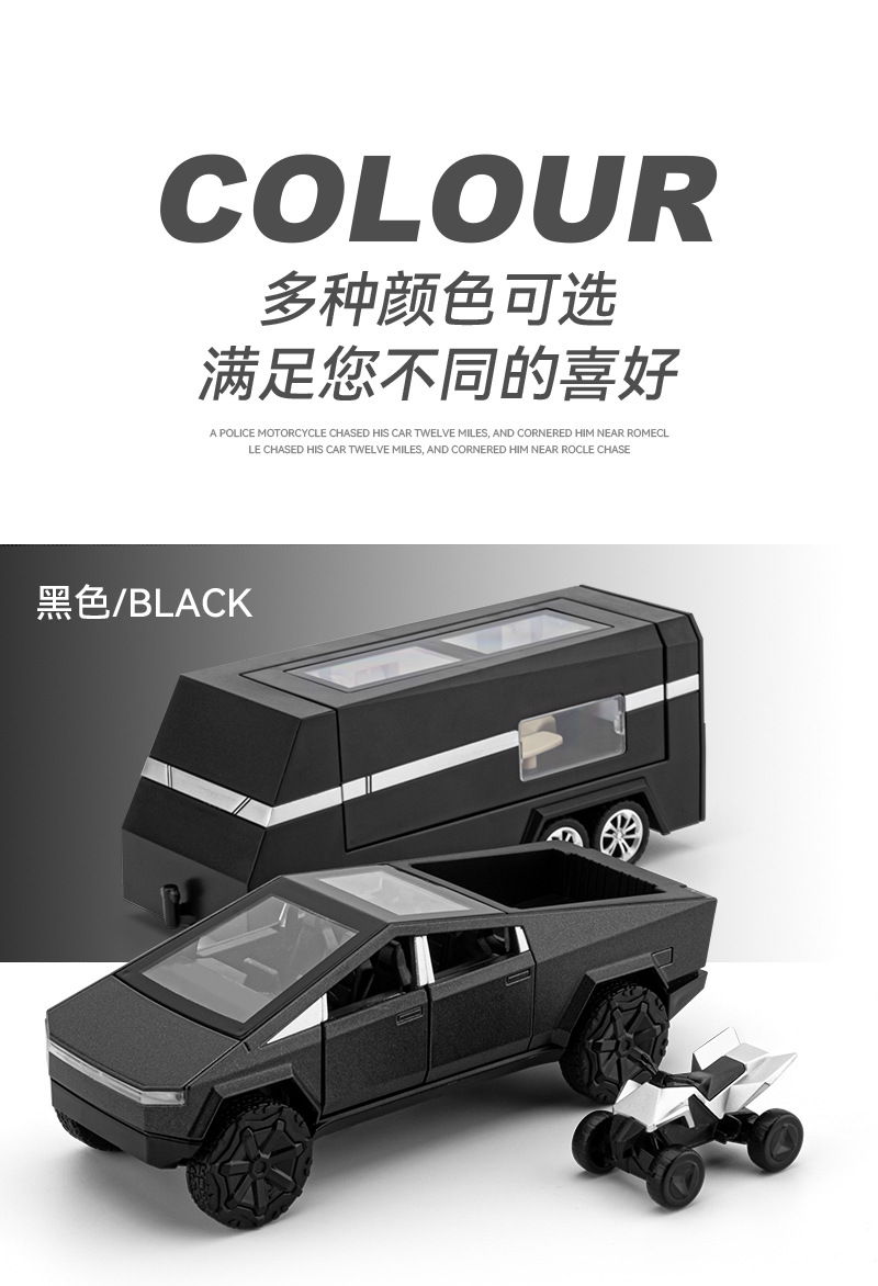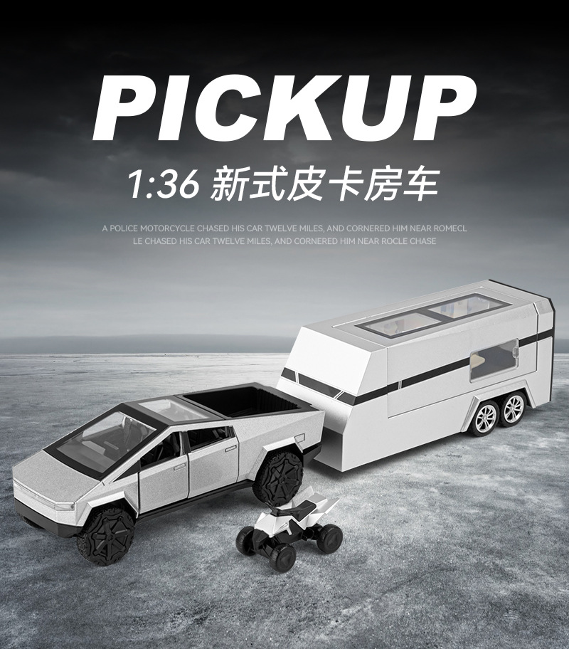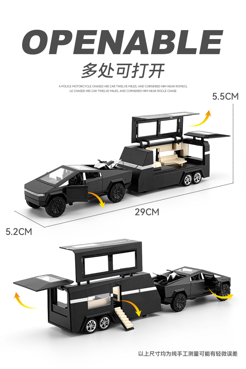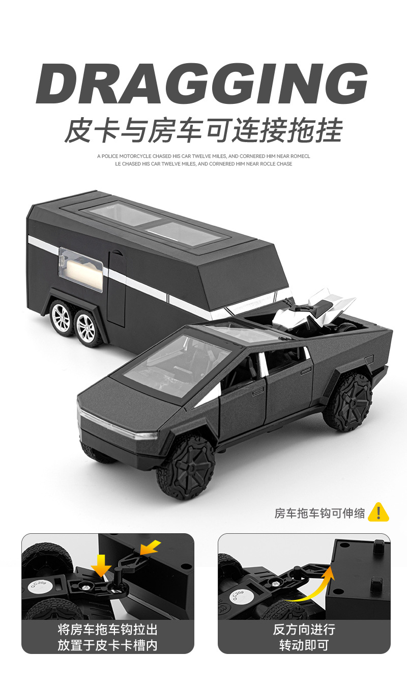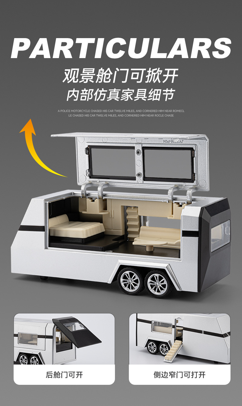 观景舱门可掀开;皮卡与房车可链接拖挂;皮卡后斗可放置摩托车(摩托车可滑行);五开门,高仿真灯光音效(按压前轮触发灯光音效);